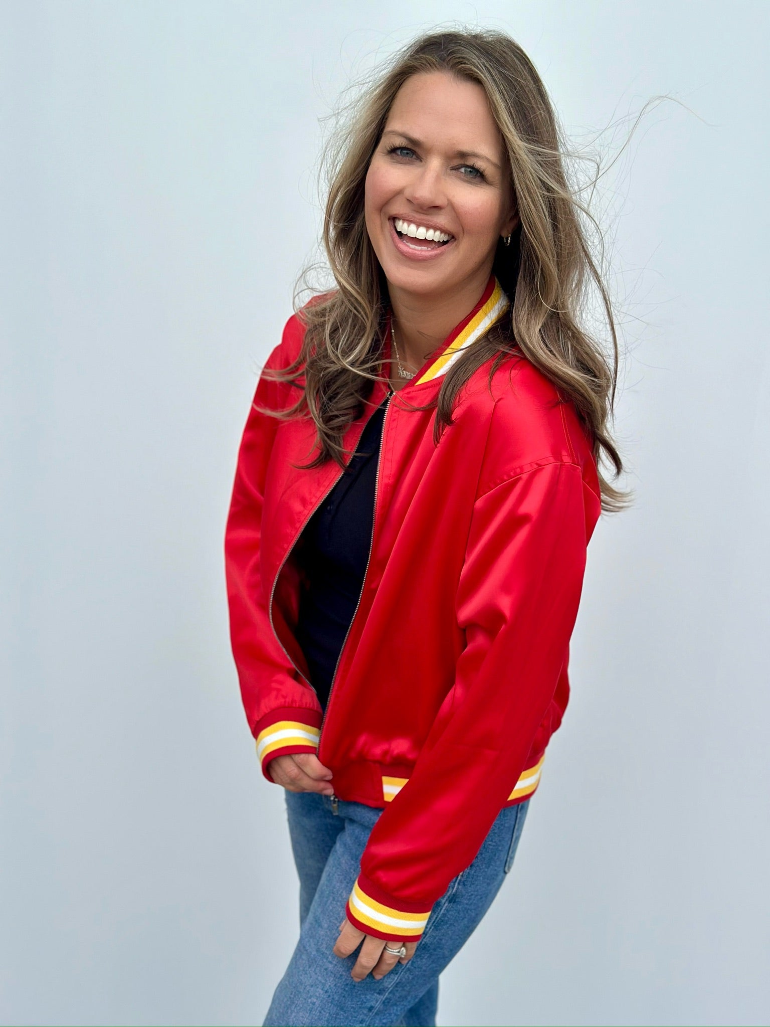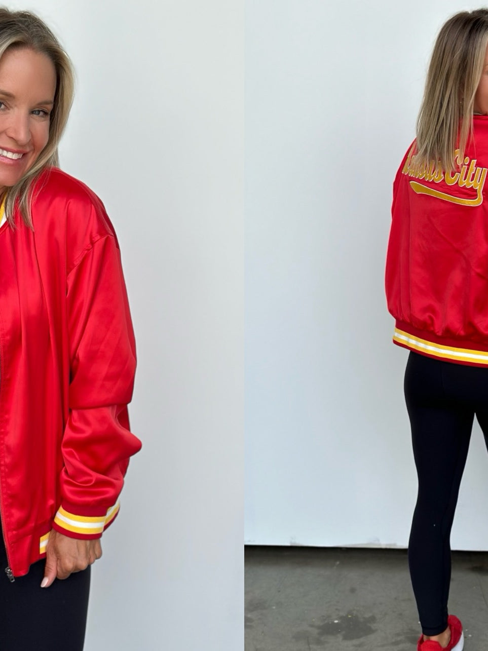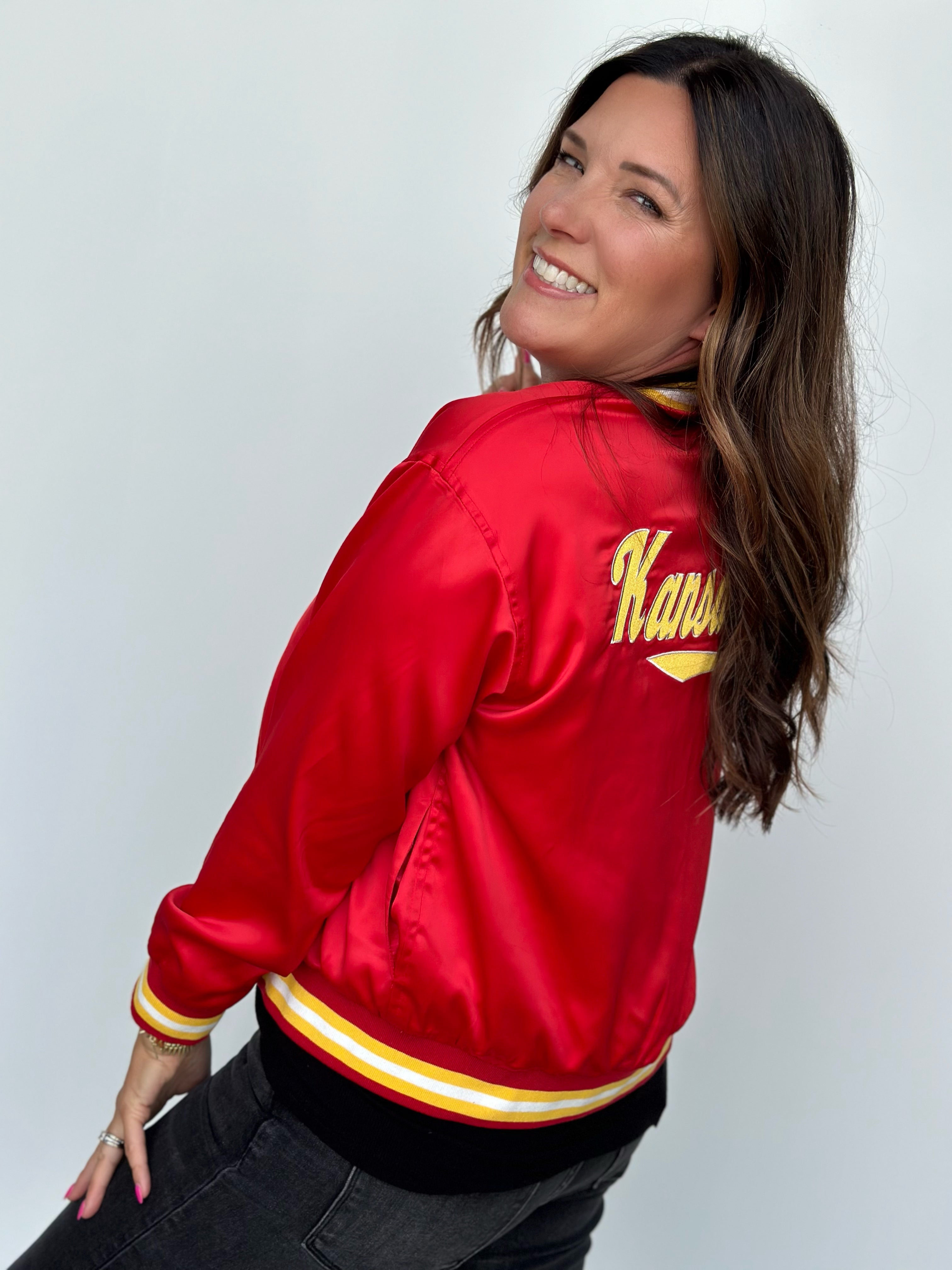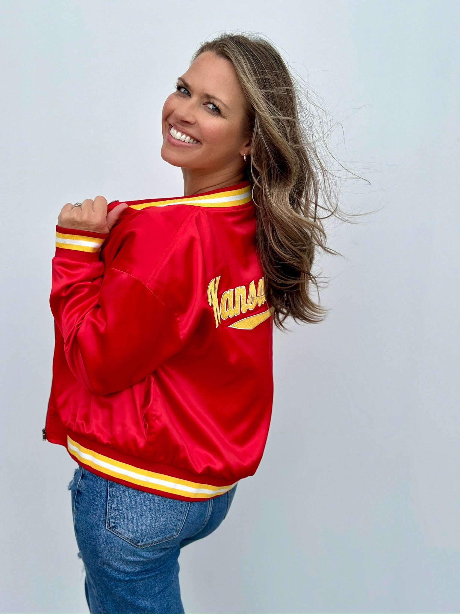 This oversized button-up cardi brings that vintage varsity vibe with a bold KC twist. Made in a vibrant game-day red with gold and white striping on the sleeves and hem, it features a detailed embroidered helmet patch on the front and “Kansas City” across the back for the ultimate fan finish.