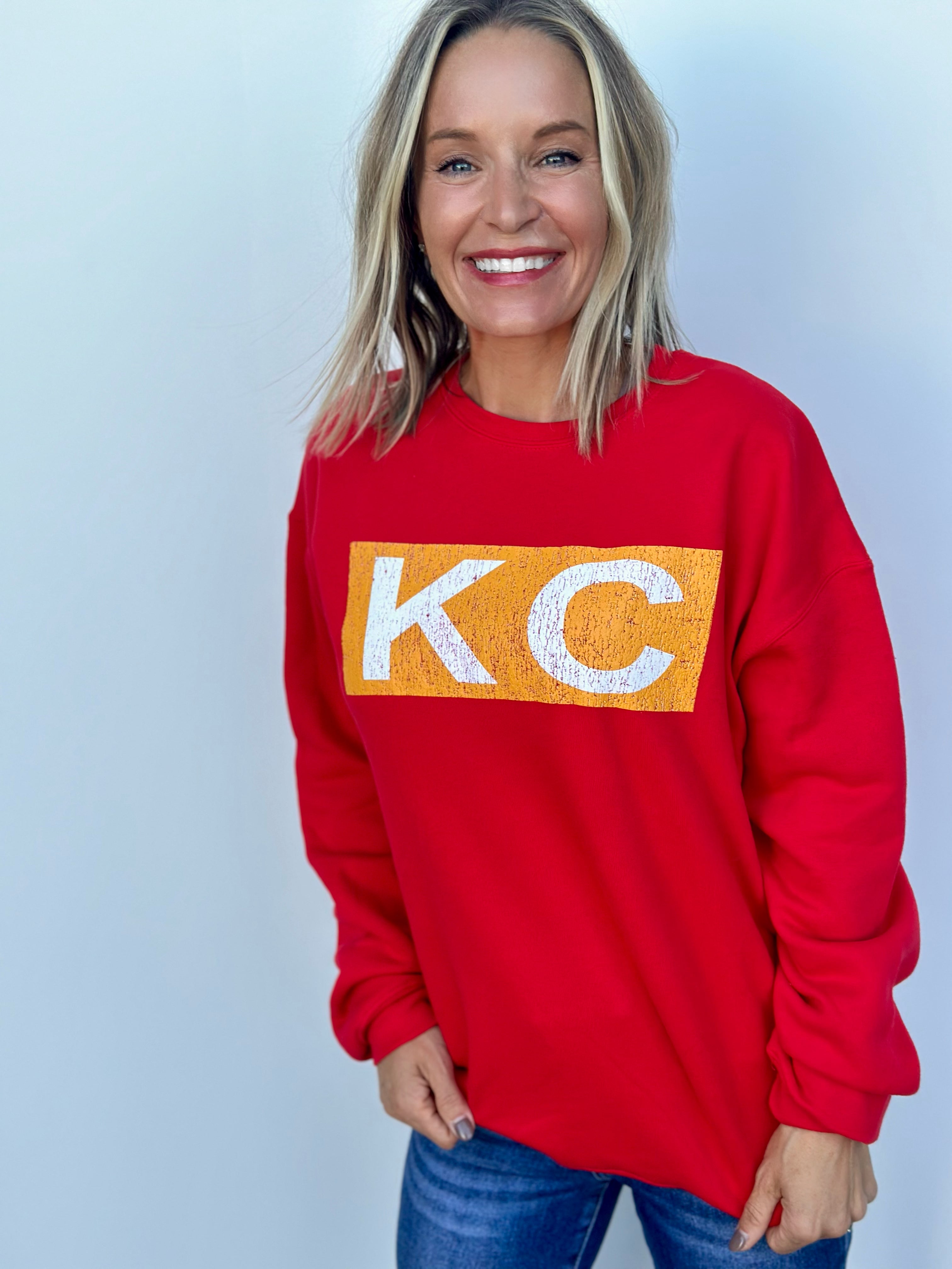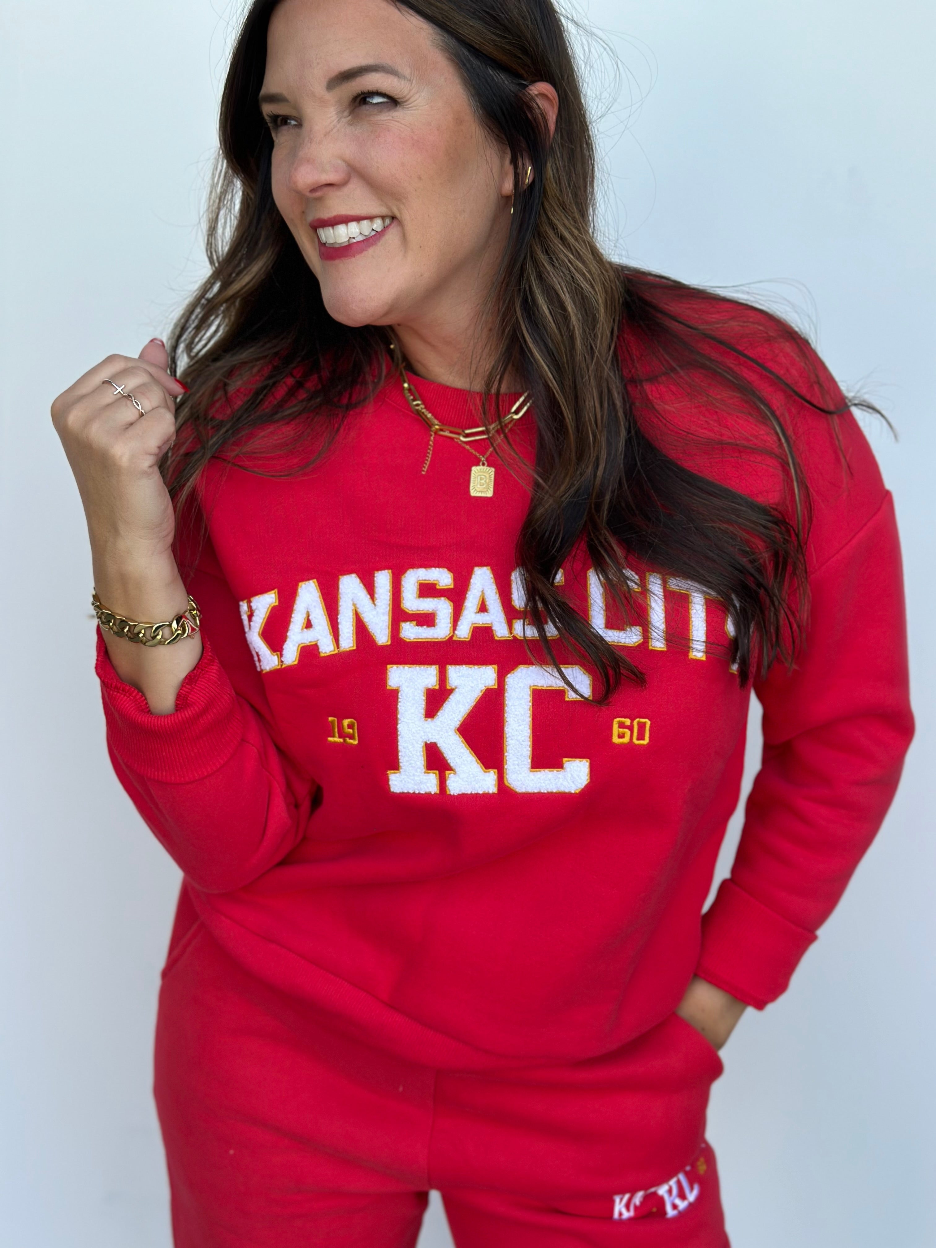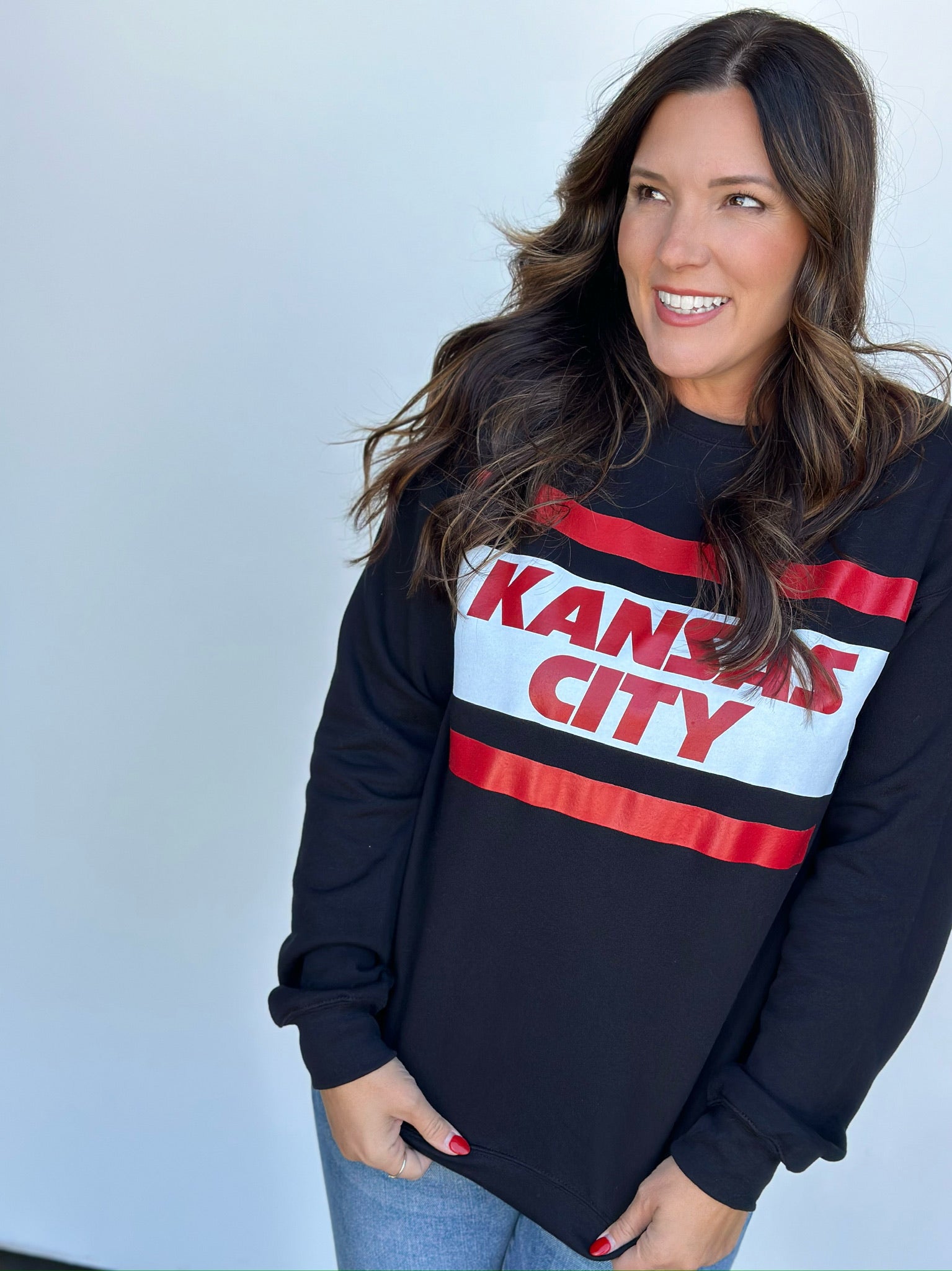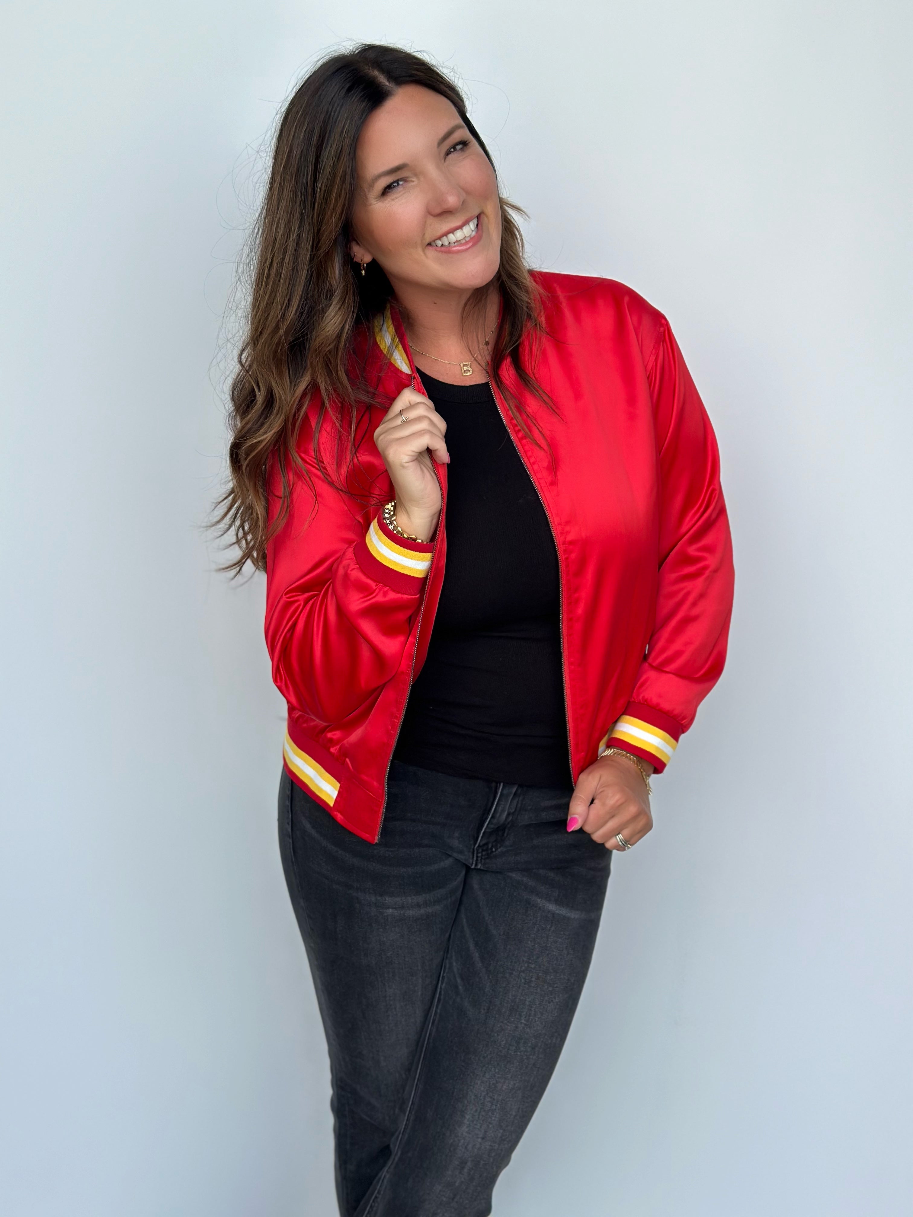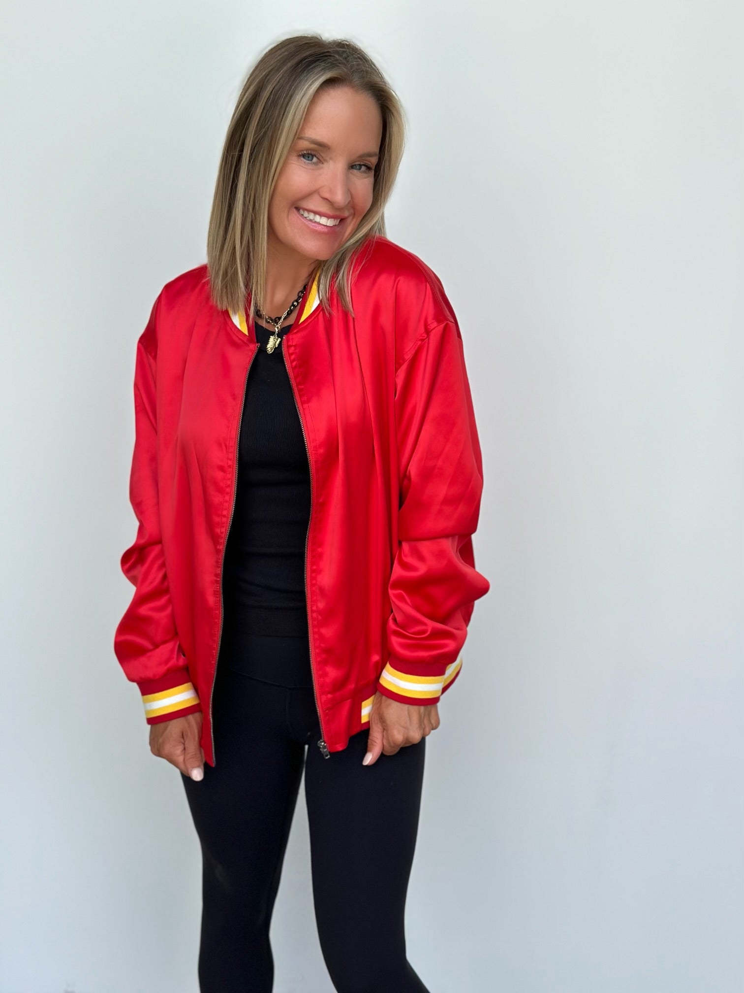 This oversized button-up cardi brings that vintage varsity vibe with a bold KC twist. Made in a vibrant game-day red with gold and white striping on the sleeves and hem, it features a detailed embroidered helmet patch on the front and “Kansas City” across the back for the ultimate fan finish.