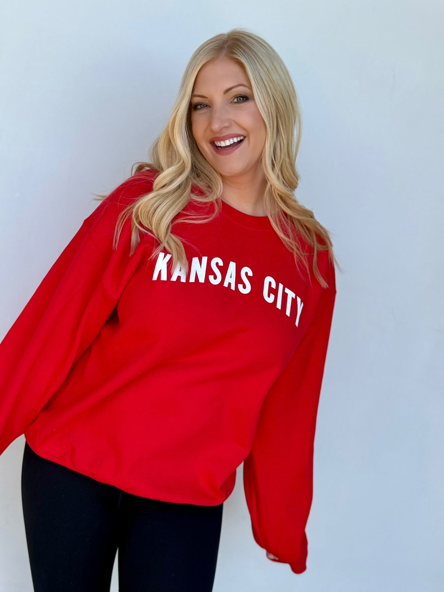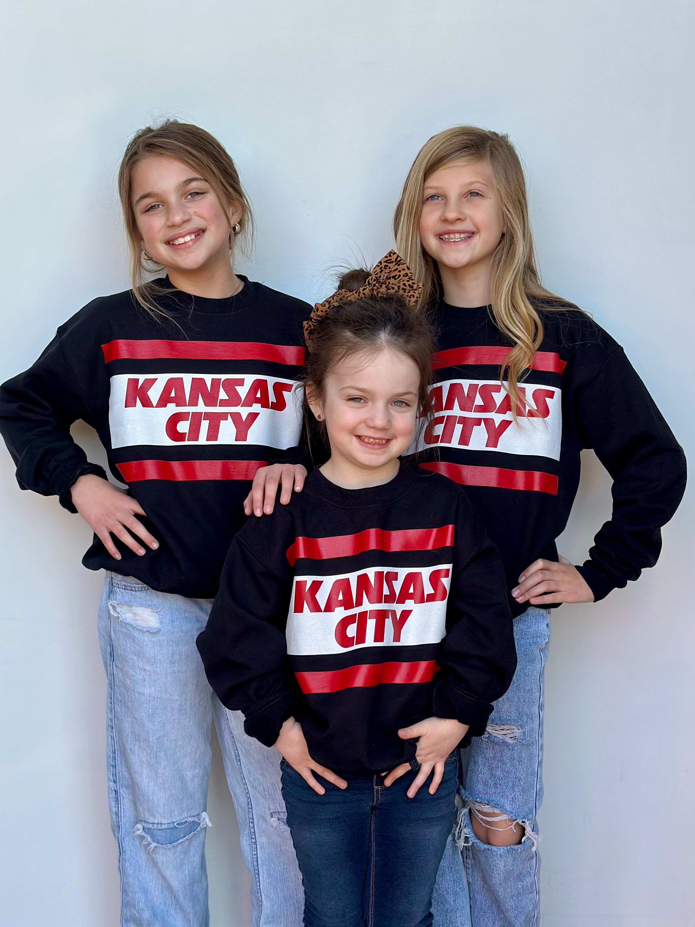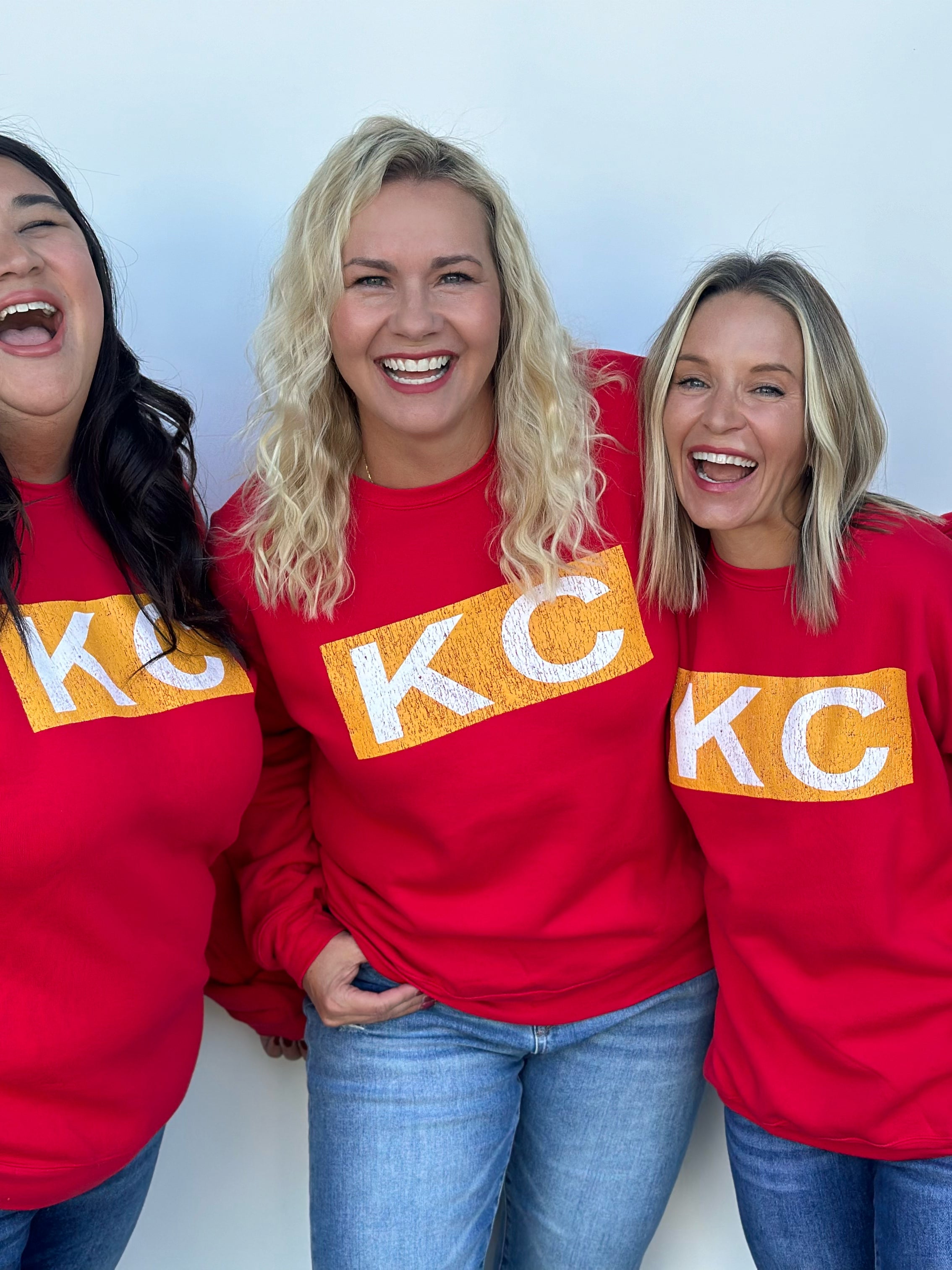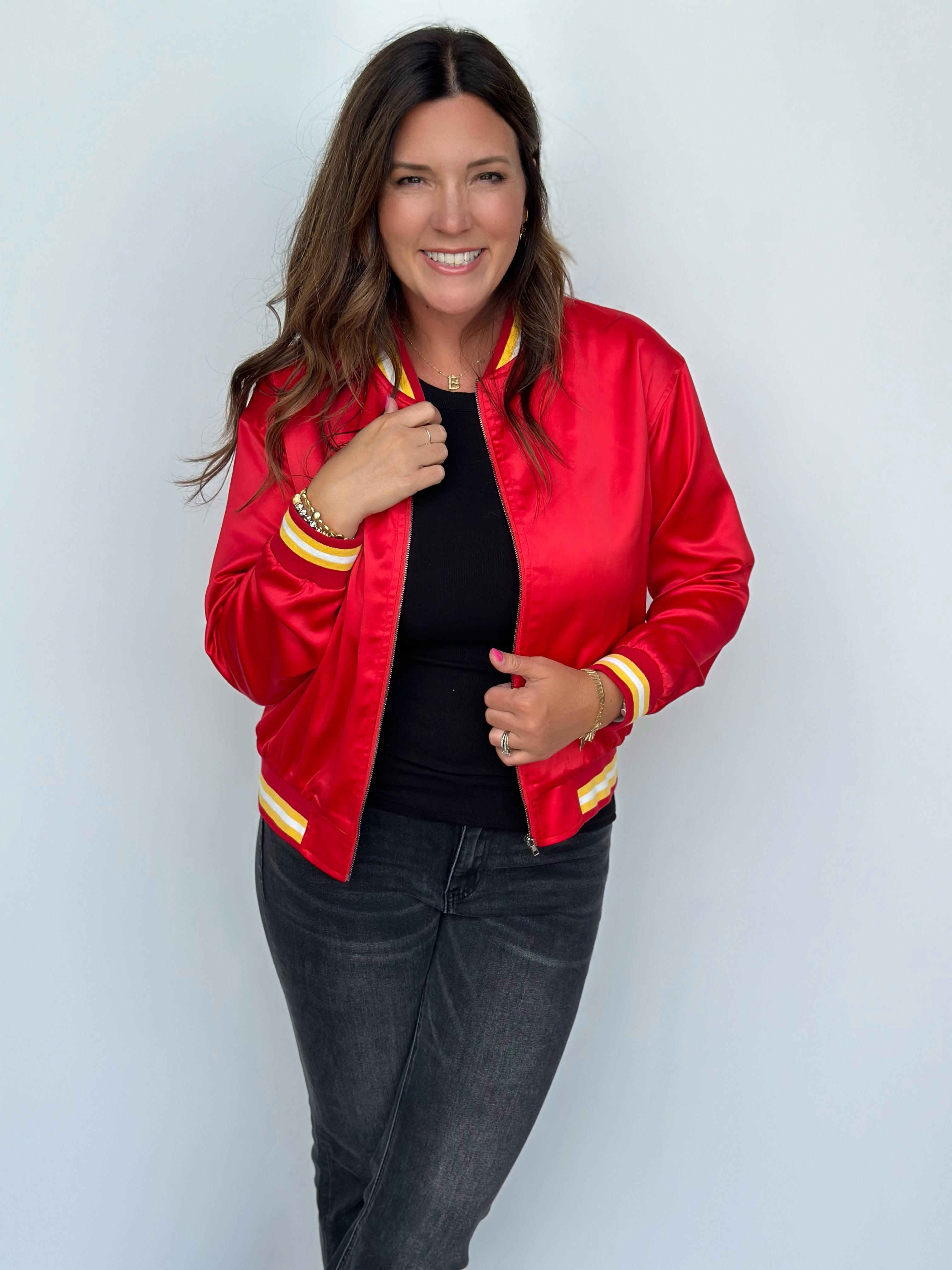 This oversized button-up cardi brings that vintage varsity vibe with a bold KC twist. Made in a vibrant game-day red with gold and white striping on the sleeves and hem, it features a detailed embroidered helmet patch on the front and “Kansas City” across the back for the ultimate fan finish.