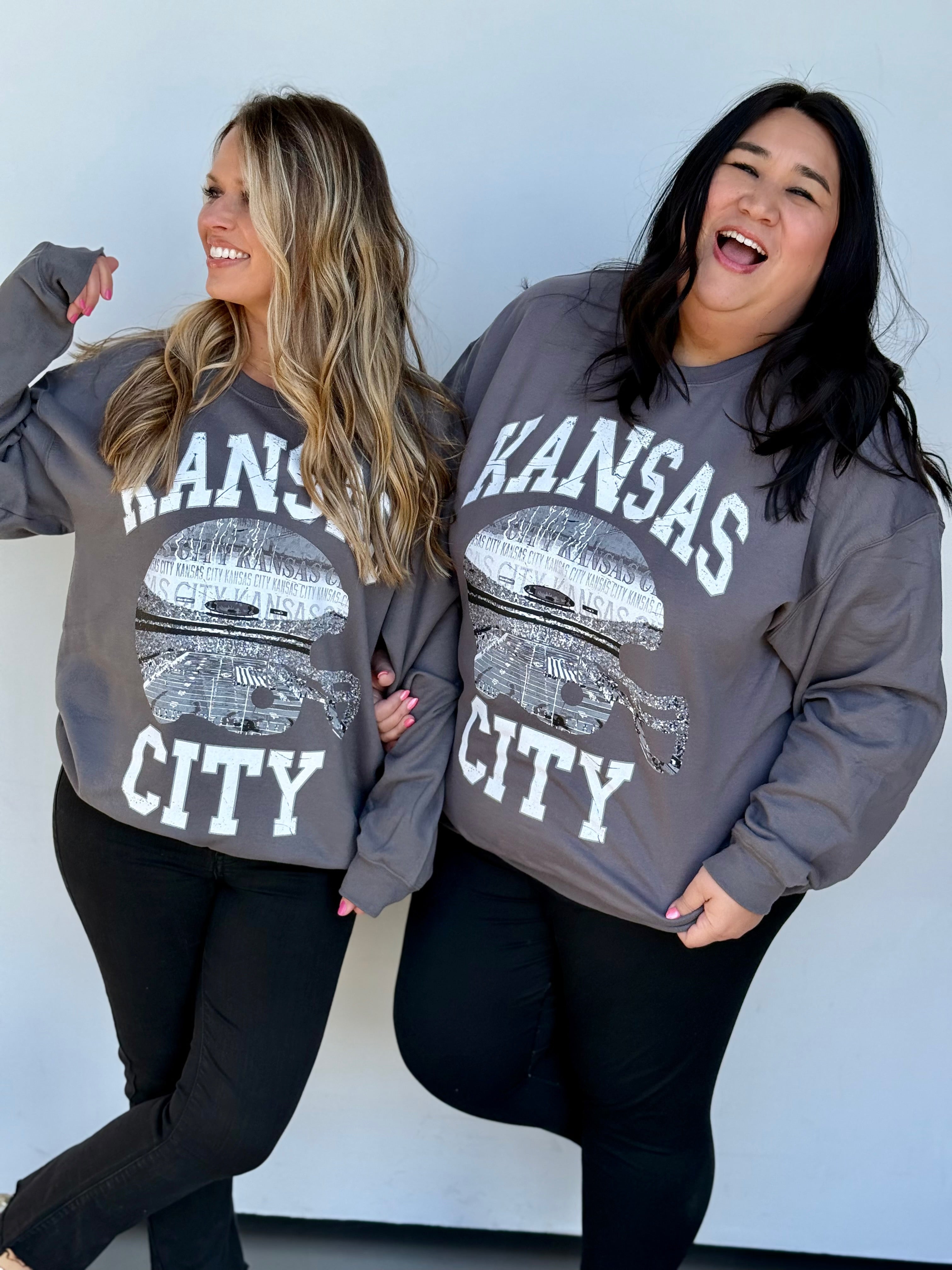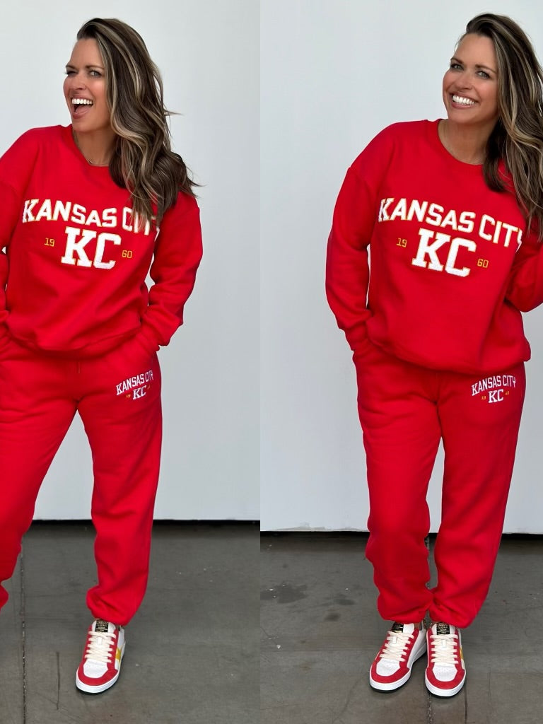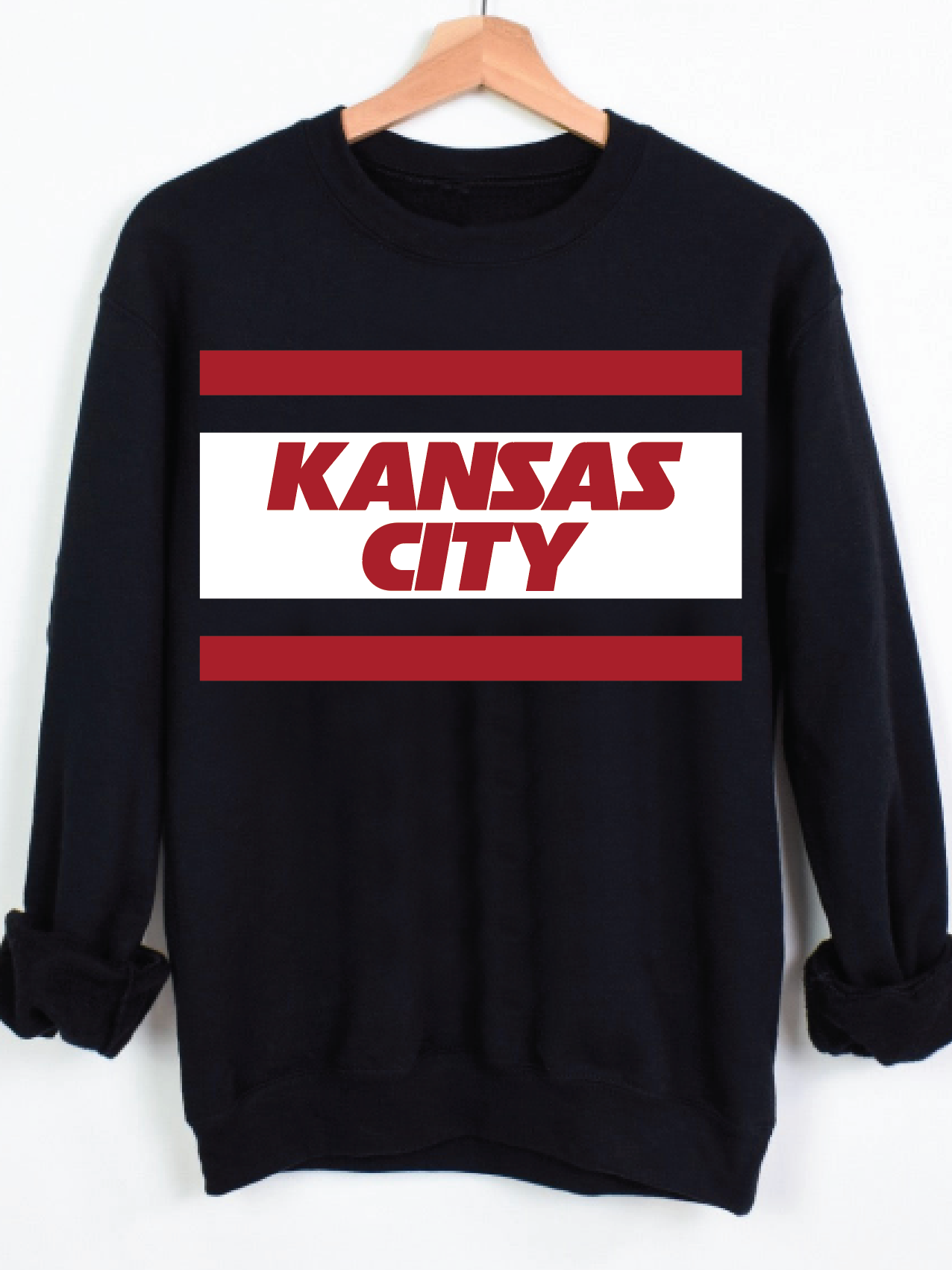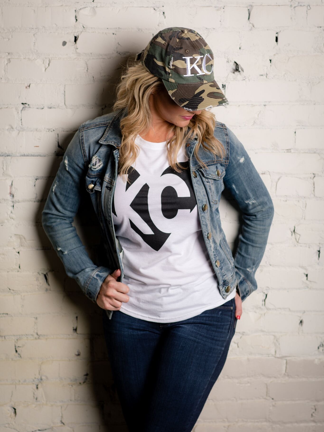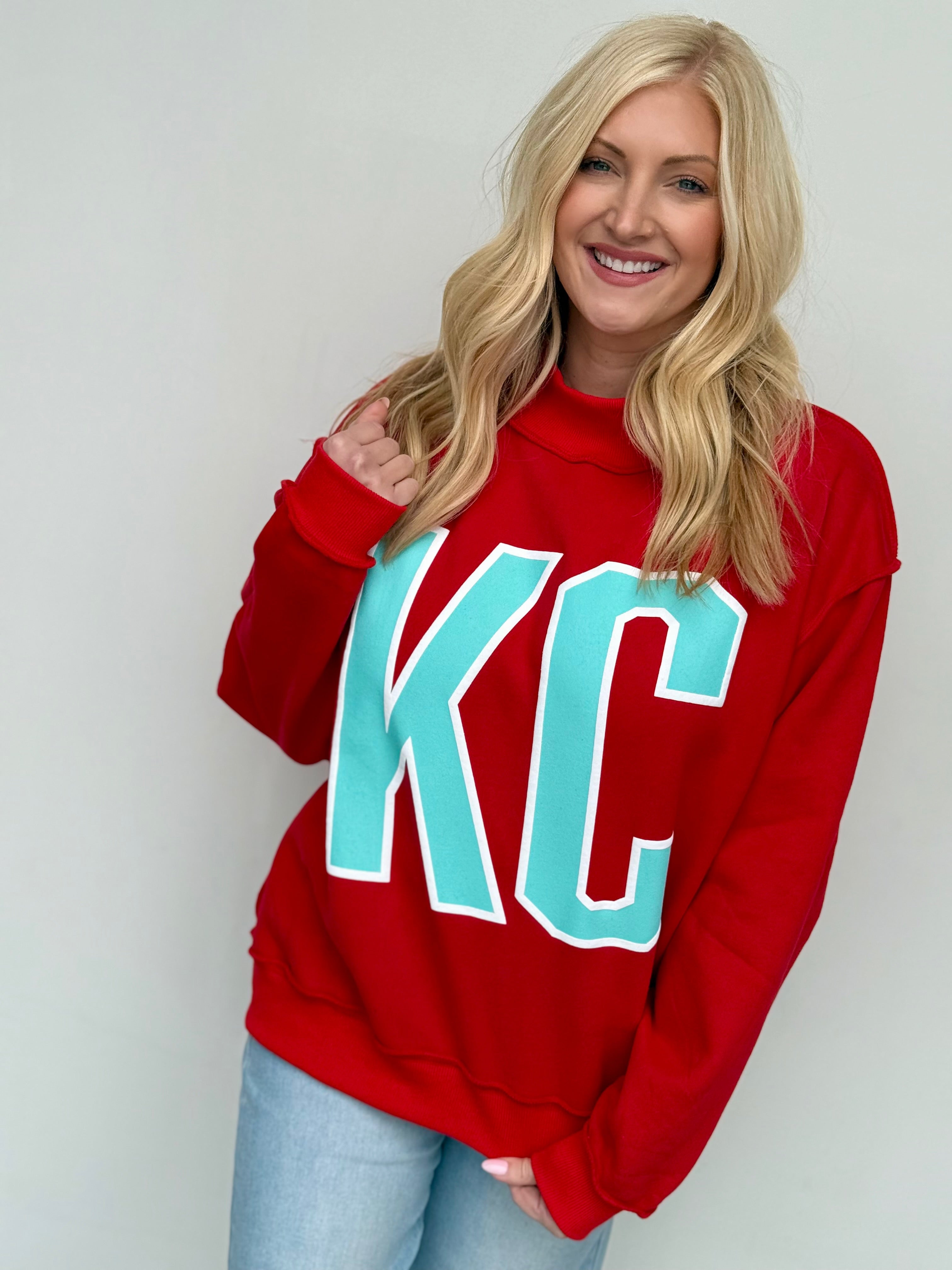 This oversized button-up cardi brings that vintage varsity vibe with a bold KC twist. Made in a vibrant game-day red with gold and white striping on the sleeves and hem, it features a detailed embroidered helmet patch on the front and “Kansas City” across the back for the ultimate fan finish.