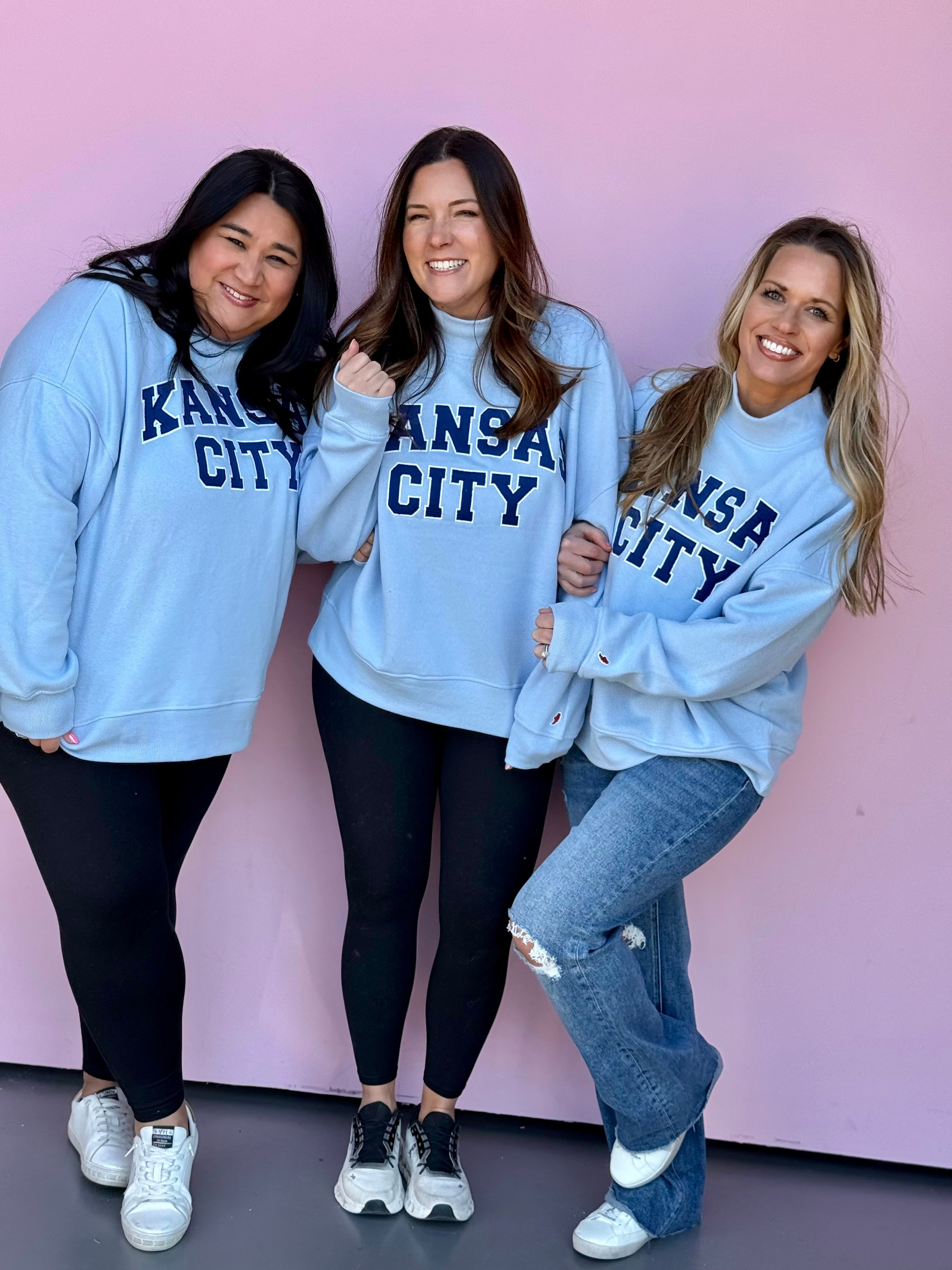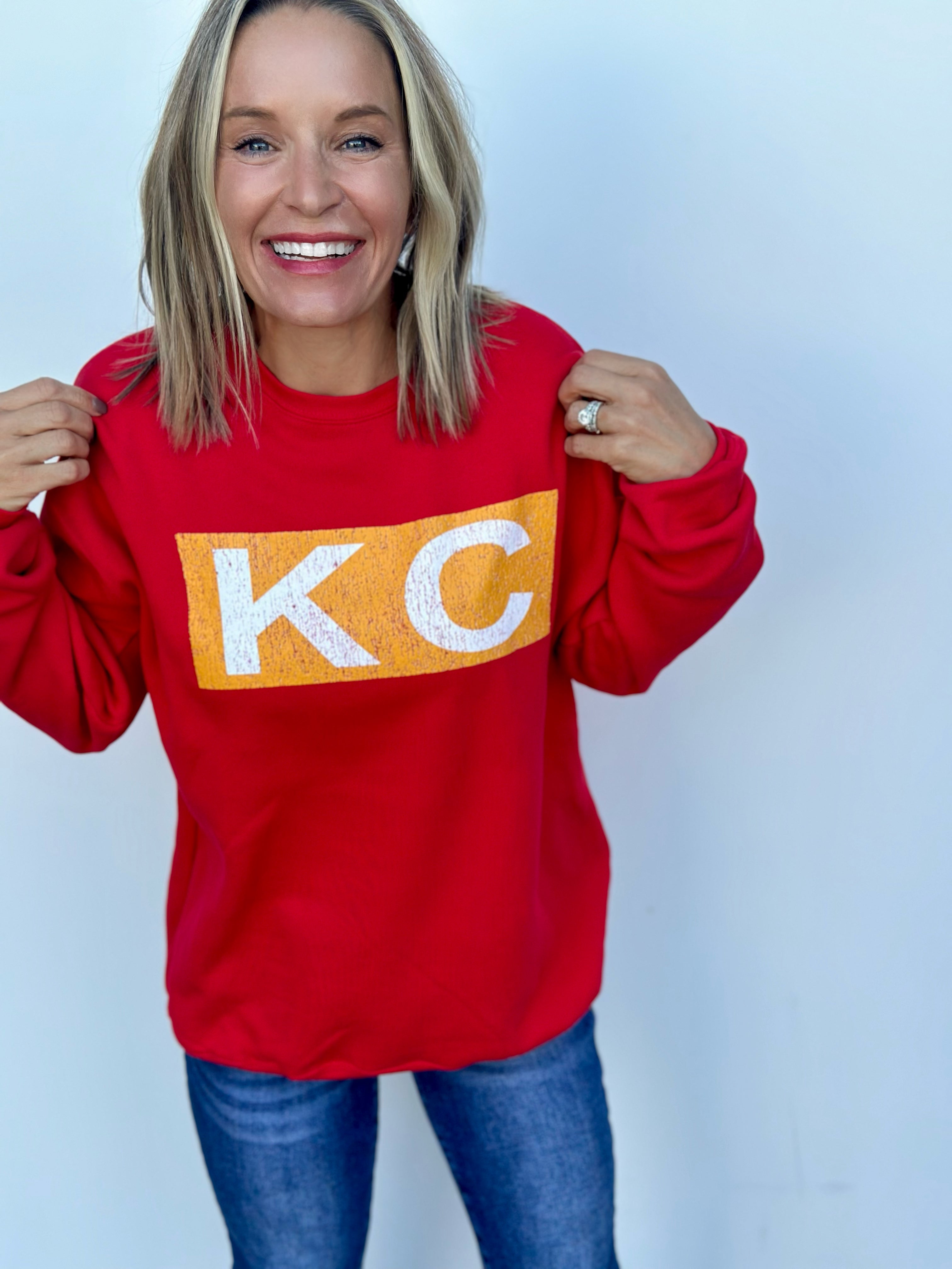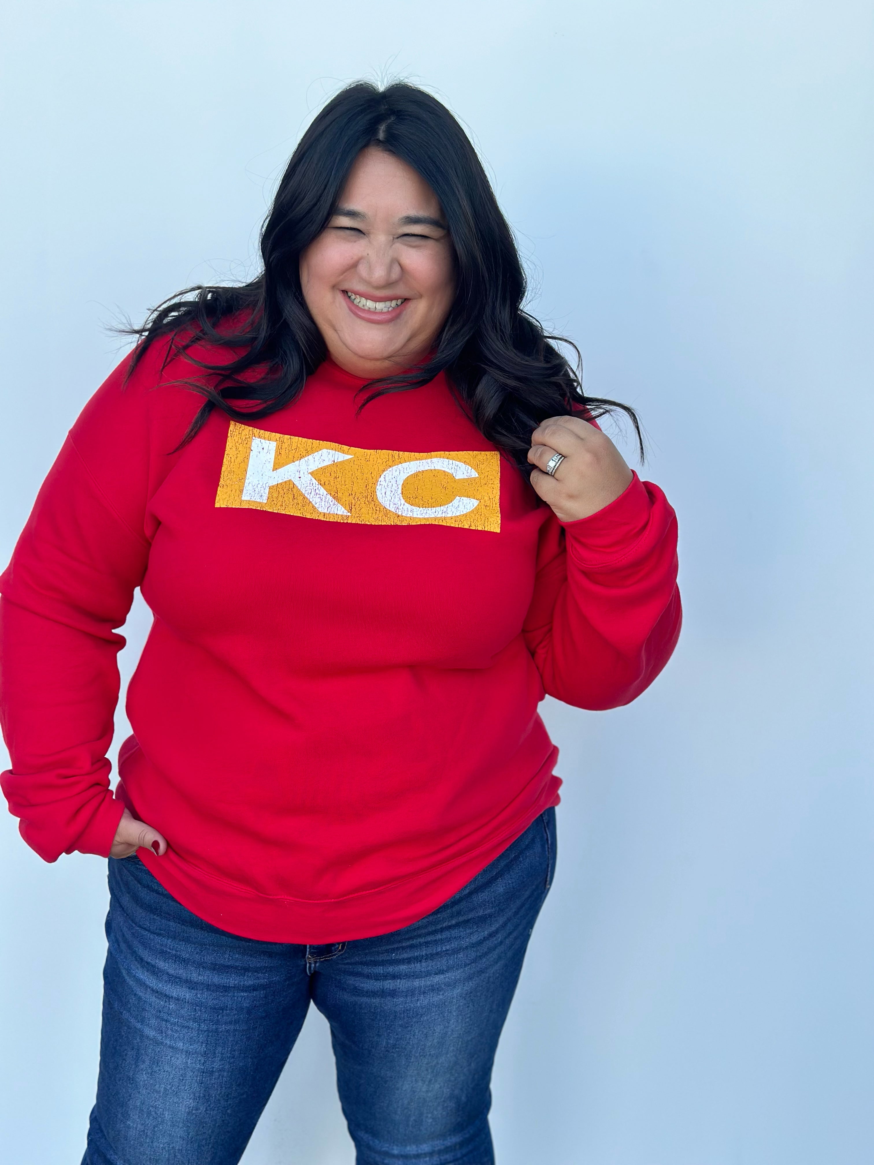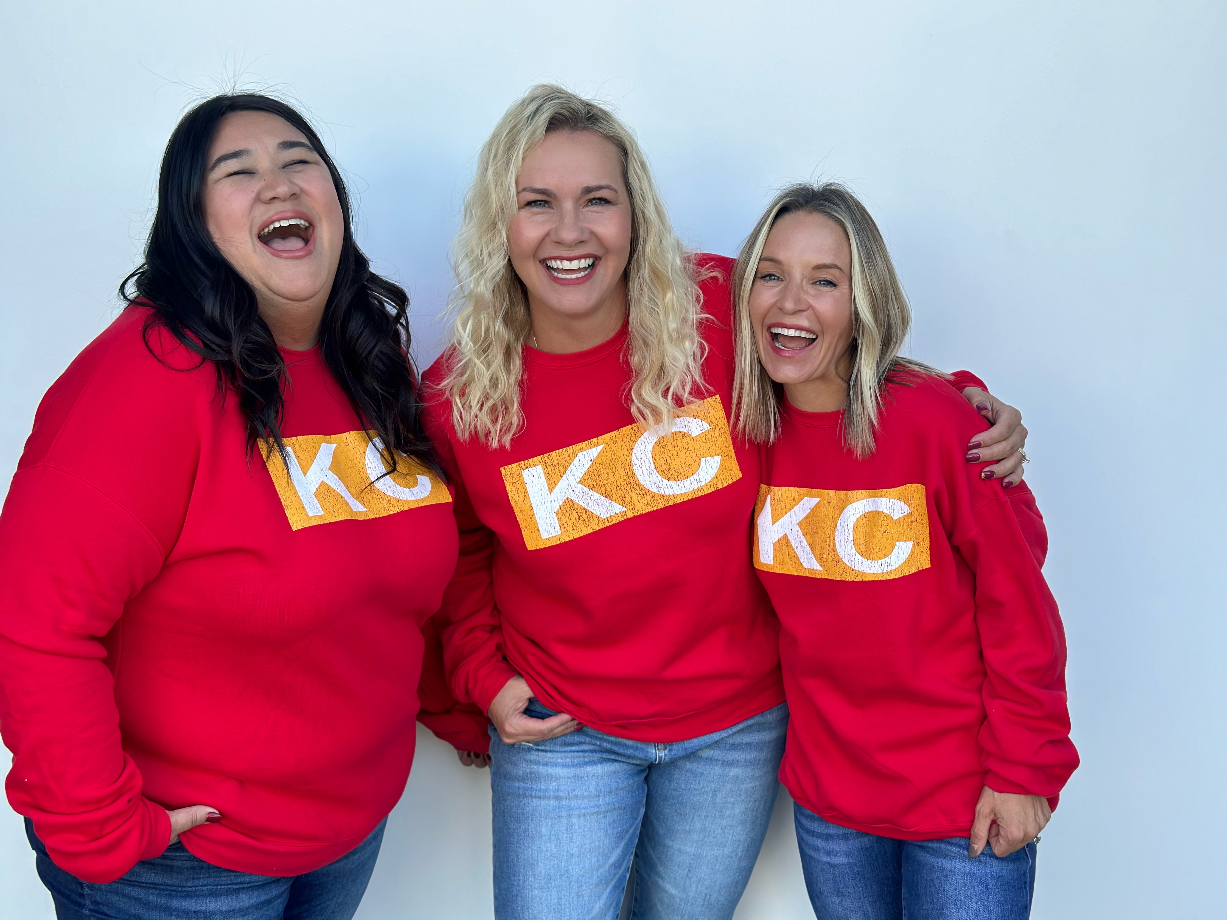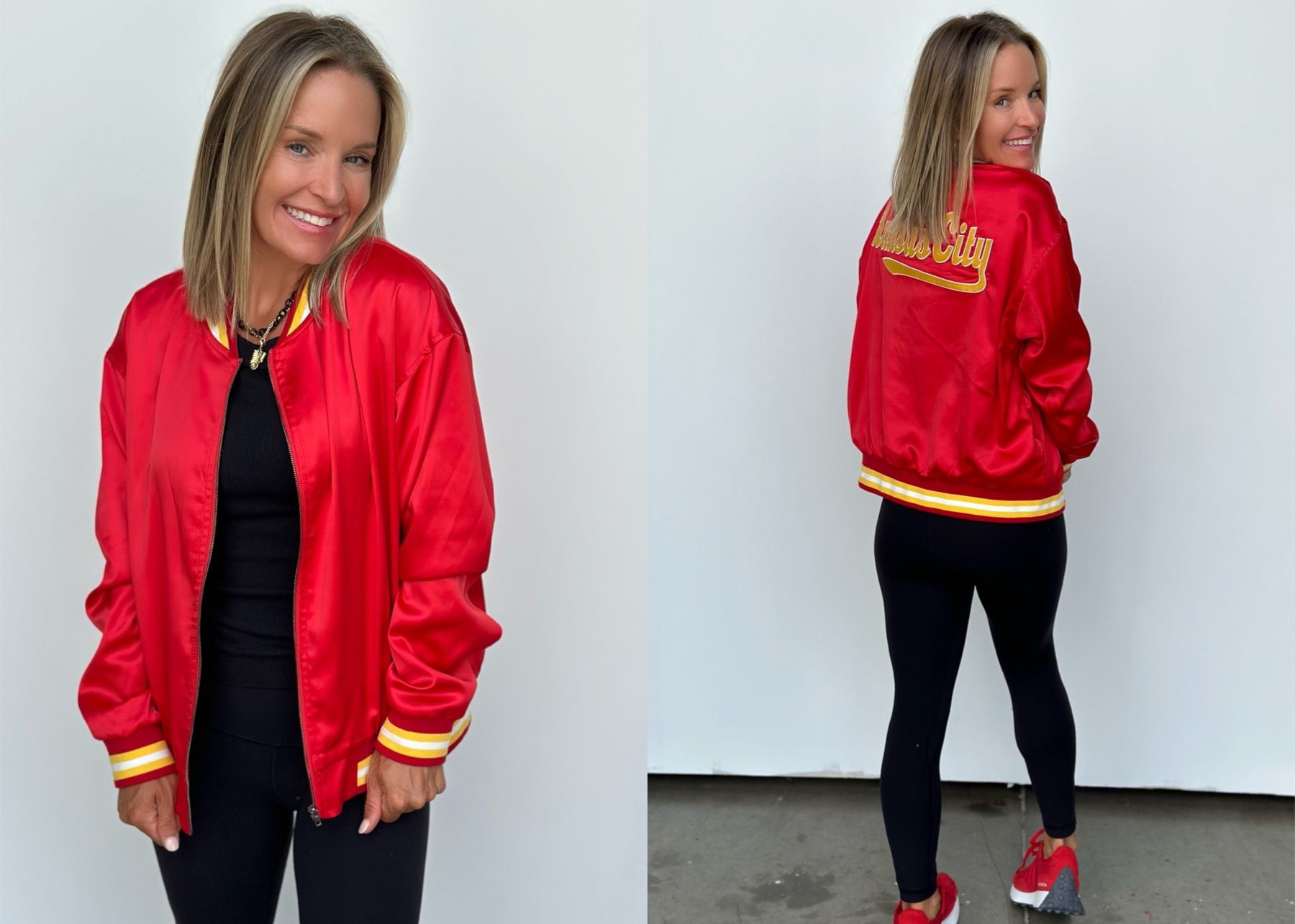 This oversized button-up cardi brings that vintage varsity vibe with a bold KC twist. Made in a vibrant game-day red with gold and white striping on the sleeves and hem, it features a detailed embroidered helmet patch on the front and “Kansas City” across the back for the ultimate fan finish.