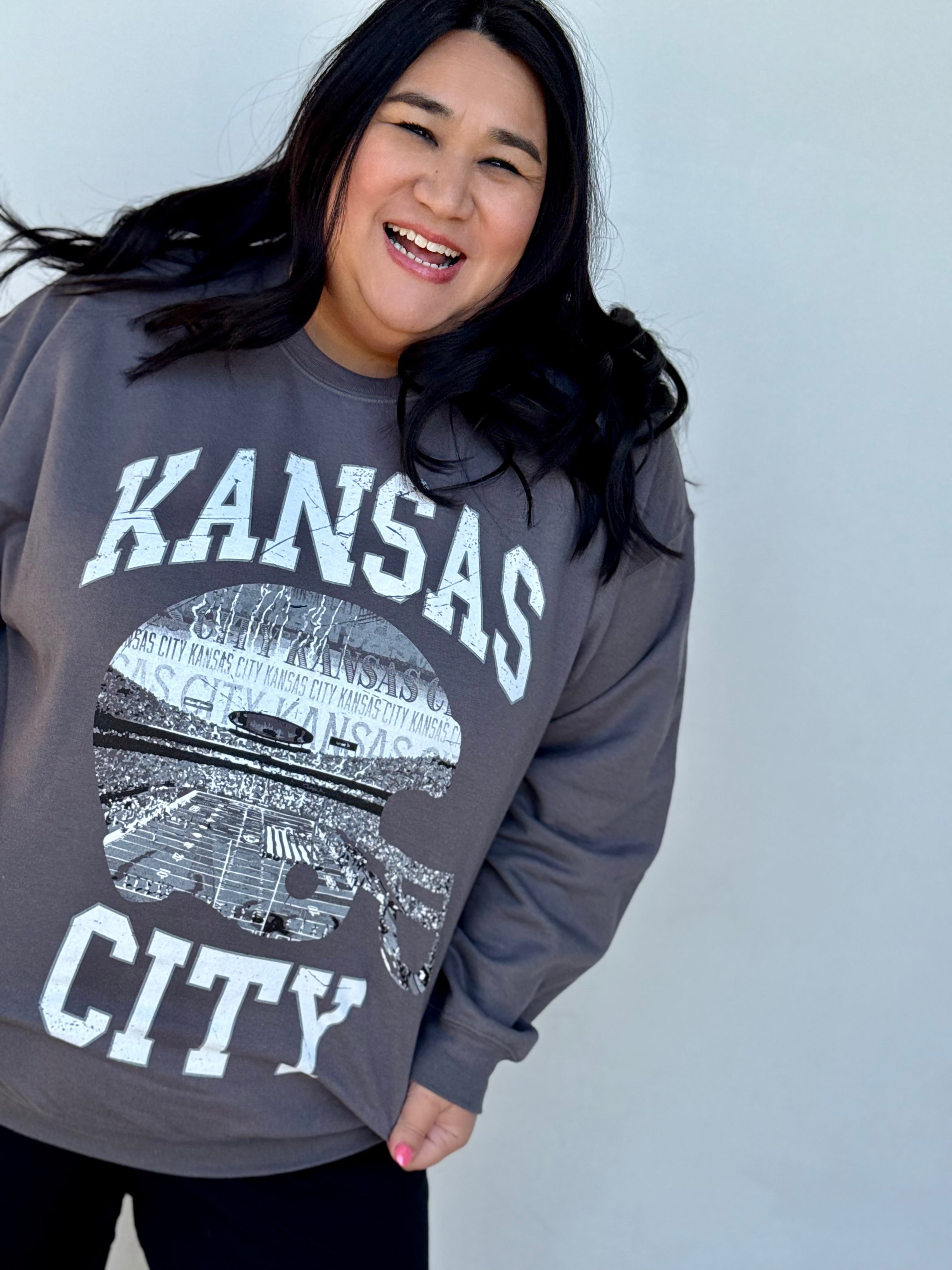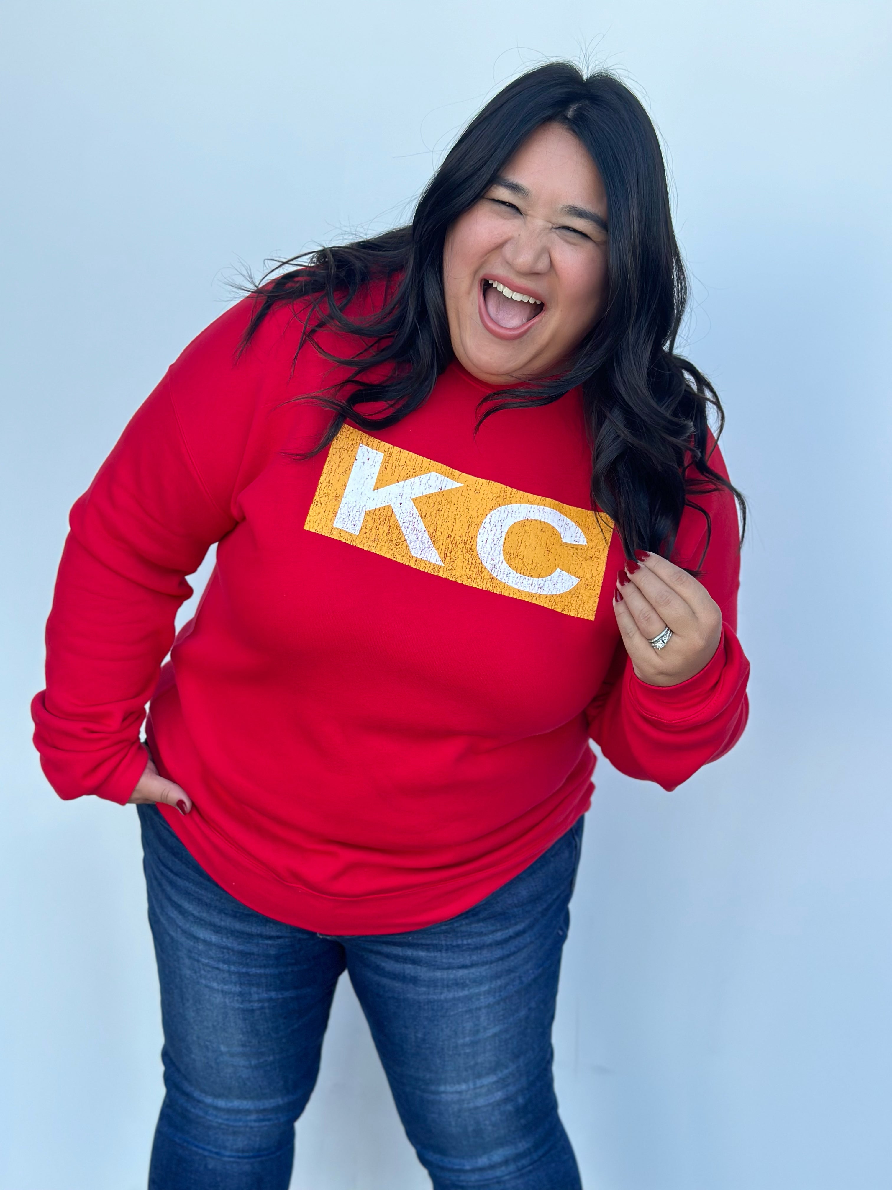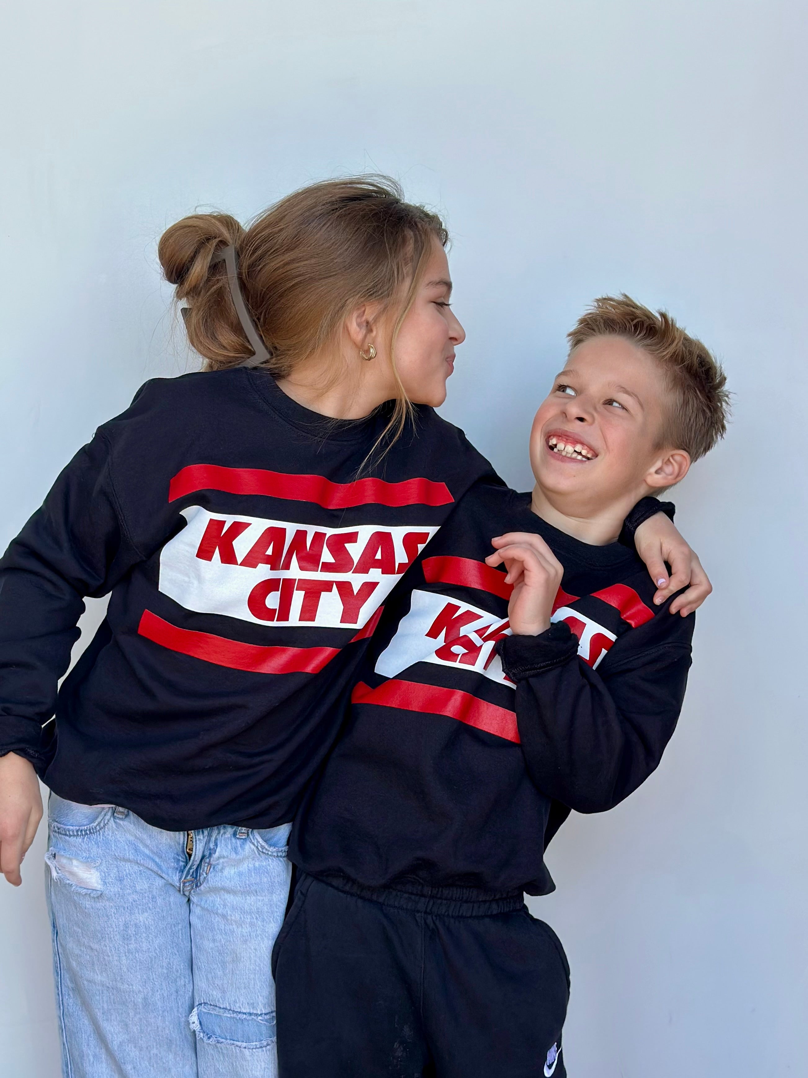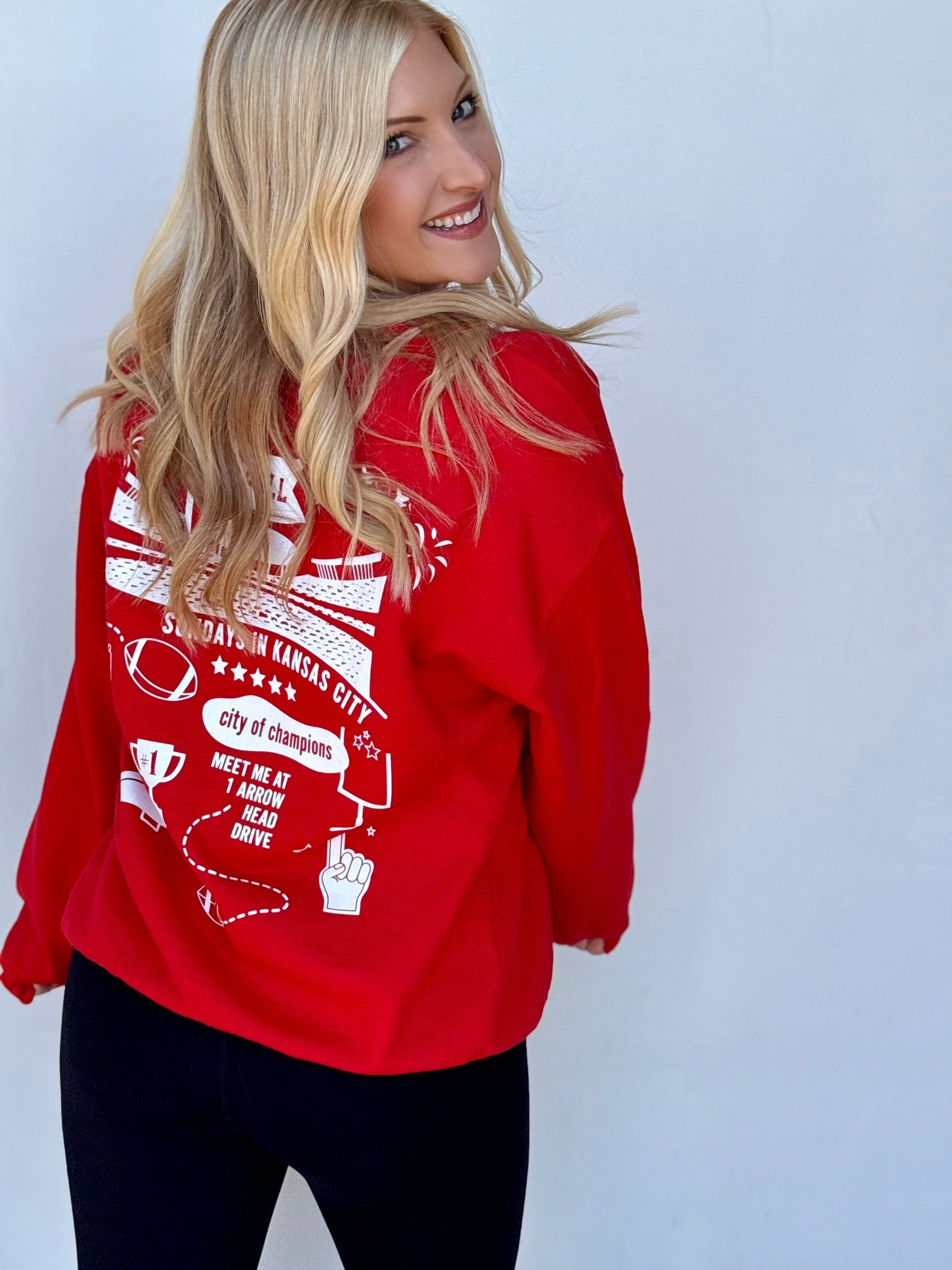 This oversized button-up cardi brings that vintage varsity vibe with a bold KC twist. Made in a vibrant game-day red with gold and white striping on the sleeves and hem, it features a detailed embroidered helmet patch on the front and “Kansas City” across the back for the ultimate fan finish.