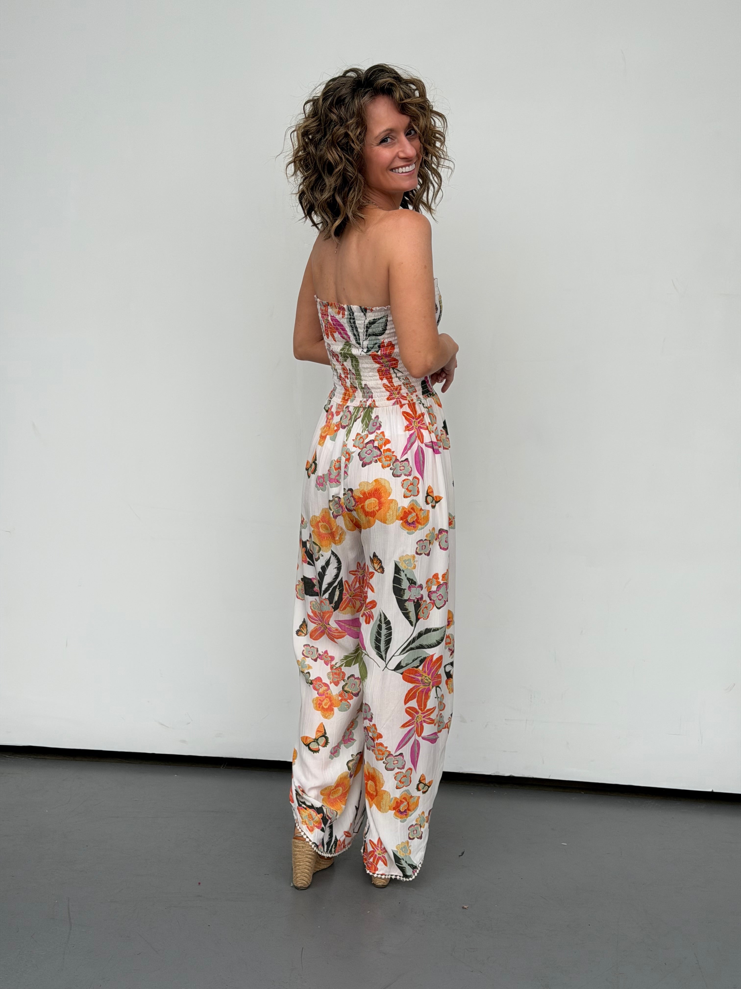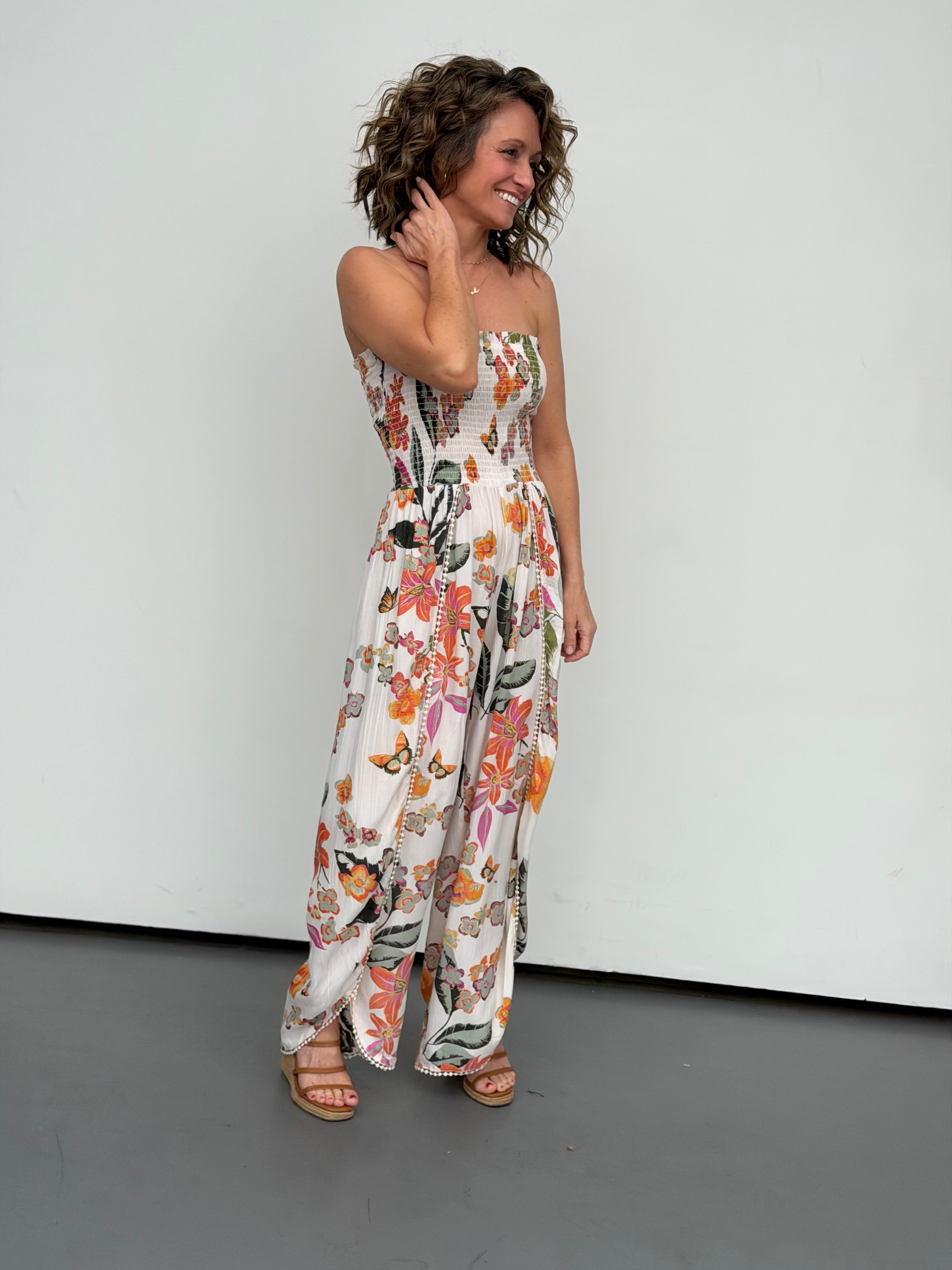 Effortless and breezy, this strapless romper features an elastic top for a comfortable fit and lightweight, flowy fabric perfect for warm-weather days. Side slits on the legs add movement and style, while the relaxed silhouette keeps you cool. We recommend sizing up for optimal length. Ideal for beach trips, casual outings, or laid-back evenings.
