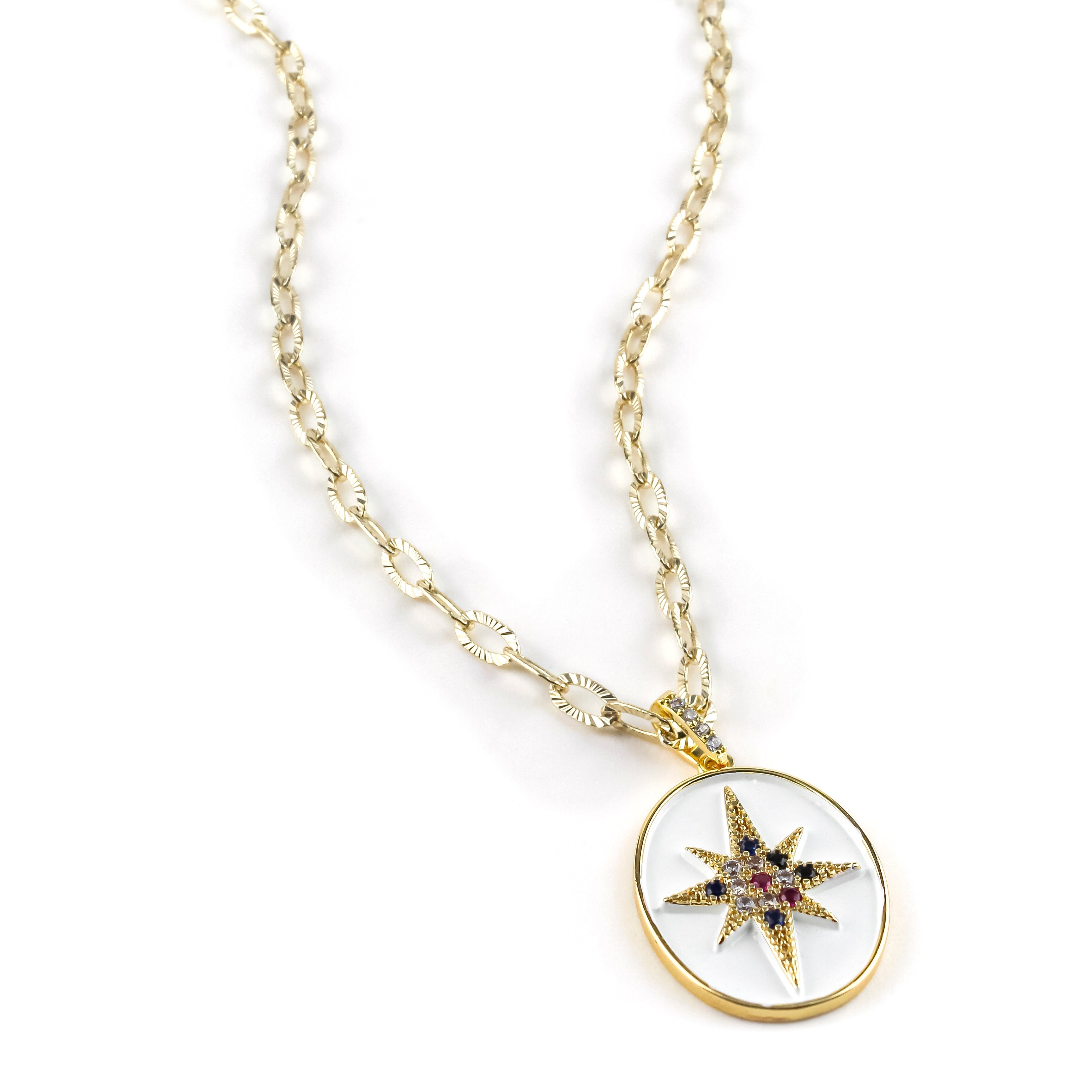 This Heather Necklace is making a star-studded statement! Made with a gold plated chain and a white enamel charm plus a starburst accent, it's sure to help you shine bright. Wear it and sparkle like the star you are!