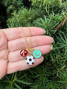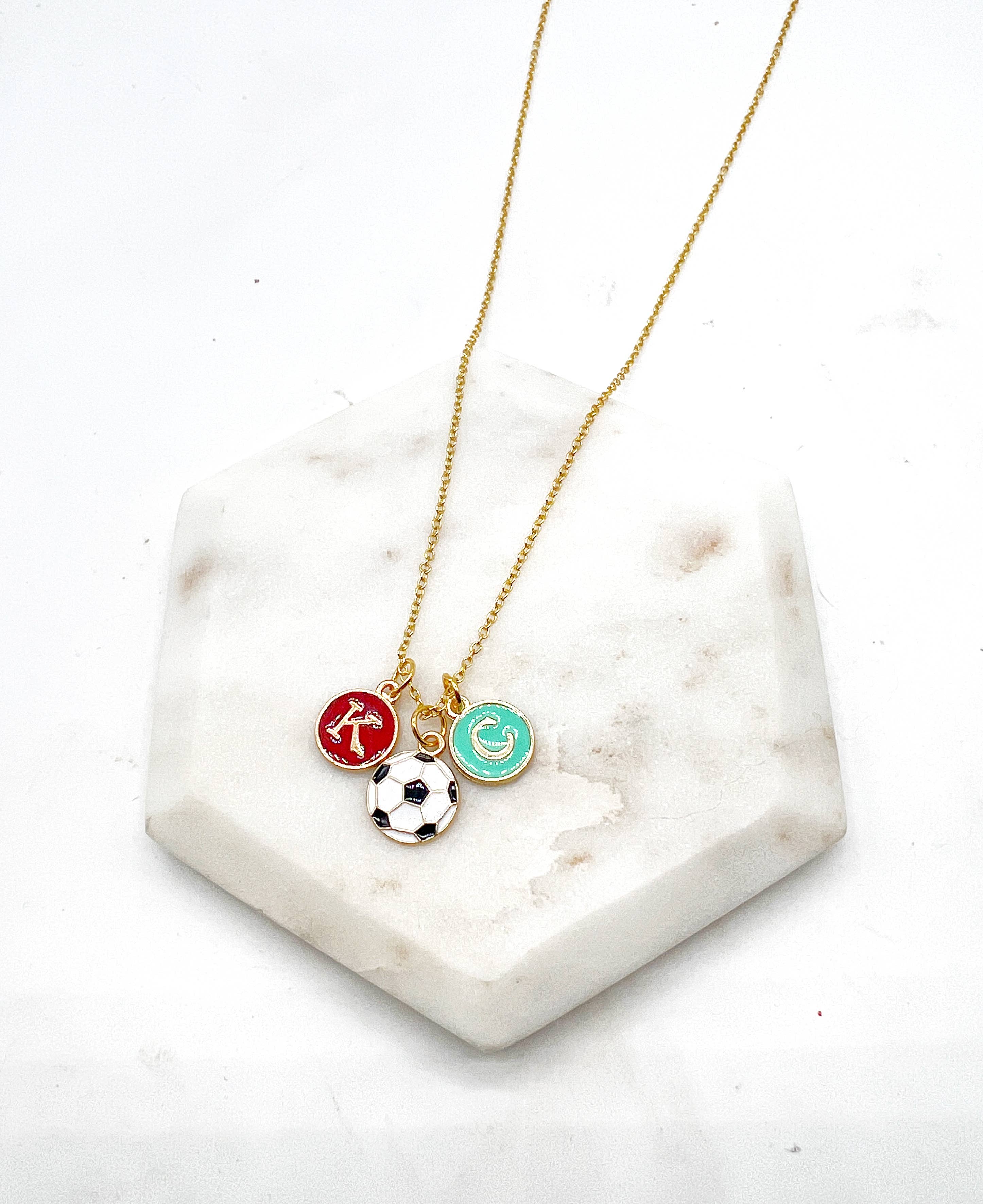 Show your KC pride with this KC initial necklace. K and C are on both sides of the charm, while the soccer ball is on one side. Necklace chain measure 18 inches. 2 inch extender available to be added upon request.