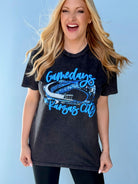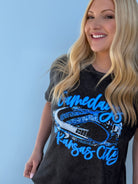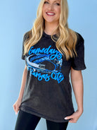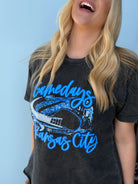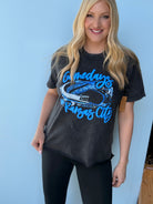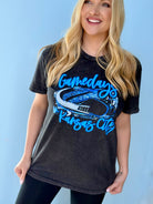 Our newest OBSESSION! This perfect, bright blue print on a perfect mineral washed black tee makes for the PERFECT Gameday fit!!!! Unisex sizing