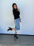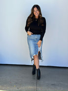 HIGH WAISTED MIDI SKIRT WITH DISTRESSING