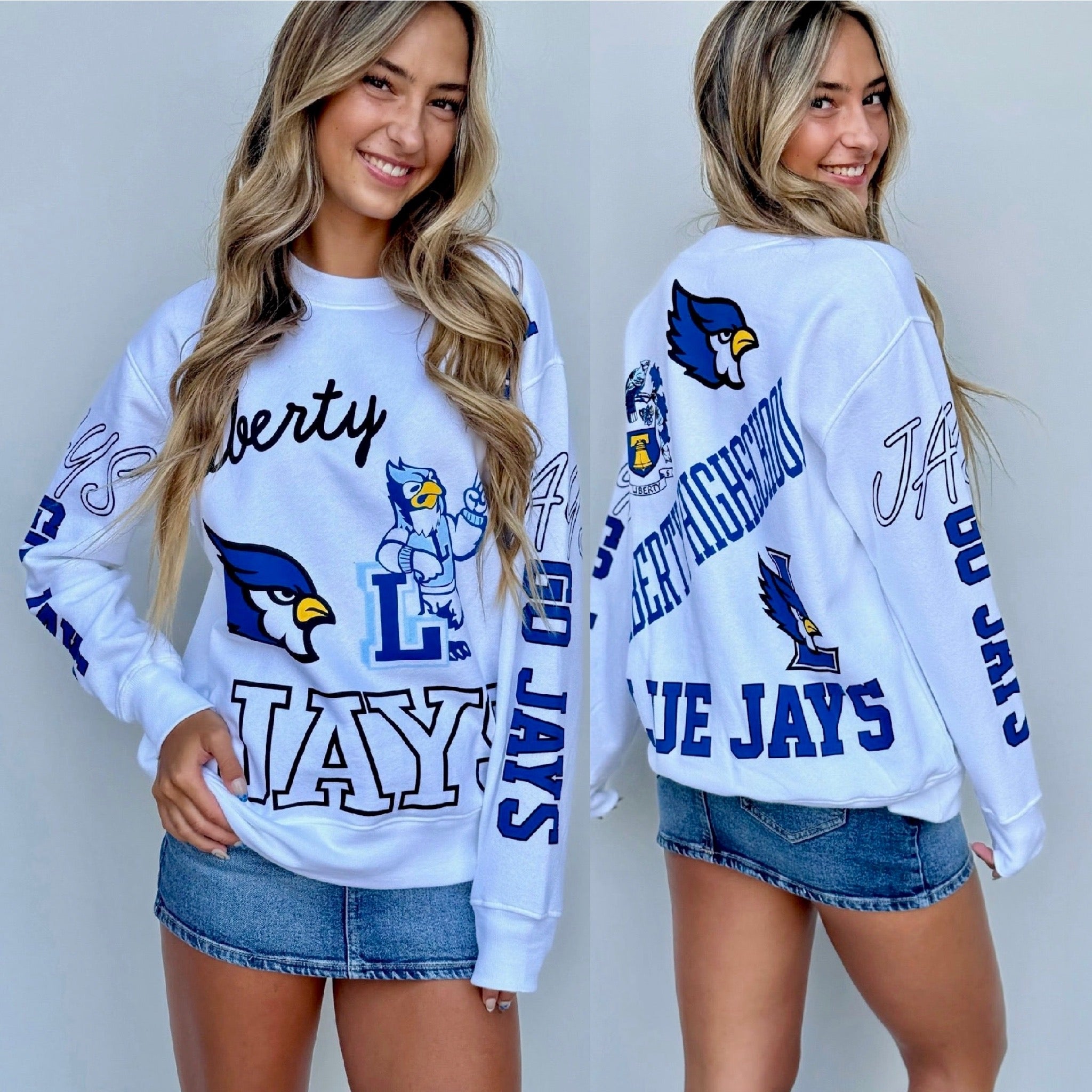Score a touchdown in style with the Jays Kelcey Crew! This crewneck sweatshirt features a fun Liberty blue jays design and is made from soft, comfortable material. Perfect for high school students looking to add some fun to their wardrobe. (Go team!)