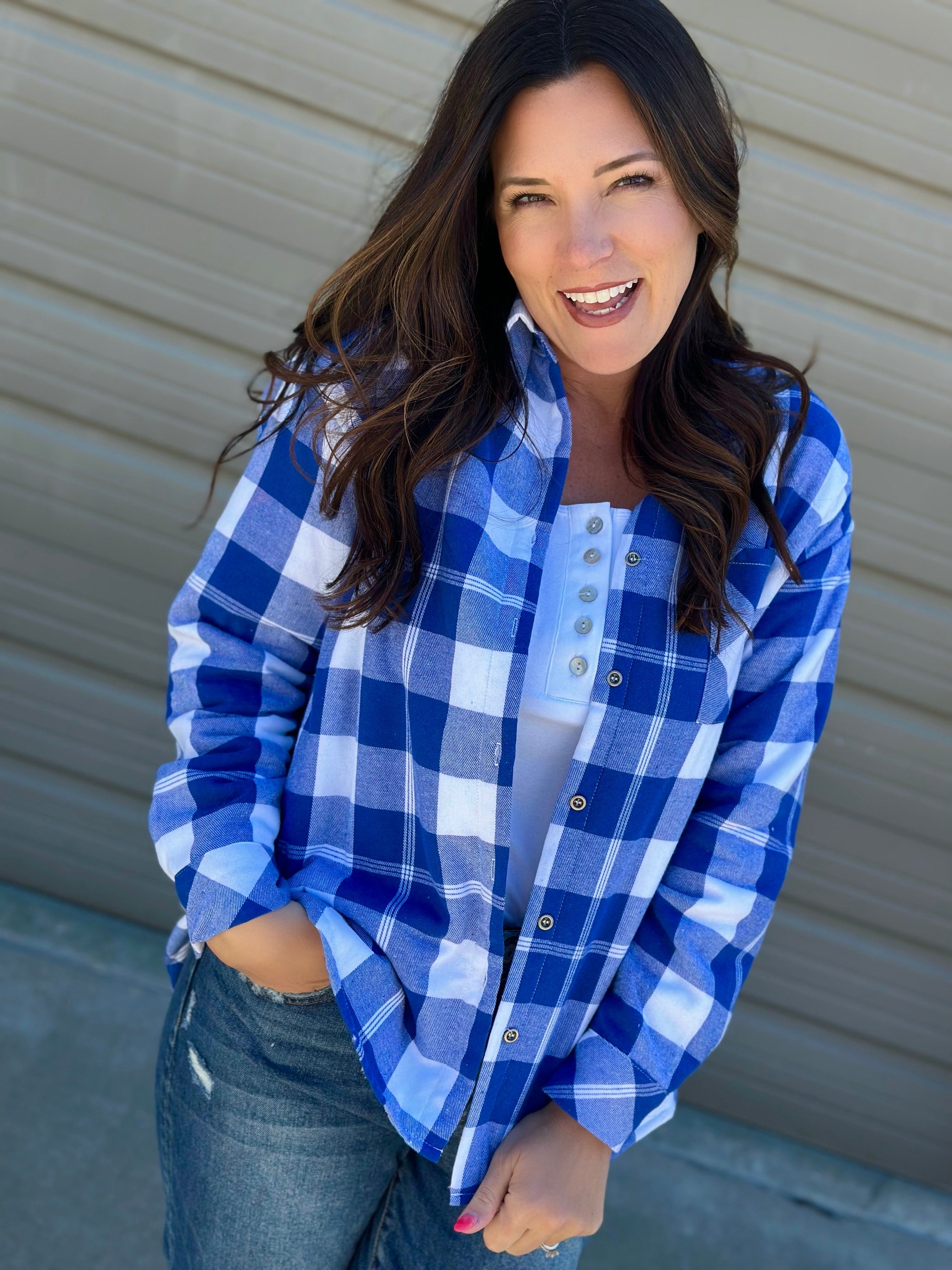 A gorgeous custom Shacket with Kansas City’s favorite spring colors - Royal Blue and White! The colors are beautiful and bright. It’s Sherpa lined but light weight enough to layer, has pockets and the perfect length to wear with jeans or leggings. This is the PERFECT item for the chilly night games and all the fall games too! The Shacket is a must have for this baseball season!!! (If you have the red and gold Shacket, this one fits the exact same!)
