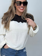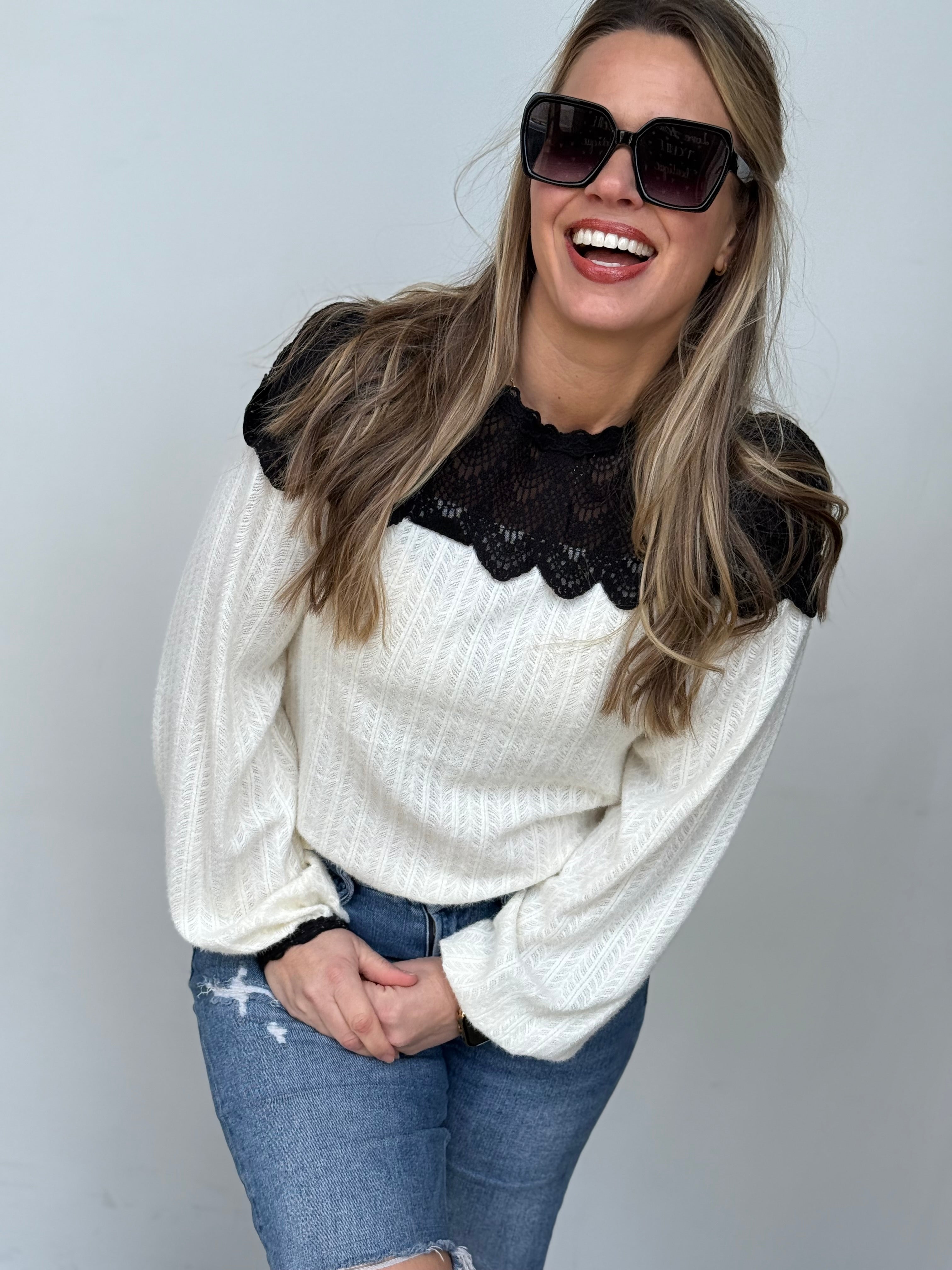 This lightweight blouse feels like your favorite sweater with a touch of elegance. Delicate black lace and ivory trim frames the neckline beautifully, while a convenient button closure at the back of the neck keeps everything secure and comfortable. The soft, breathable fabric drapes effortlessly, making it perfect for layering or wearing solo. True to size and ready to become a go-to piece in your rotation.