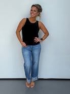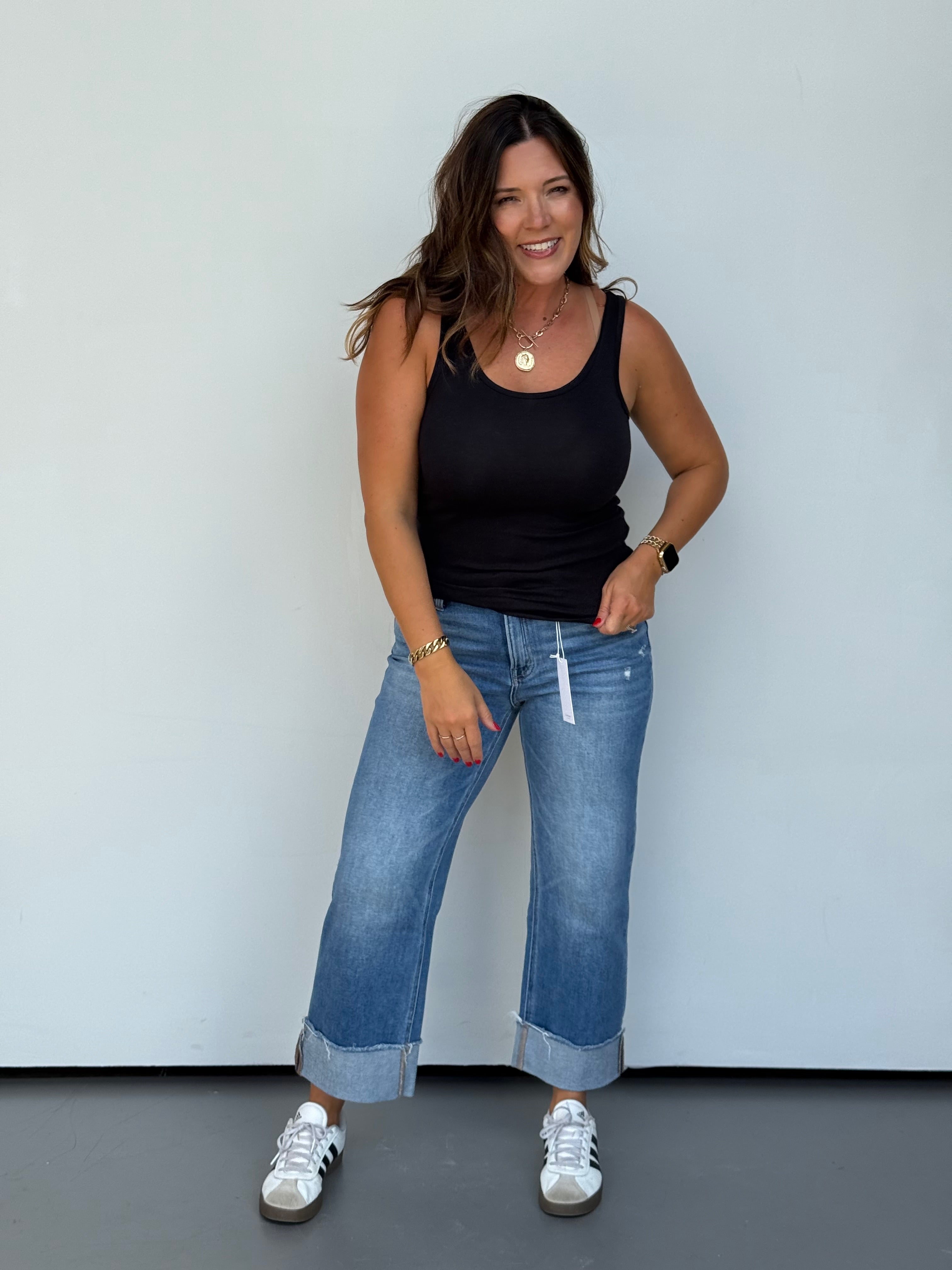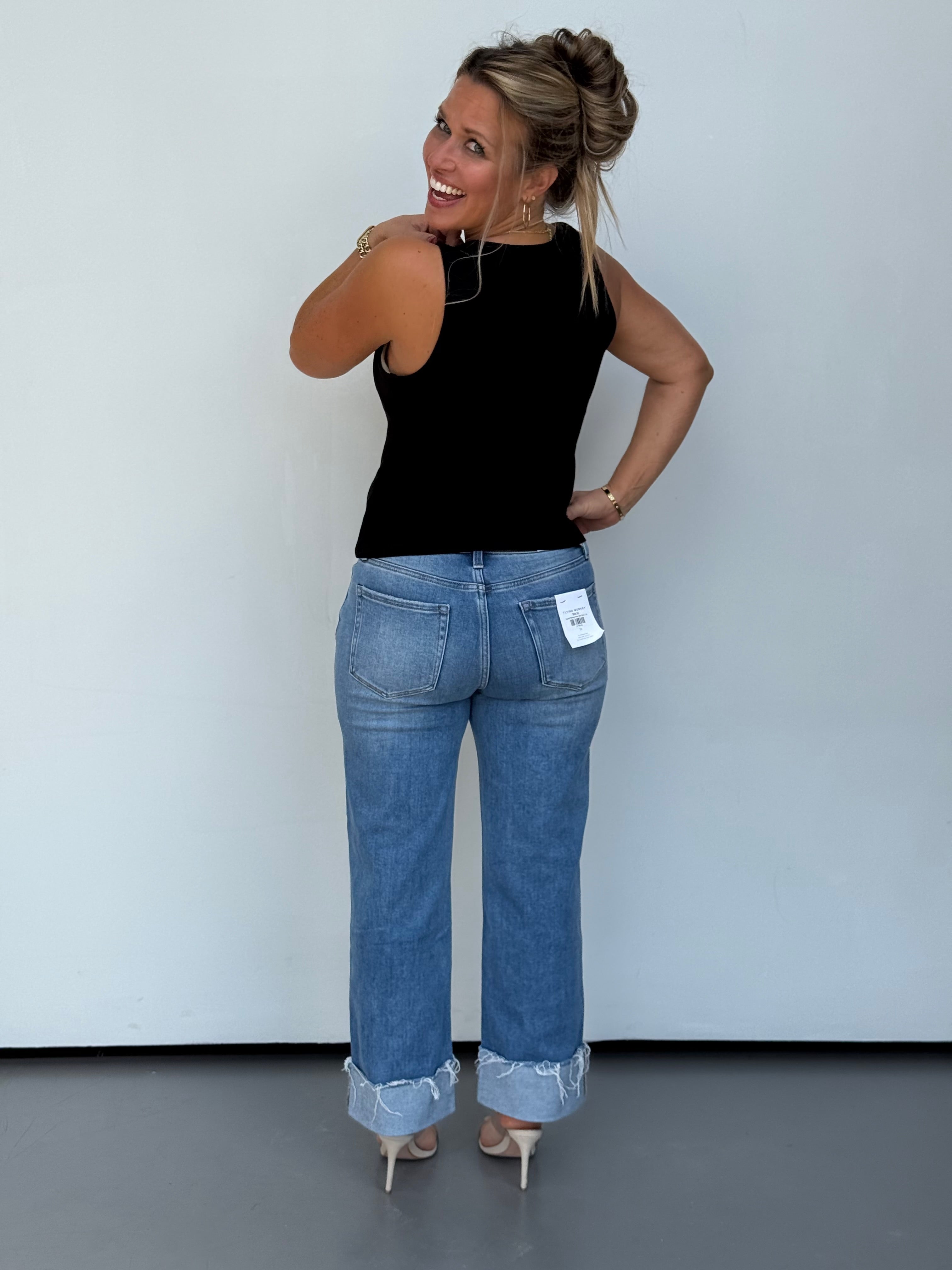 These Flying Monkey High-Rise Slim Cuffed Hem Wide Leg Jeans for Women are the perfect balance of style and comfort. Distressed hems, zipper and button closure, and a wide leg style – all designed to keep you looking fashionable and feeling comfortable.