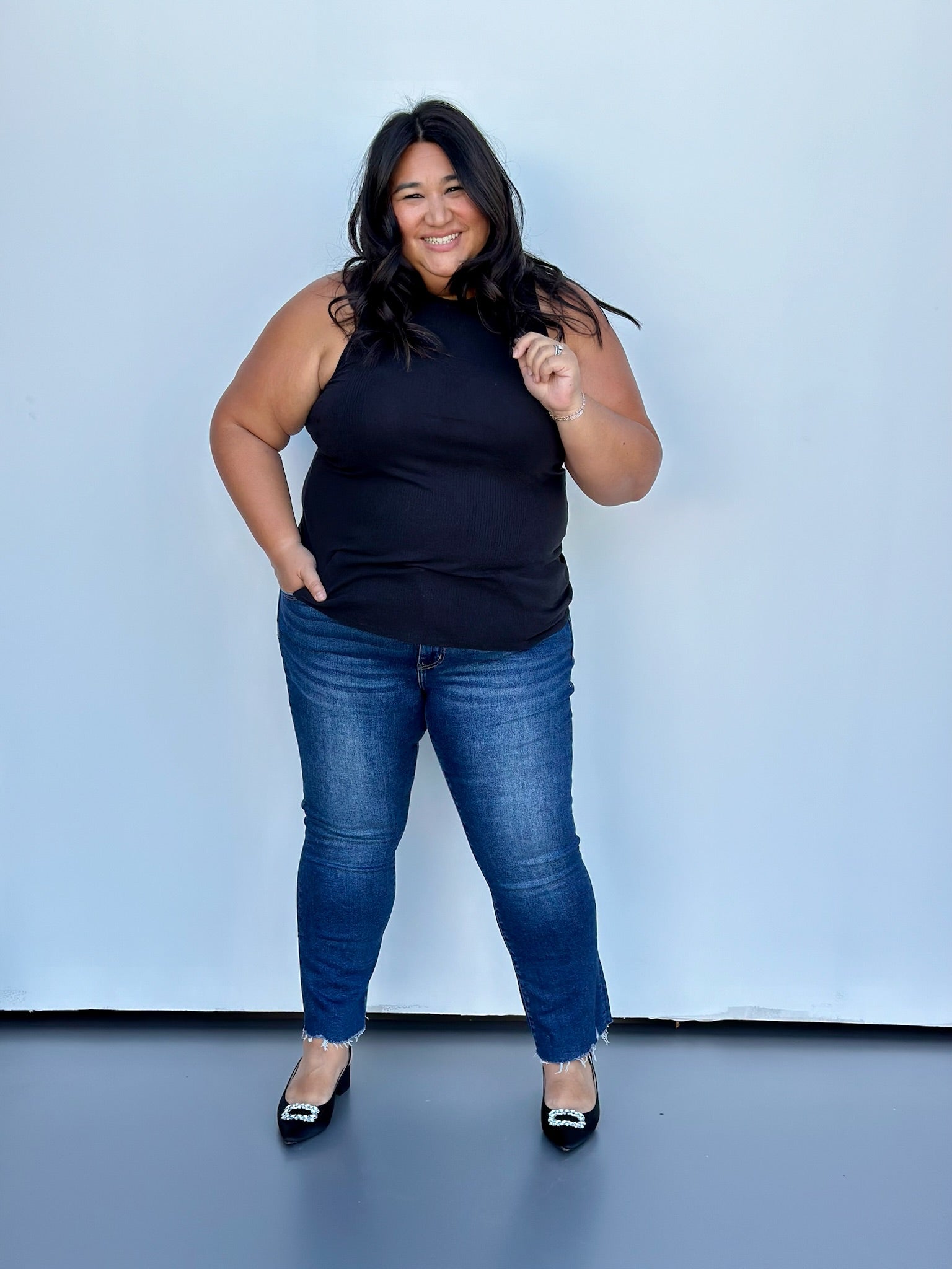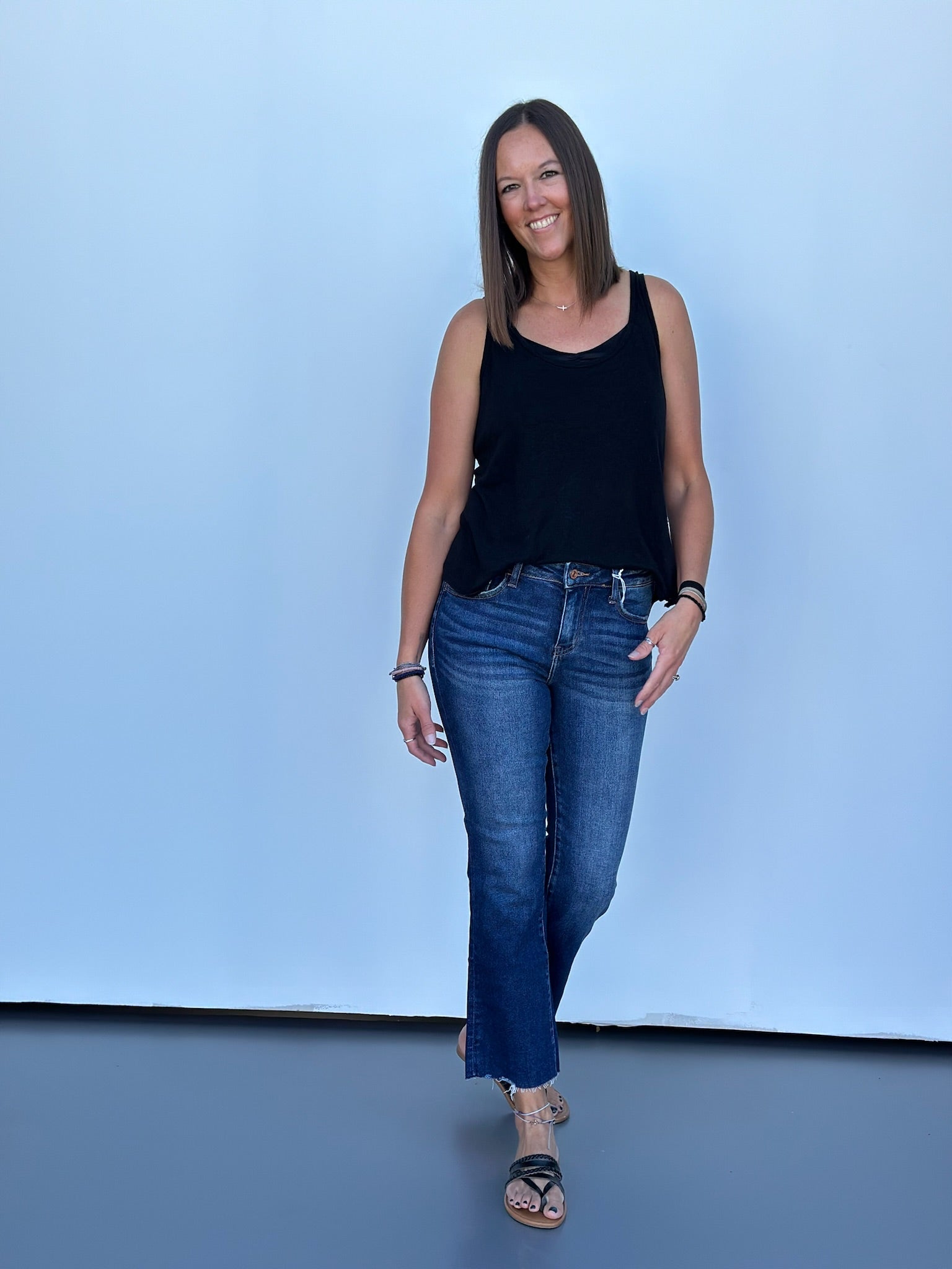 COMFORT STRETCH DENIM, MID RISE WAIST, CROPPED LENGTH, RAW HEM, MINI BOOTCUT JEANS