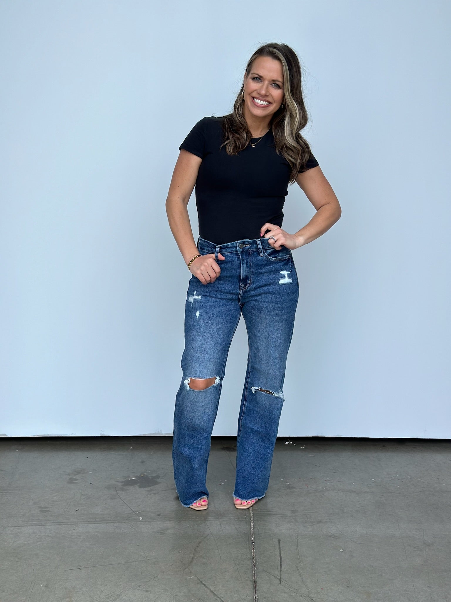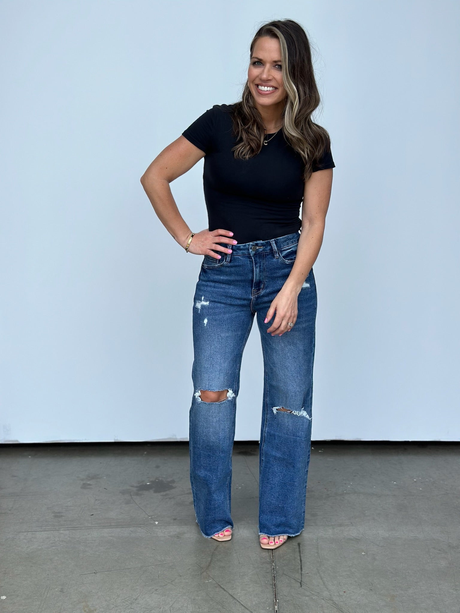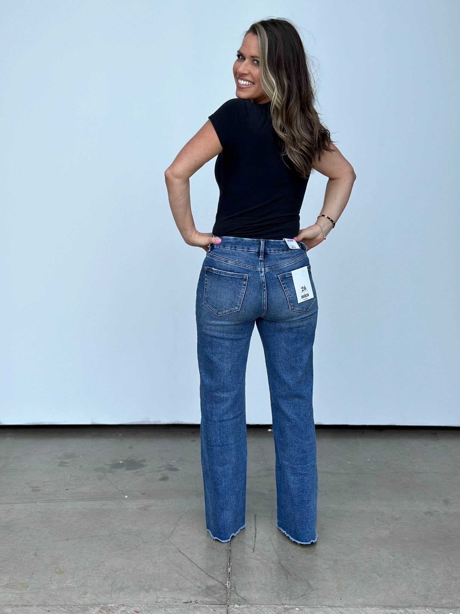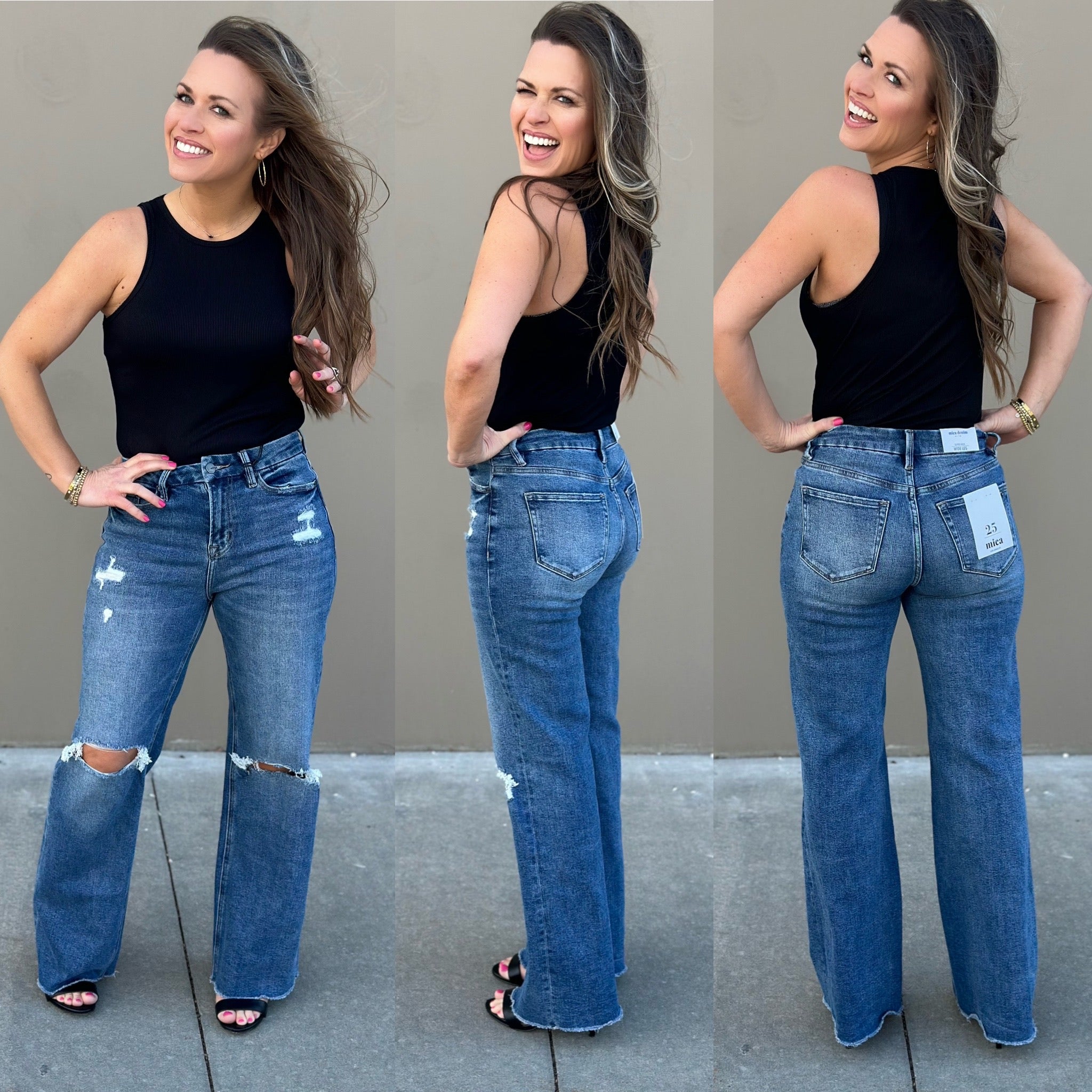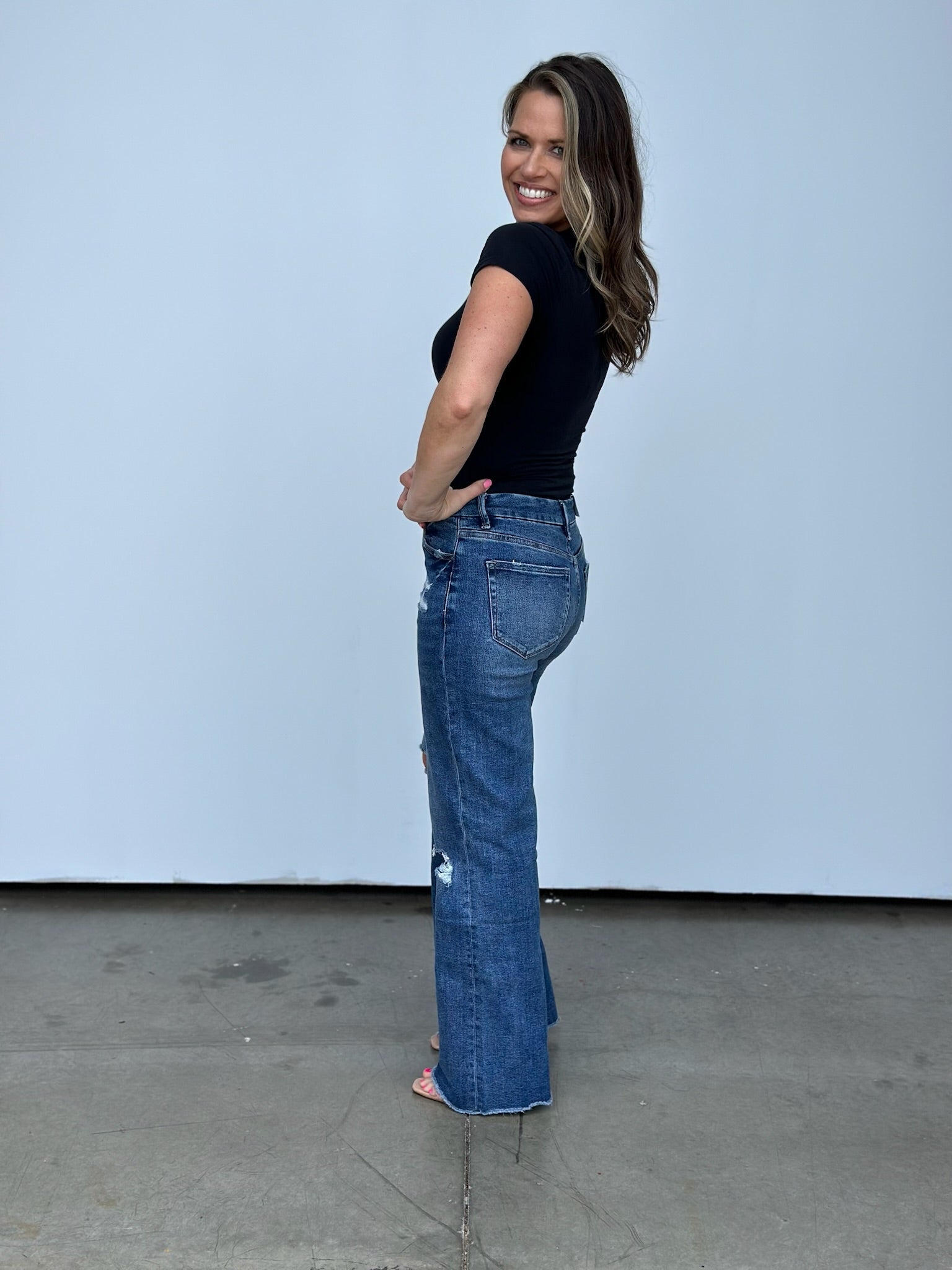 Step up your style game with this high-rise wide leg jean that'll have you raising the stakes in the fashion world! The raw hem makes cropping them to your desired length a breeze! These run a little on the bigger side, we were able to size down one size comfortably. Tons of incredible stretch too!