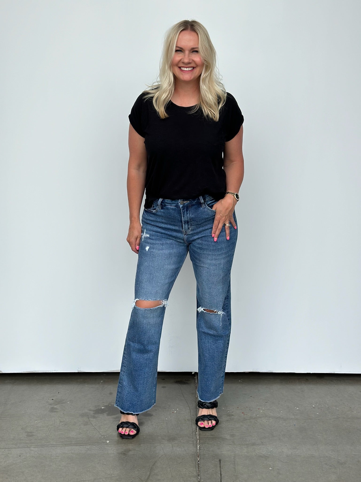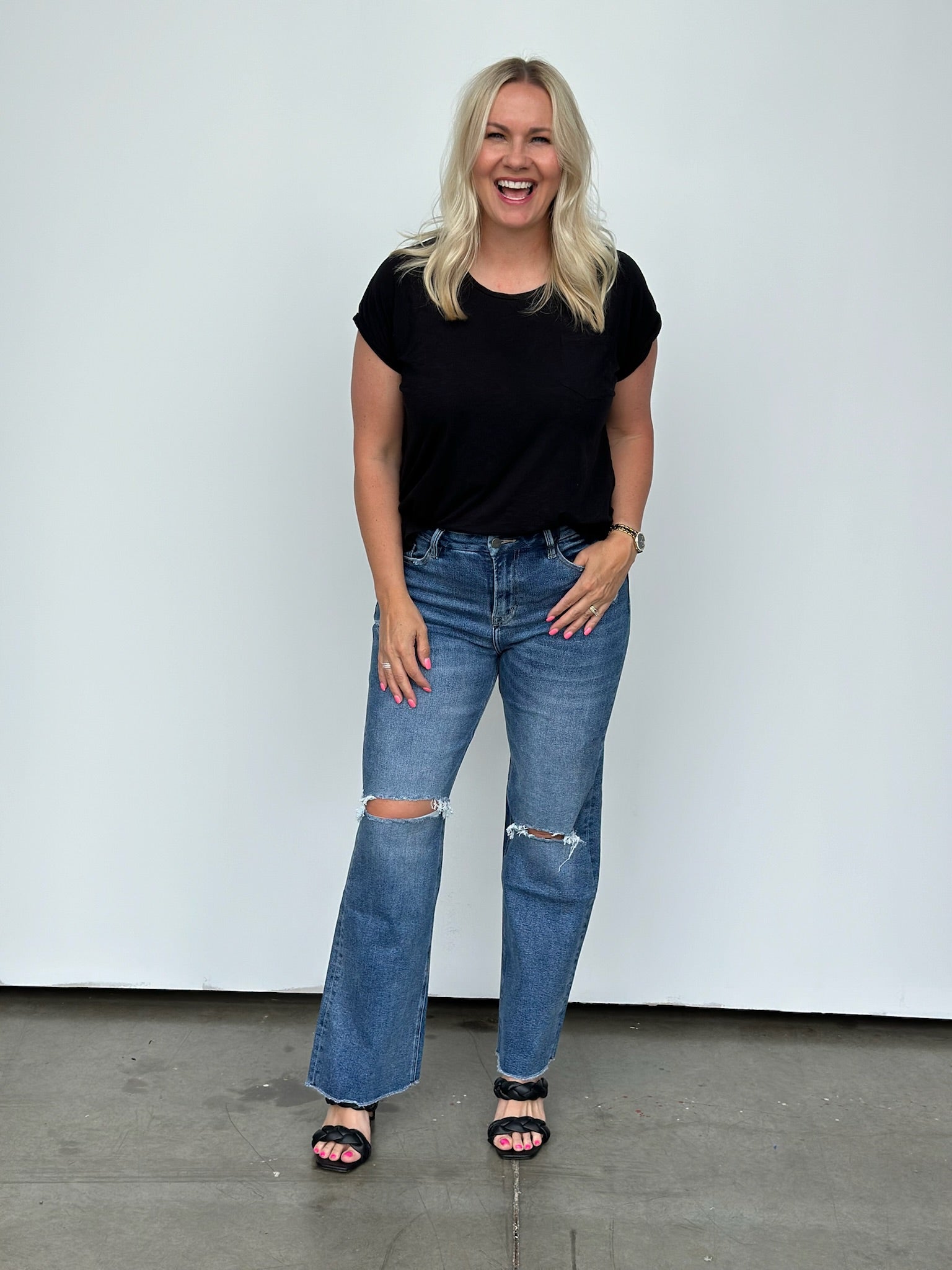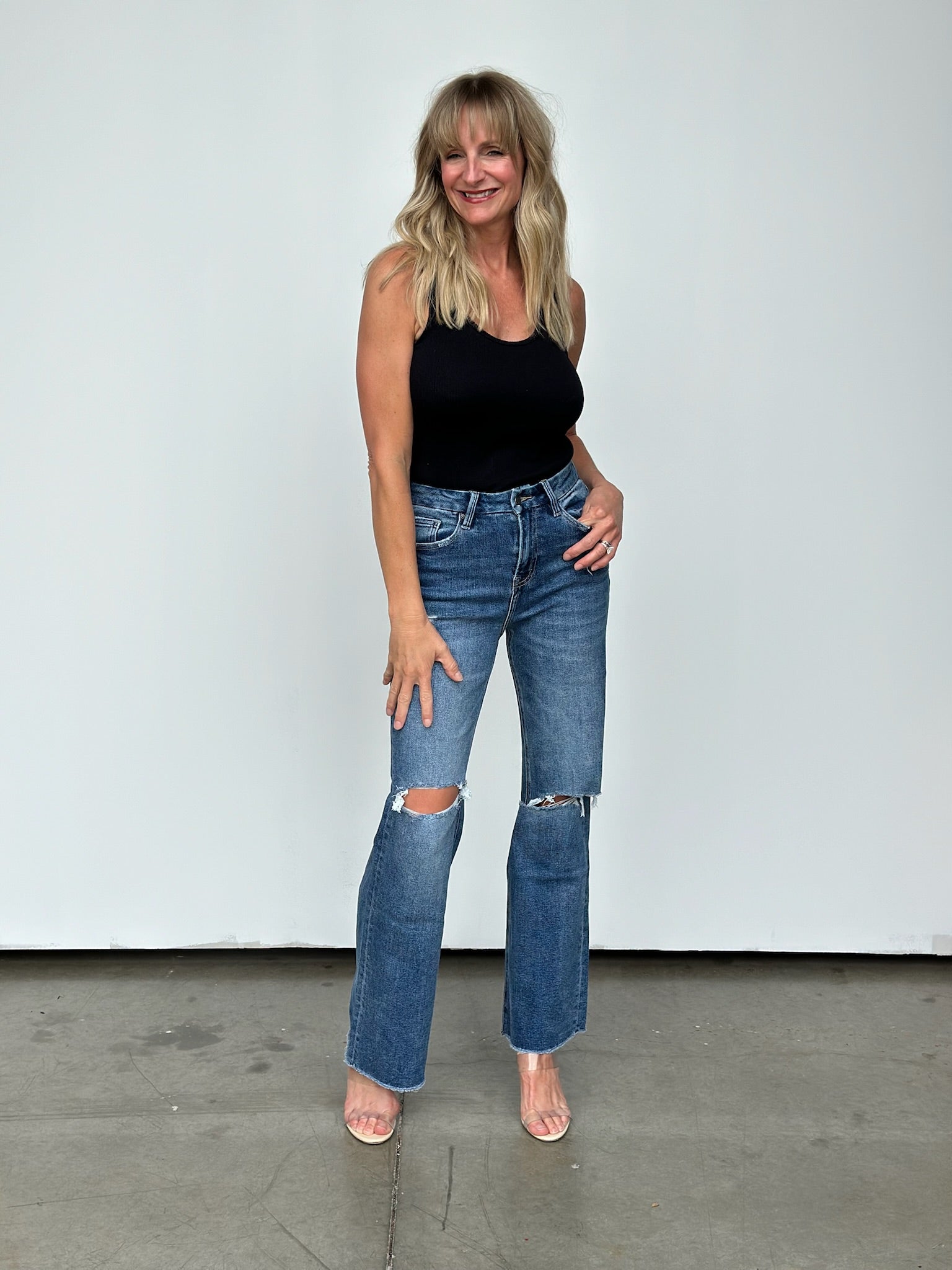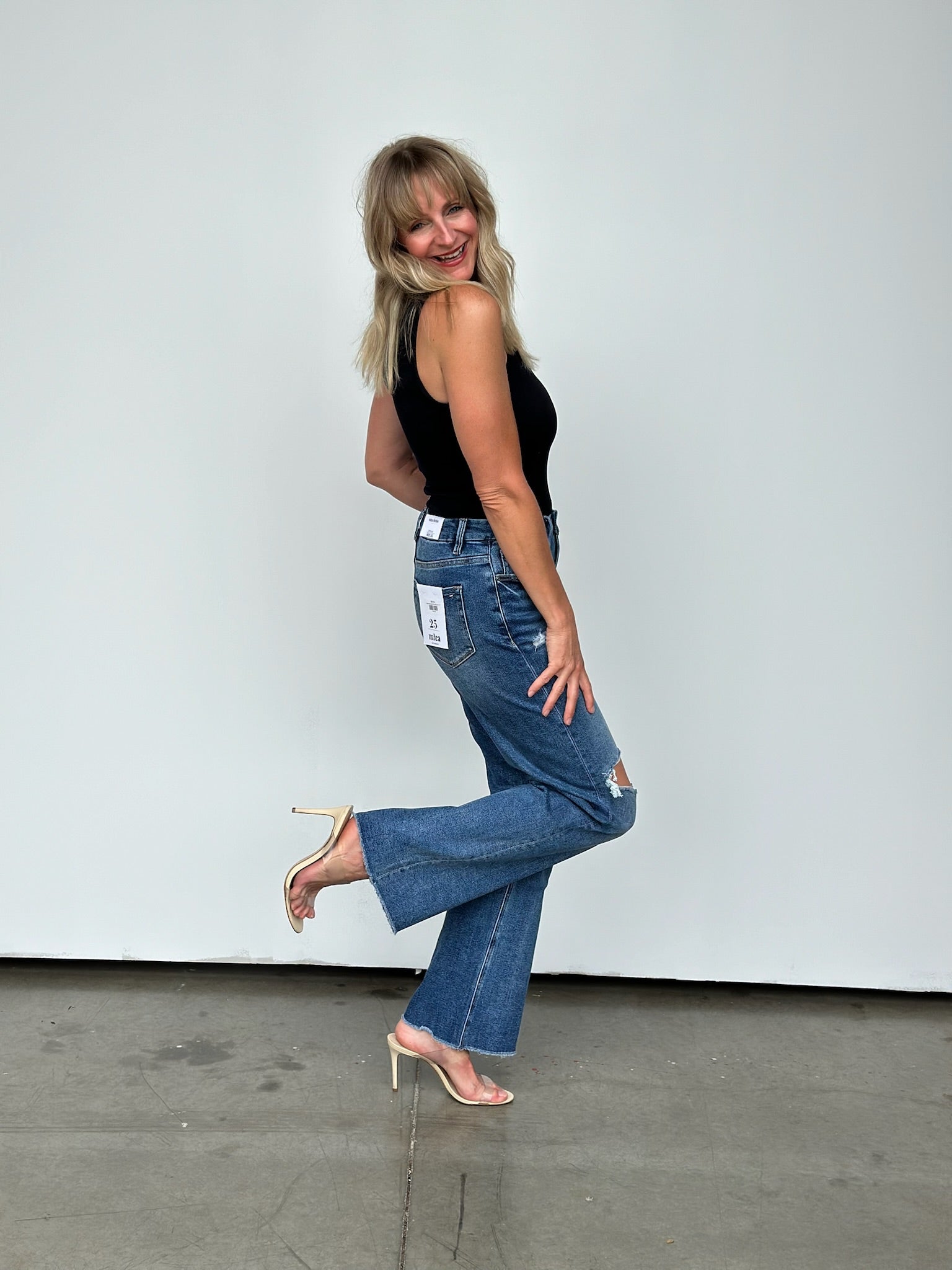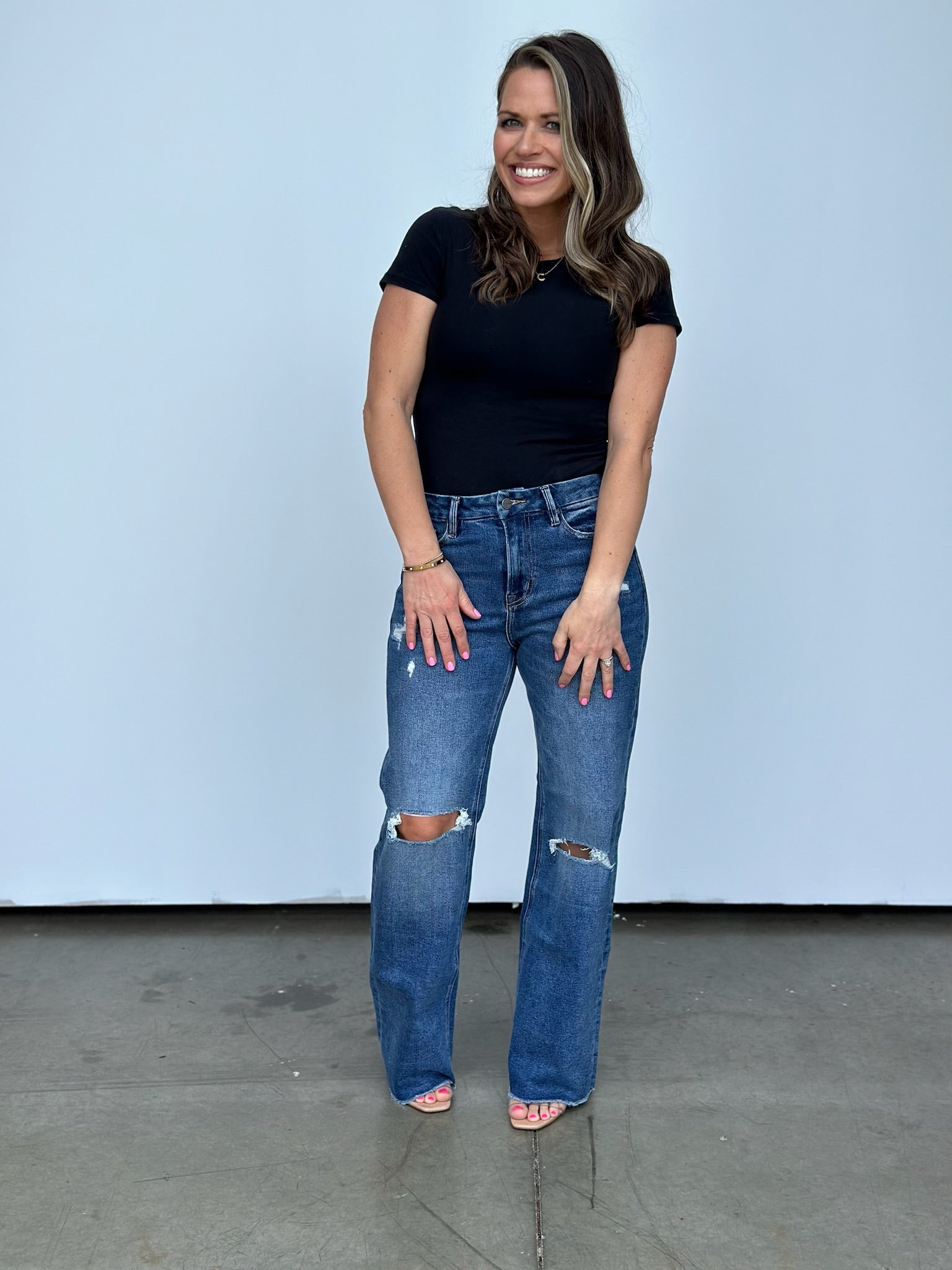 Step up your style game with this high-rise wide leg jean that'll have you raising the stakes in the fashion world! The raw hem makes cropping them to your desired length a breeze! These run a little on the bigger side, we were able to size down one size comfortably. Tons of incredible stretch too!