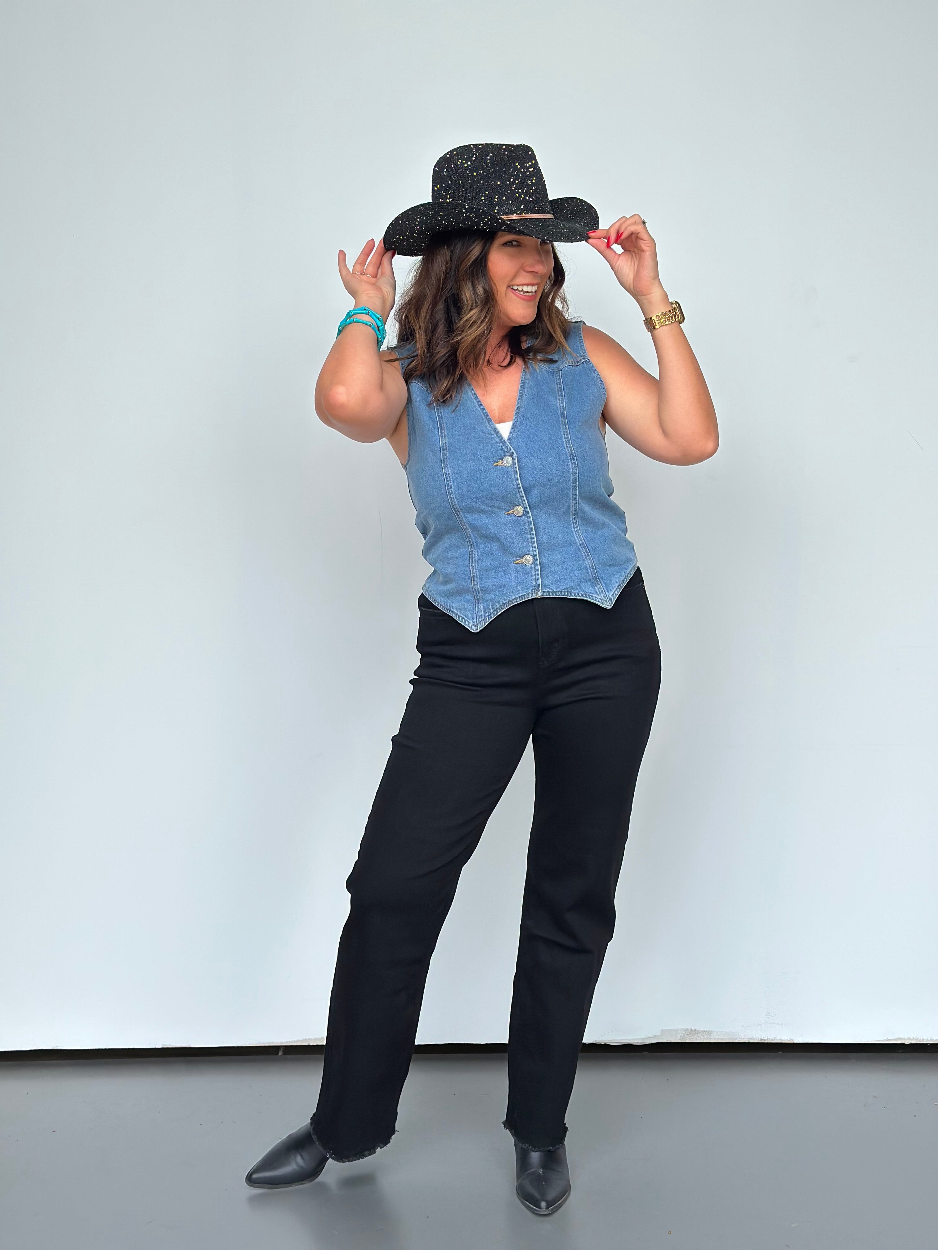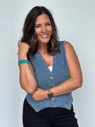 Unleash your inner rebel with our V Neck Button Up Denim Vest! This versatile piece features a trendy v-neck and easy-to-use buttons, perfect for layering or rocking on its own. Classic denim never goes out of style - embrace your unique fashion sense with this edgy yet timeless vest.