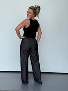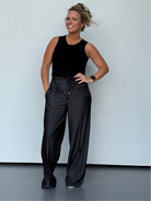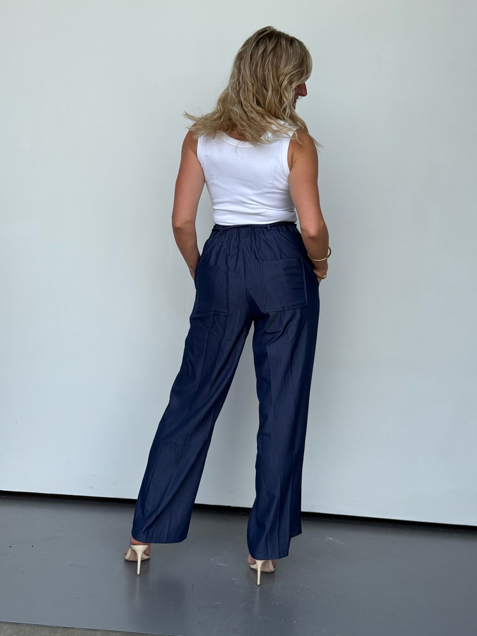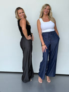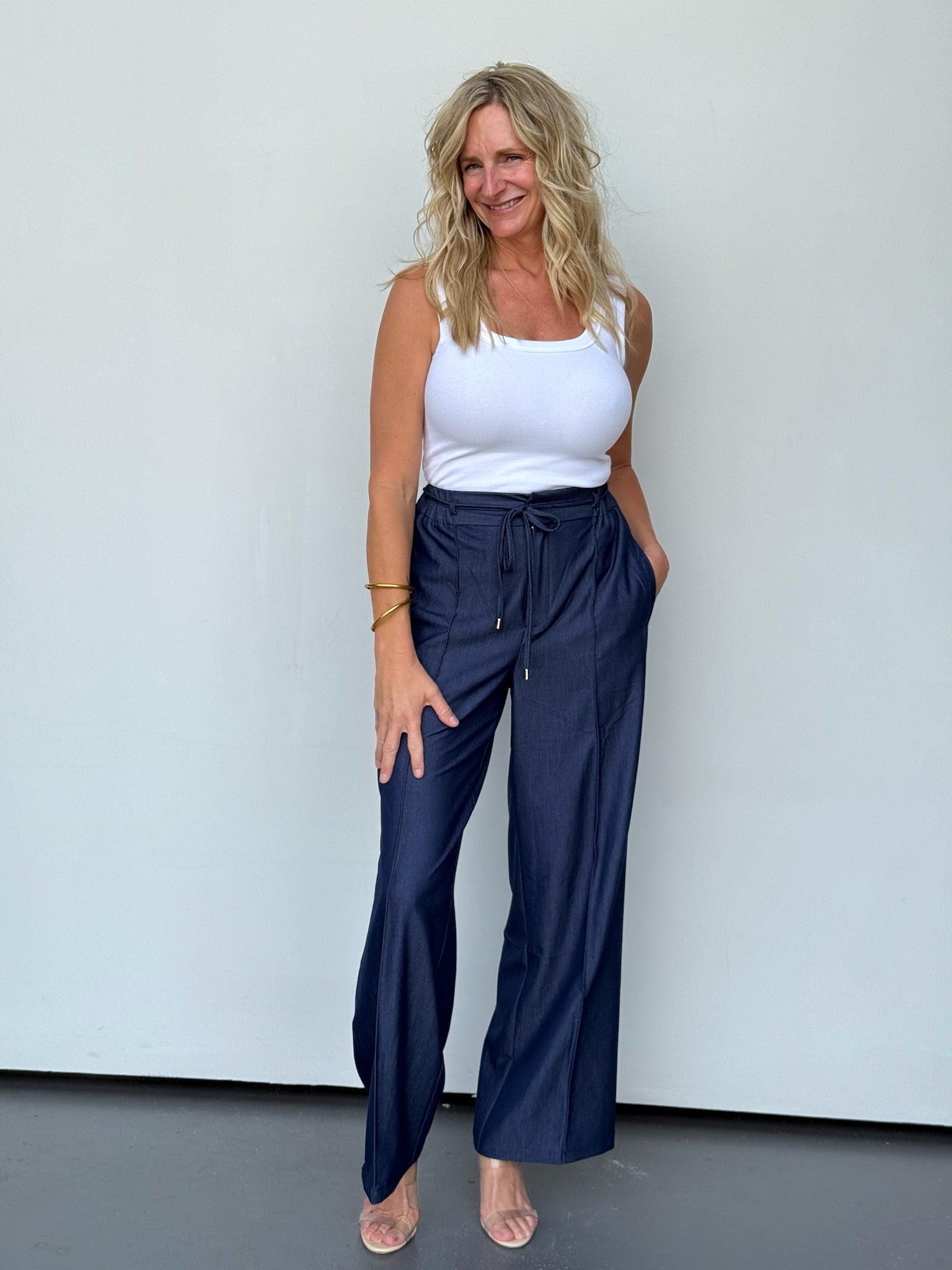 These pleated pants bring a fun twist to your wardrobe with their lightweight denim-like fabric and comfy elastic back waist. Featuring an inside clasp closure and a playful drawstring belt, they offer a perfect fit that feels just right.  They also come in two colors, black and navy. Plus, handy pockets keep your essentials close while you strut your stuff in style. True to size with lots of stretch and ready for any adventure!