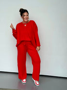 Get game day ready with these Red Waffle Knit Pants! Super soft and true to size, they offer cozy comfort with a playful vibe. Featuring a handy drawstring for the perfect fit, they pair perfectly with the matching red waffle top. Want a little extra length? Just size up and enjoy the relaxed, stylish look. Perfect for cheering on your team in comfort!