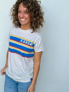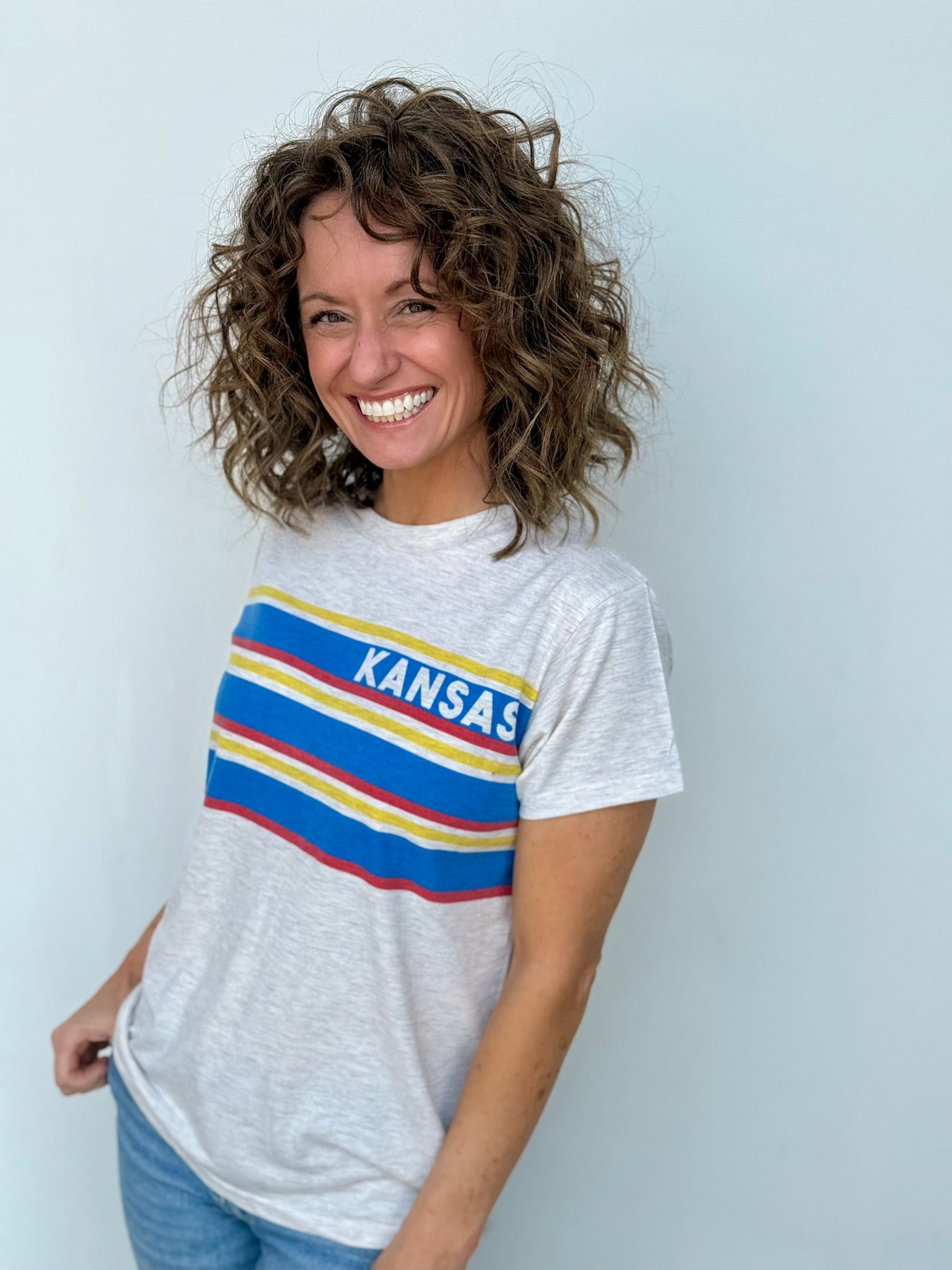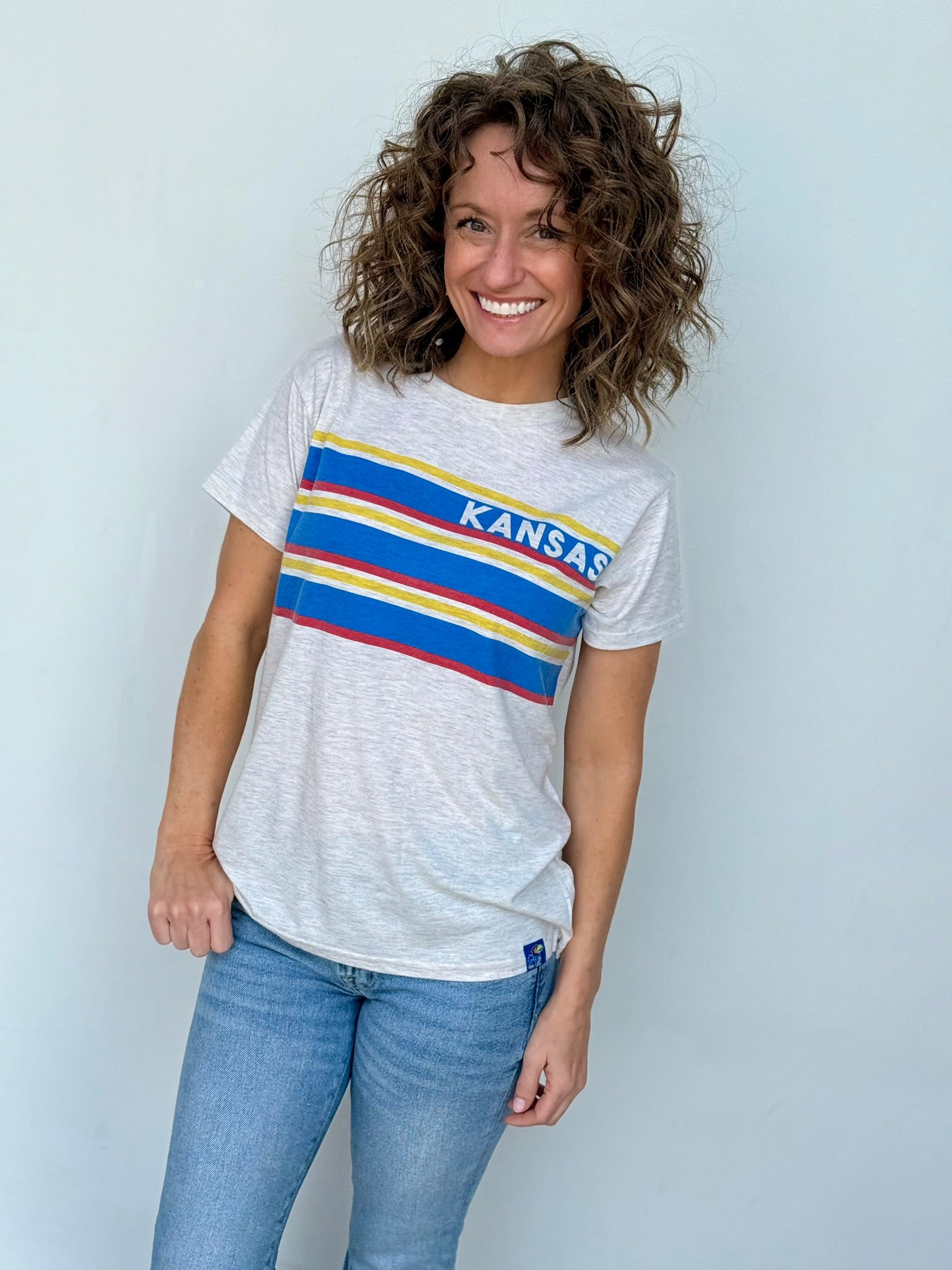 Throw on this officially licensed KU tee and celebrate in style. Crafted from super soft fabric that feels as good as it looks, it's cut slightly cropped and keeps things light with a breathable, weightless feel. A playful stripe detail runs across the front for that extra touch of personality. True to size, it's the perfect piece for game day or everyday wear.