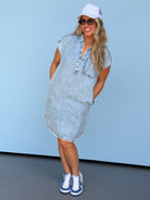 Effortless style meets everyday comfort in this lightweight denim dress. Featuring a relaxed dolman silhouette with a flattering drape, it's designed for movement and ease. The quarter button-up front and collar add polished detail, while intentional fray accents bring casual charm. Functional front pockets keeps essentials within reach. True to size for a perfect fit straight out of the box.