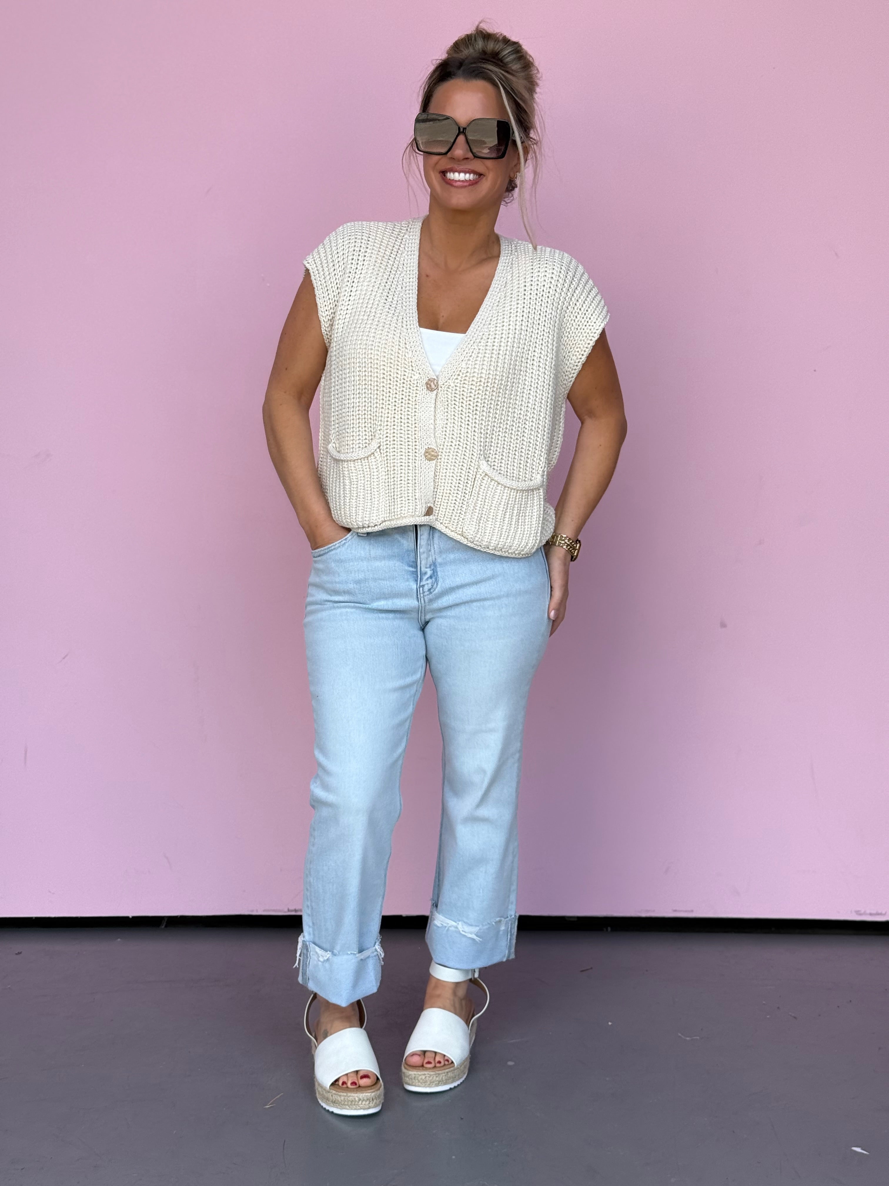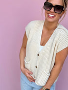 Effortless layering meets relaxed cool with this chunky stitch sweater. Gold buttons down the front, patch pockets for practicality, and a cropped-yet-oversized silhouette that plays beautifully with your favorite tank underneath. The V-neck adds a touch of polish while keeping things casual. Size up if you're after a longer, more relaxed drape—this piece is all about that laid-back vibe.