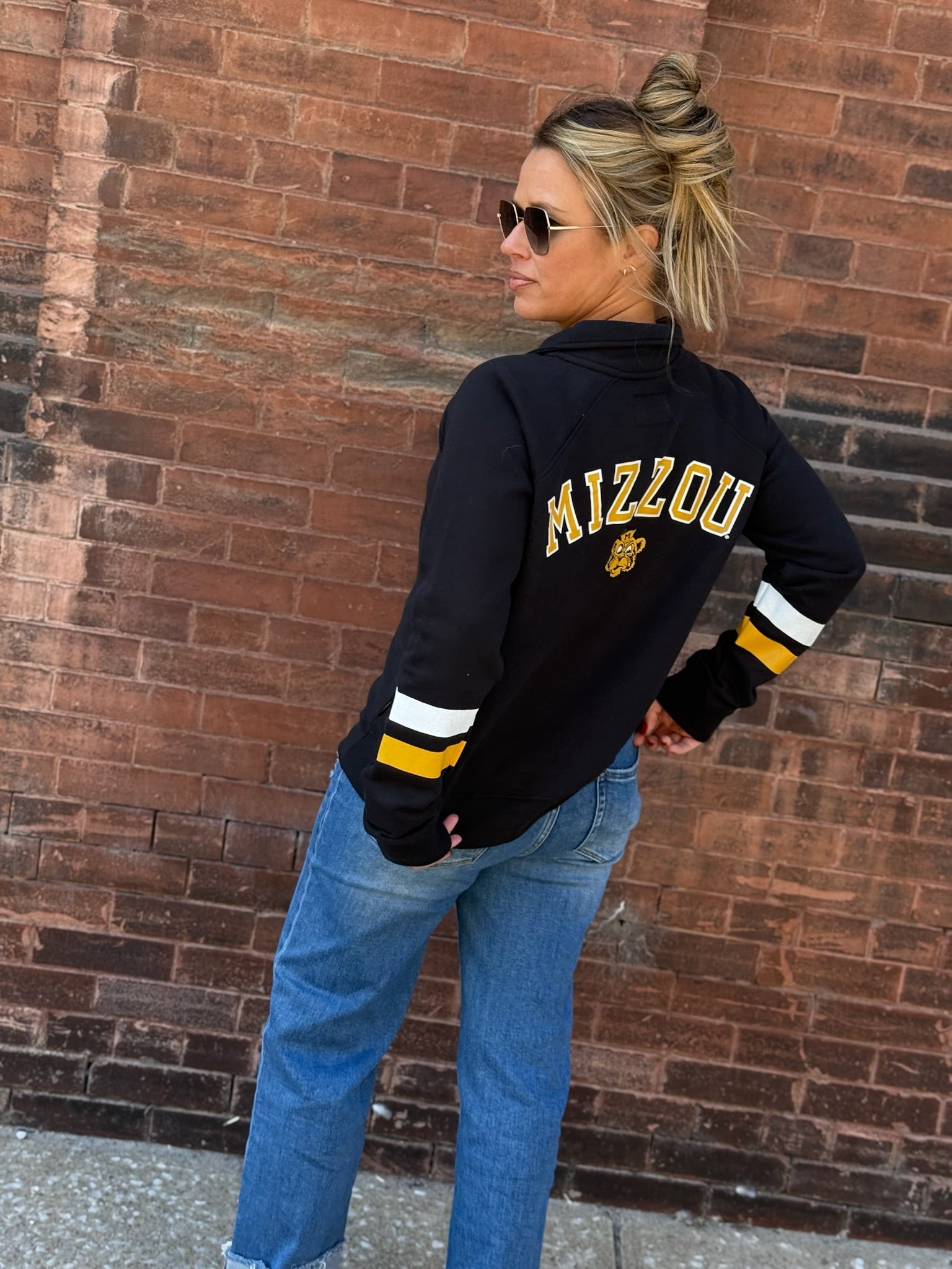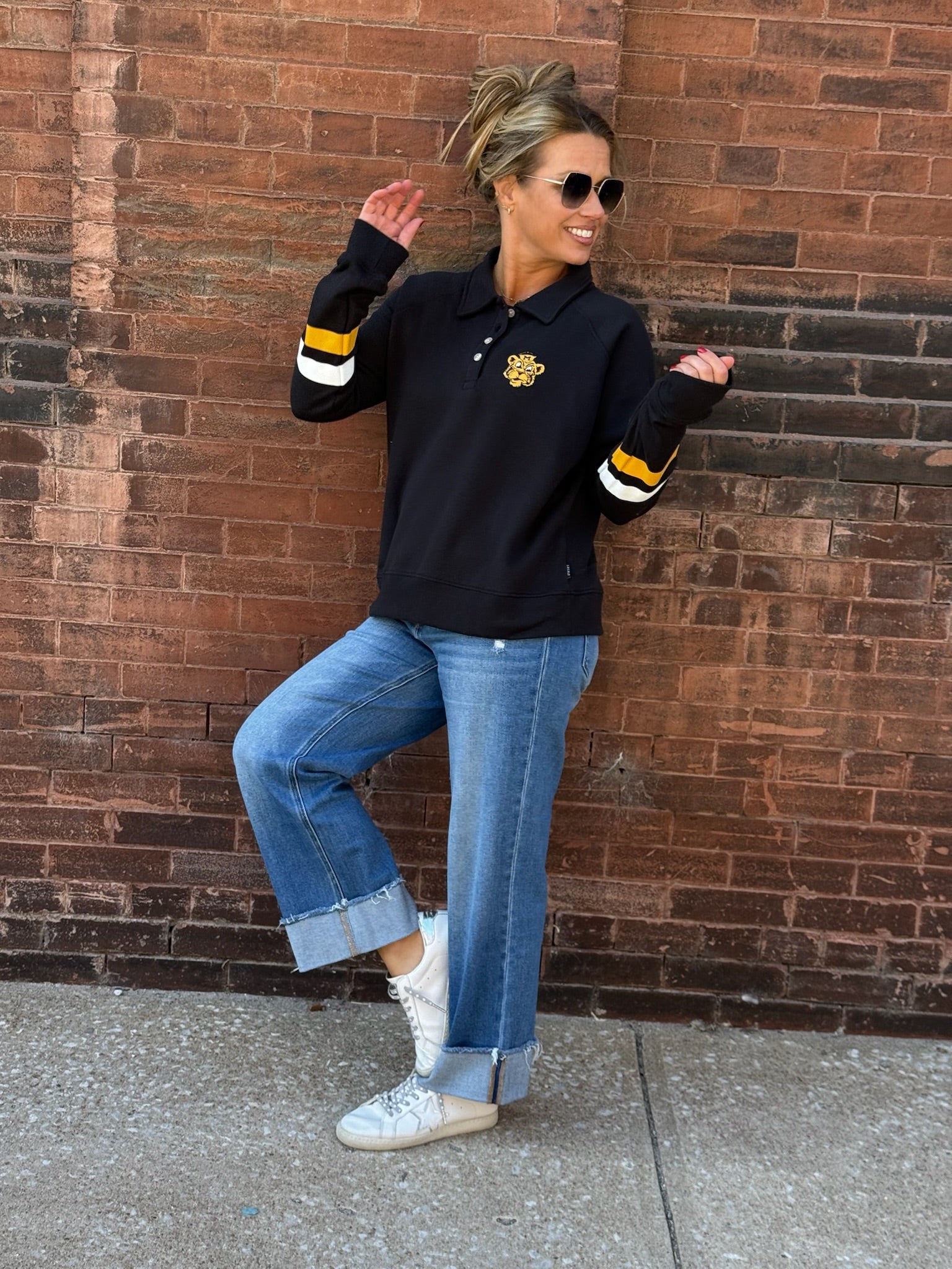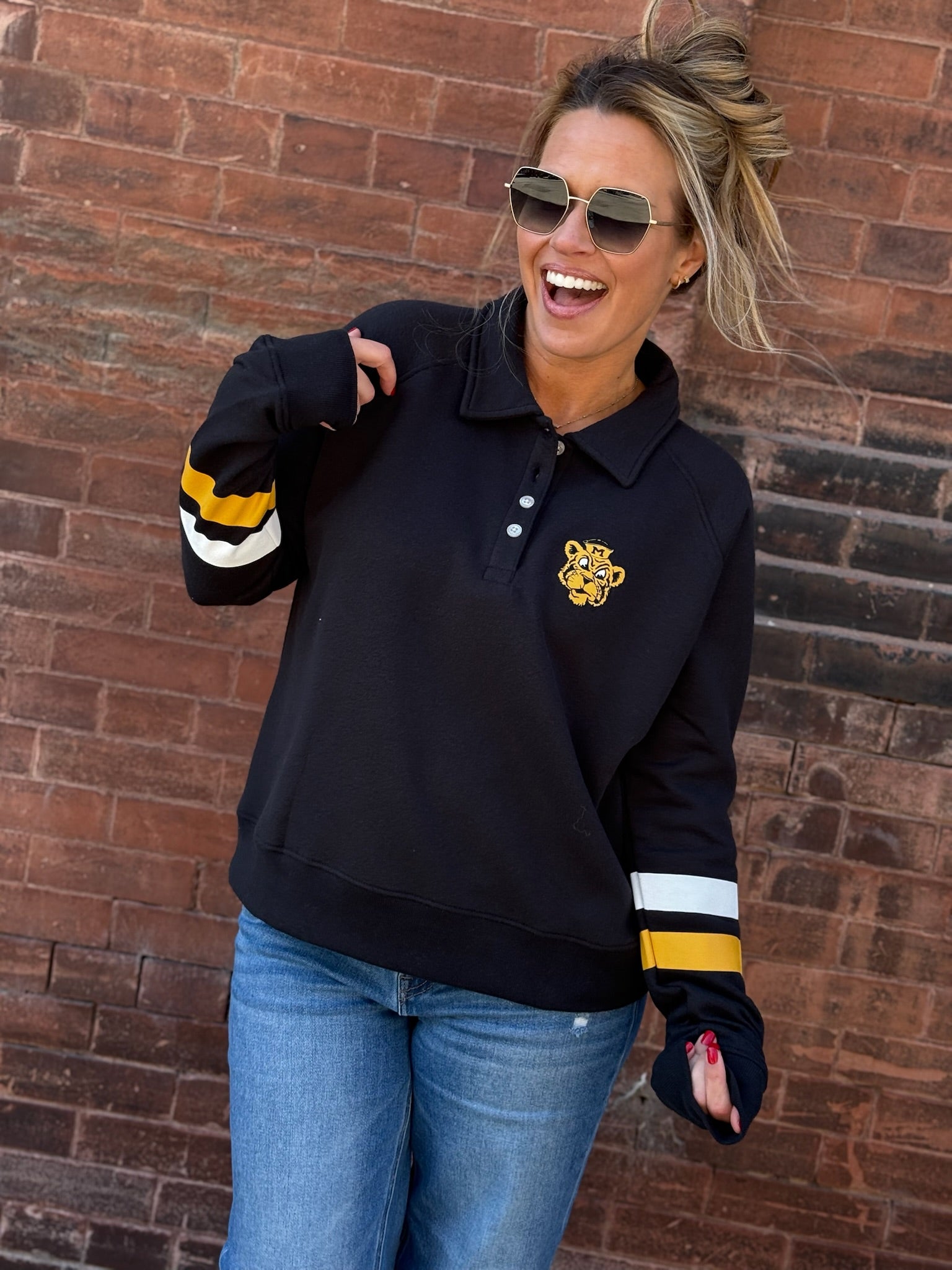 Stay cozy and spirited in the MU Women’s Fleece Polo! Made from super soft fleece, this polo-style sweatshirt fits true to size for all-day comfort. Stripes on the sleeves add a sporty touch, while the mascot proudly appears on both front and back—perfect for game day or any day you want to cheer on your school in style.