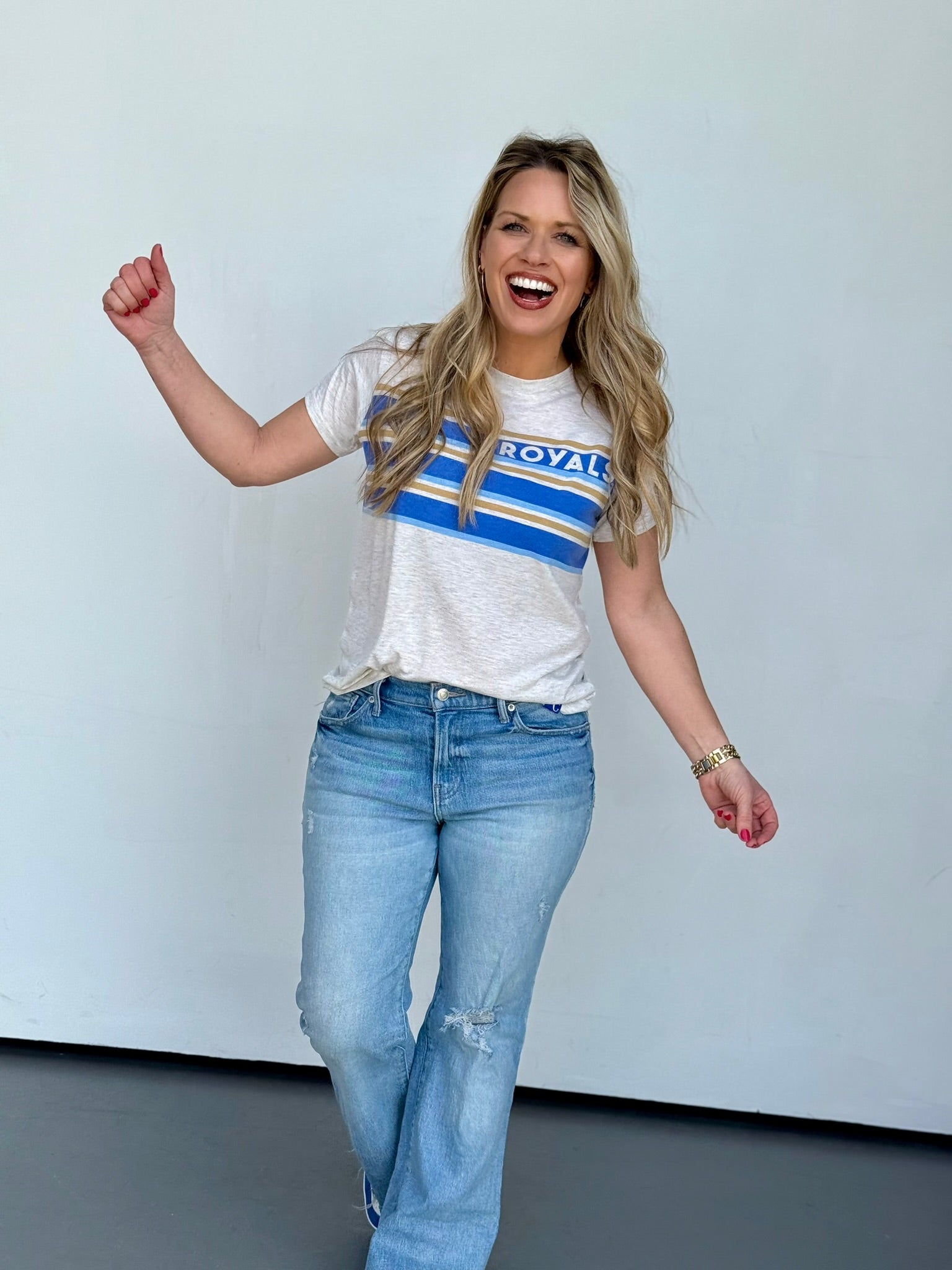 Throw on this officially licensed Royals tee and celebrate in style. Crafted from super soft fabric that feels as good as it looks, it's cut slightly cropped and keeps things light with a breathable, weightless feel. A playful stripe detail runs across the front for that extra touch of personality. True to size, it's the perfect piece for game day or everyday wear.