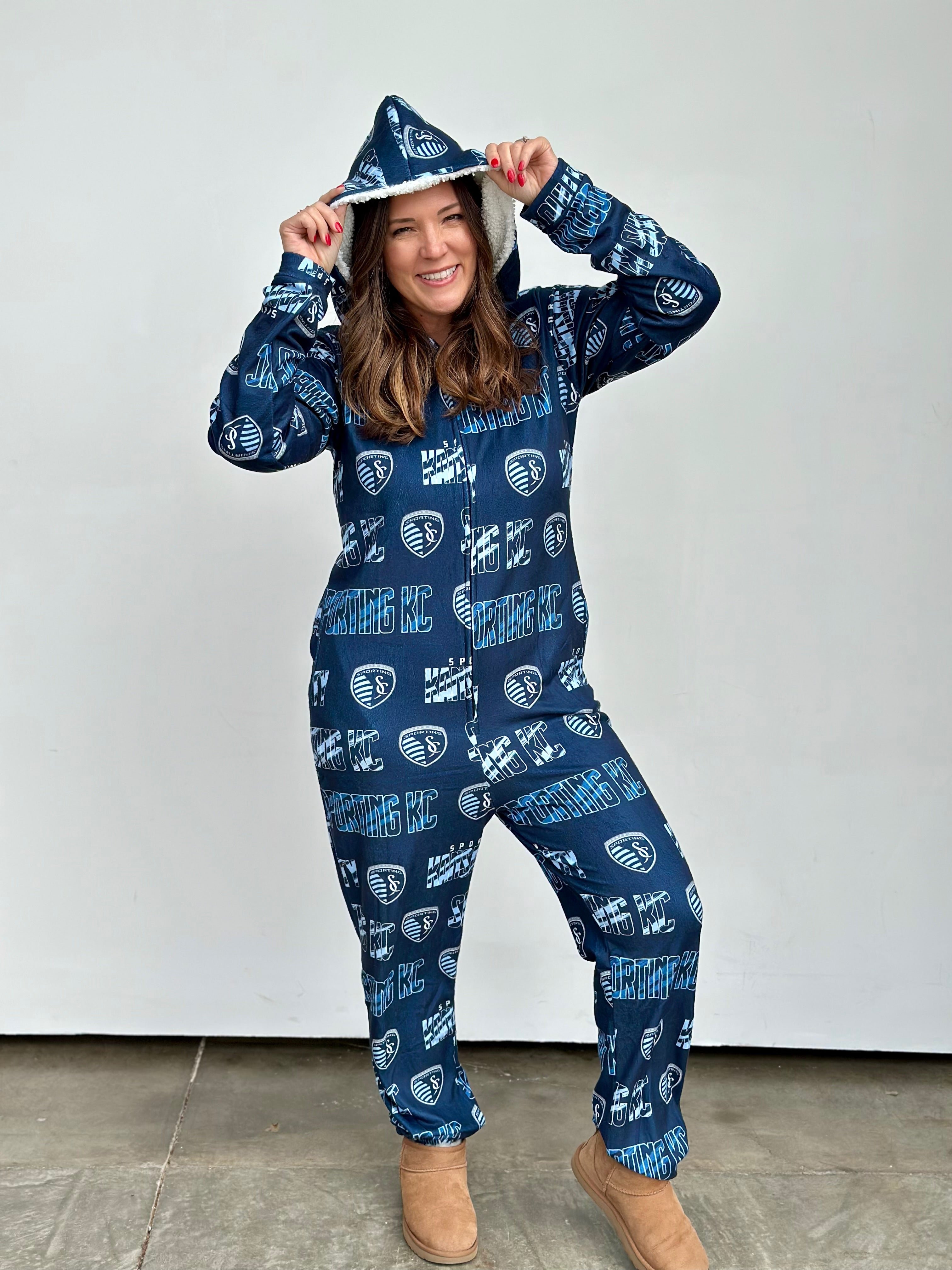 "Ditch the boring PJs and suit up in style with the Sporting KC Union Suit! Featuring official licensing and a nod to your love for soccer, this one-piece will have you scoring major comfort and team spirit points. Game nights just got a whole lot cozier. (Soccer hooligan-approved!)"