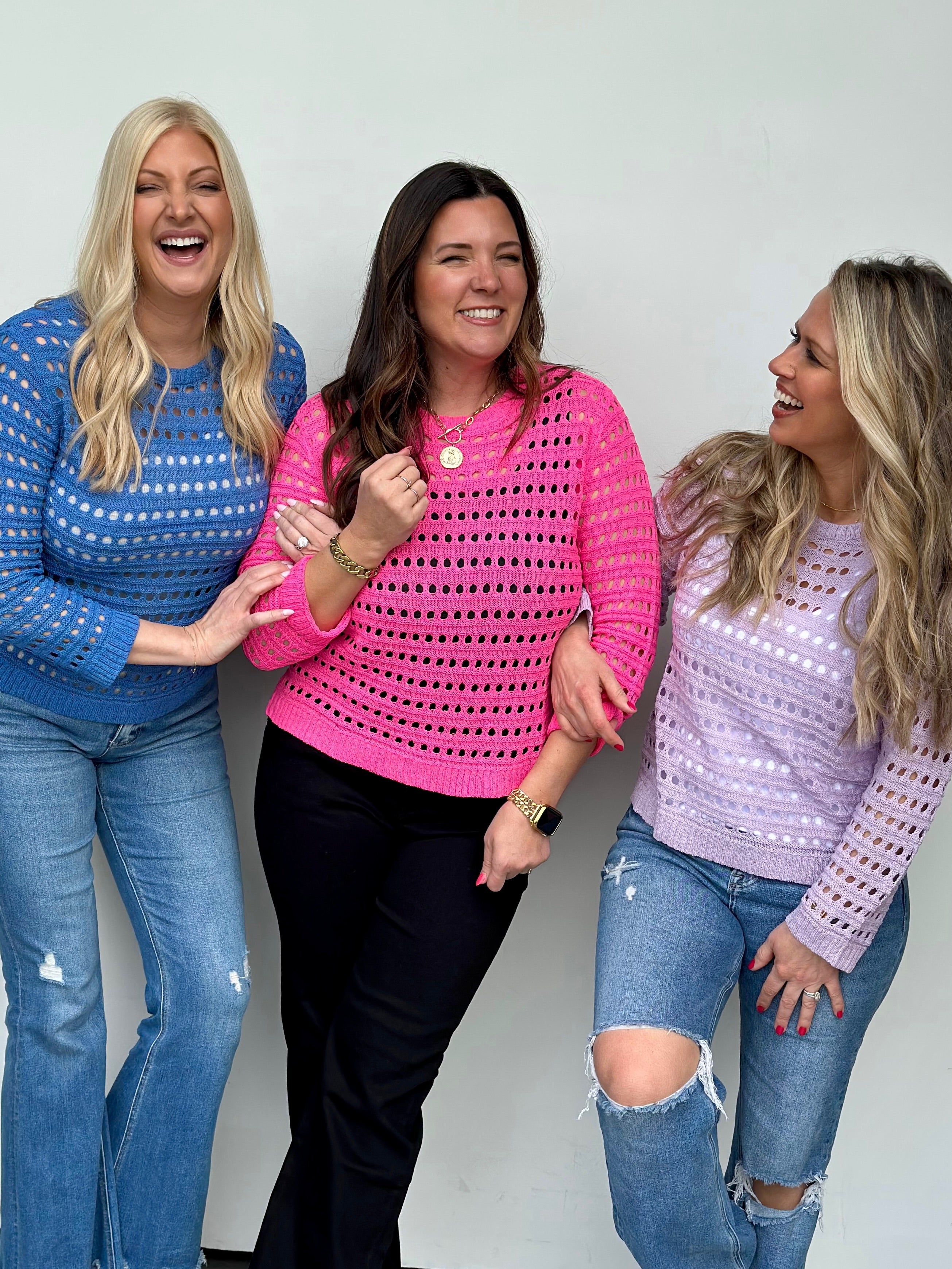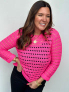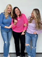 Layer this breezy open-knit sweater over your favorite cami for effortless spring style. The lightweight crew neck comes in hot pink, lavender, and blue—perfect for those warmer days when you want just a touch of coverage. Runs true to size with 7/8 length sleeve so grab your usual fit and get ready to turn heads.