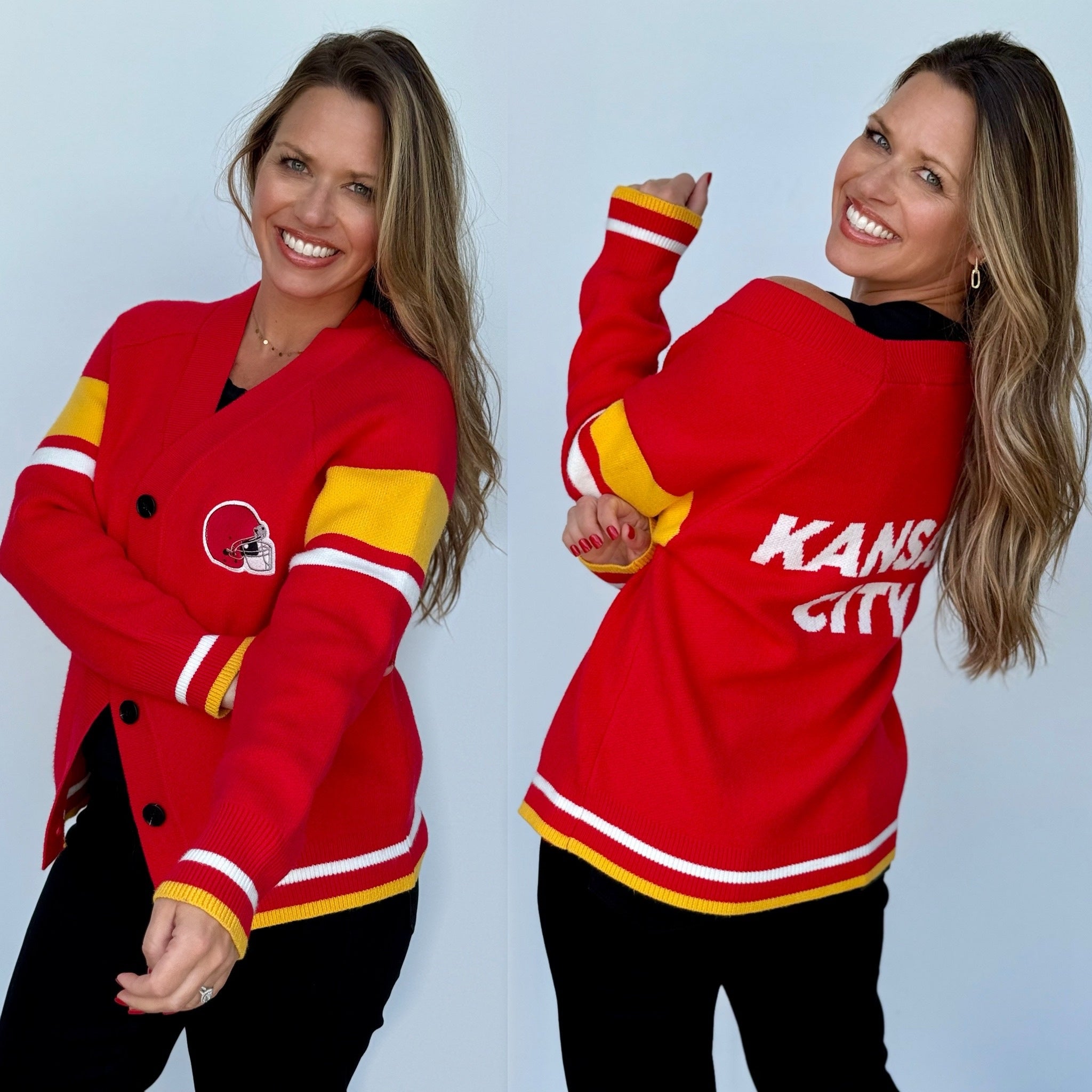 This oversized button-up cardi brings that vintage varsity vibe with a bold KC twist. Made in a vibrant game-day red with gold and white striping on the sleeves and hem, it features a detailed embroidered helmet patch on the front and “Kansas City” across the back for the ultimate fan finish. ❤️ Please size down one size!