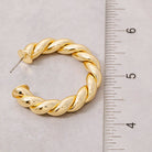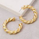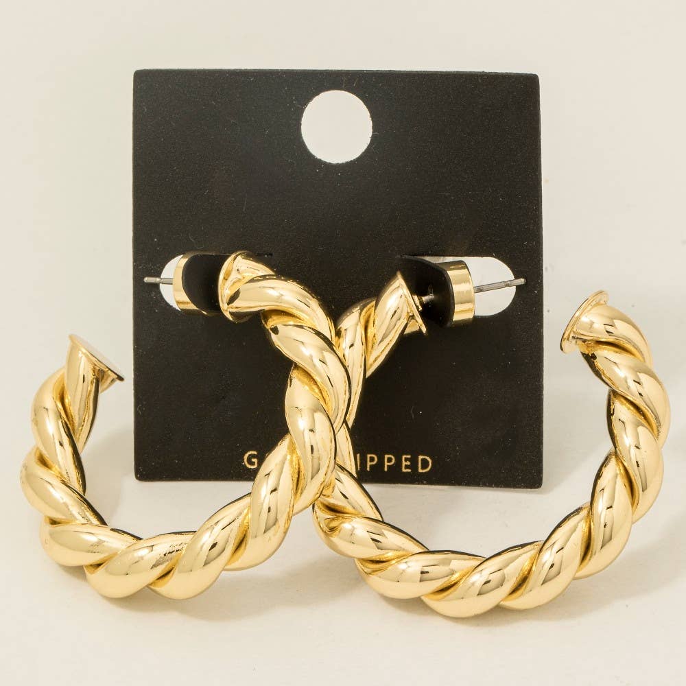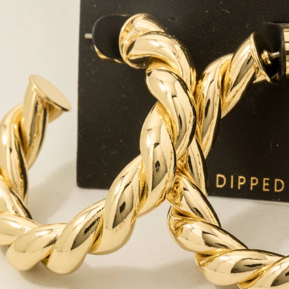This pair of hoop earrings displays a vibrant gold dipped thick twisted style. Witness the perfect fusion of style and functionality as this pair of hoop earrings effortlessly complements your lifestyle. MADE IN CHINA 95% BRASS 5% SSP