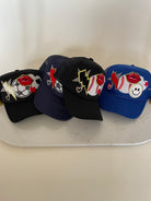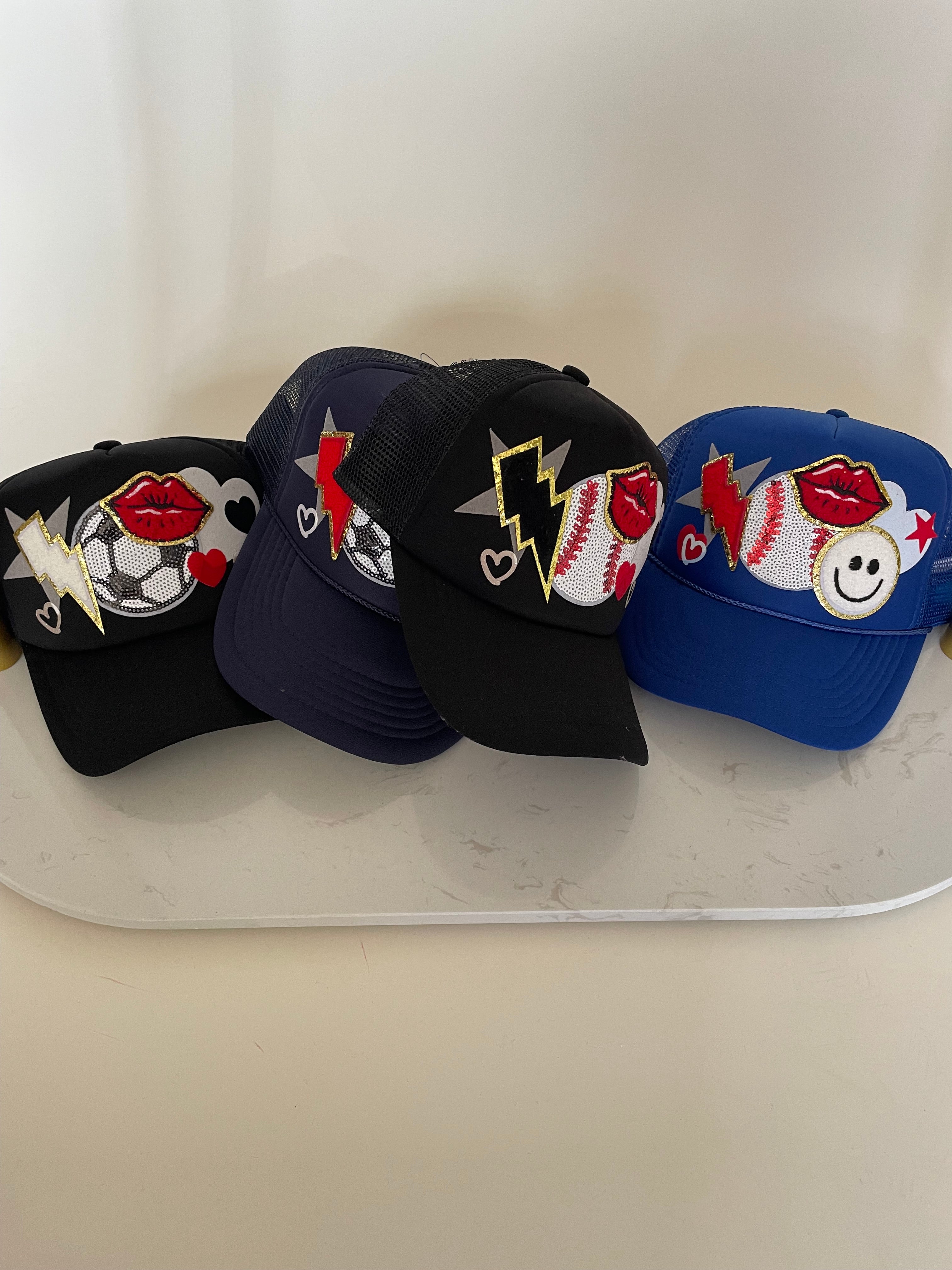 Mesh Back Trucker Style Hat with a Plastic Snap Closure. This trucker's hat design features a sequined patch of a variety of sports balls in the center, along with several other overlapping patches of stars, hearts, lightning bolts, lips, and smileys in a variety of types. This accessory is perfect for any game day event.