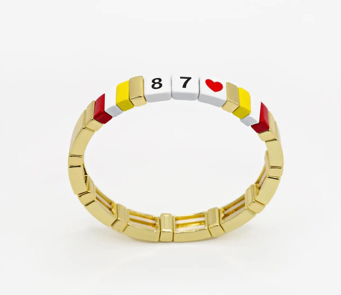 This bracelet is crafted with tile enamel, which offers flexibility and wearability. These Kansas City themed tile enamel stretch bracelets are bold, unique, and you can purchase a 15, 87 or KC. (see other listings) These tile bracelets combine style, fashion, and a nod to this vibrant city. Show off your love for the city, and or players with this eye-catching piece of jewelry. Appox. 7"