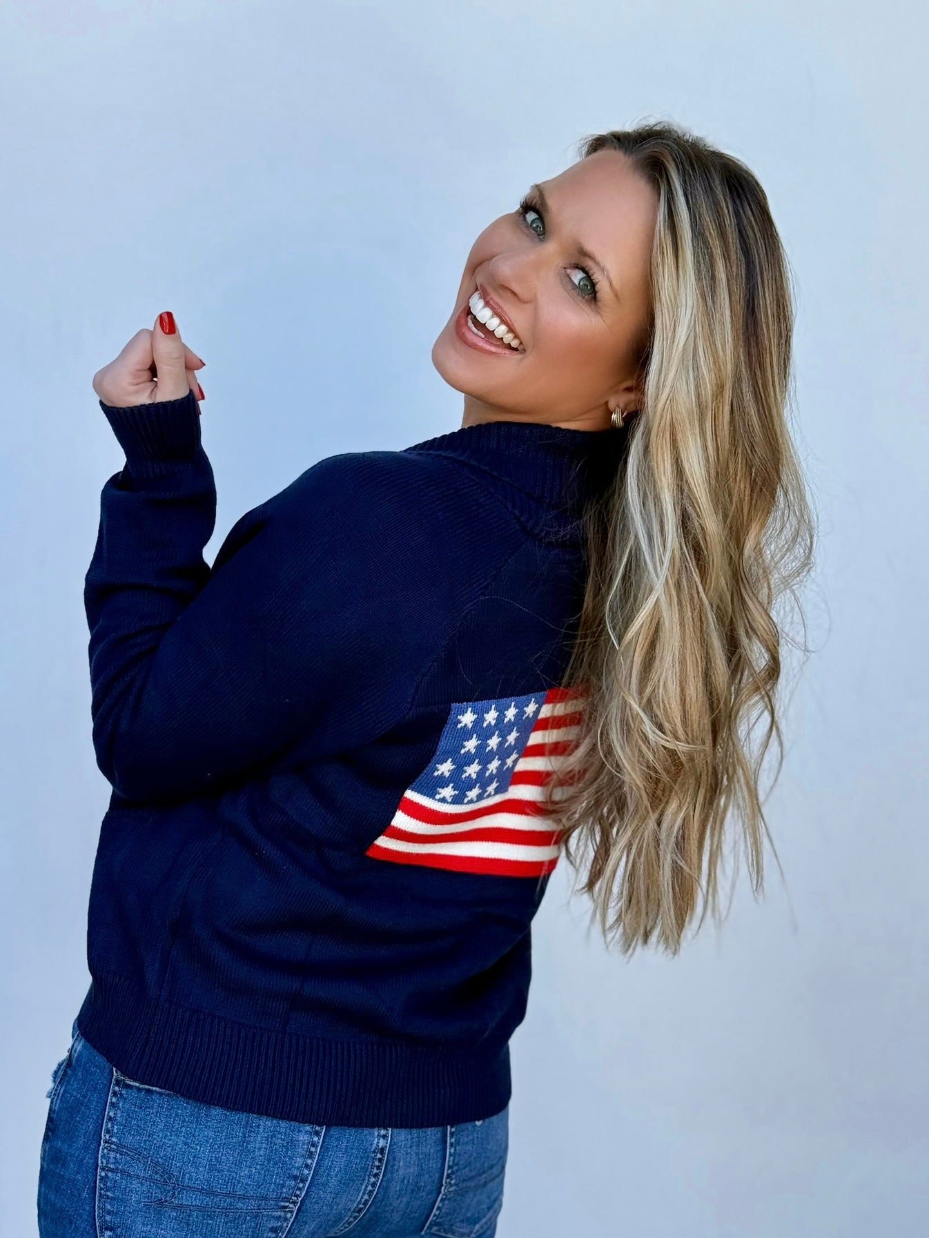 Wrap yourself in patriotic style with this American Flag Cardigan. Featuring a bold flag design on the back, practical front pockets for your essentials, and a classic button closure, it's the perfect layer for any occasion. True to size for a comfortable, flattering fit. Show your colors with confidence and flair.