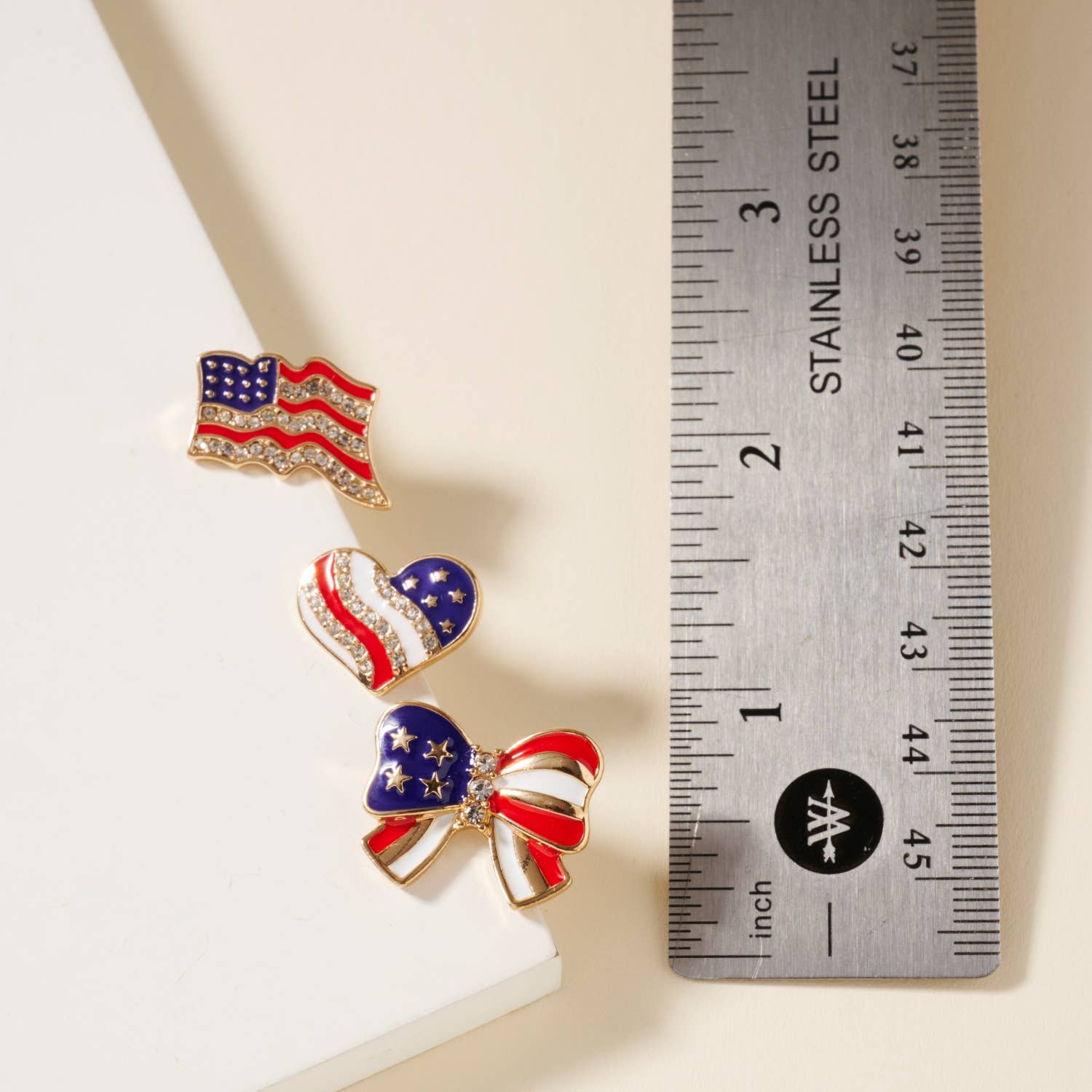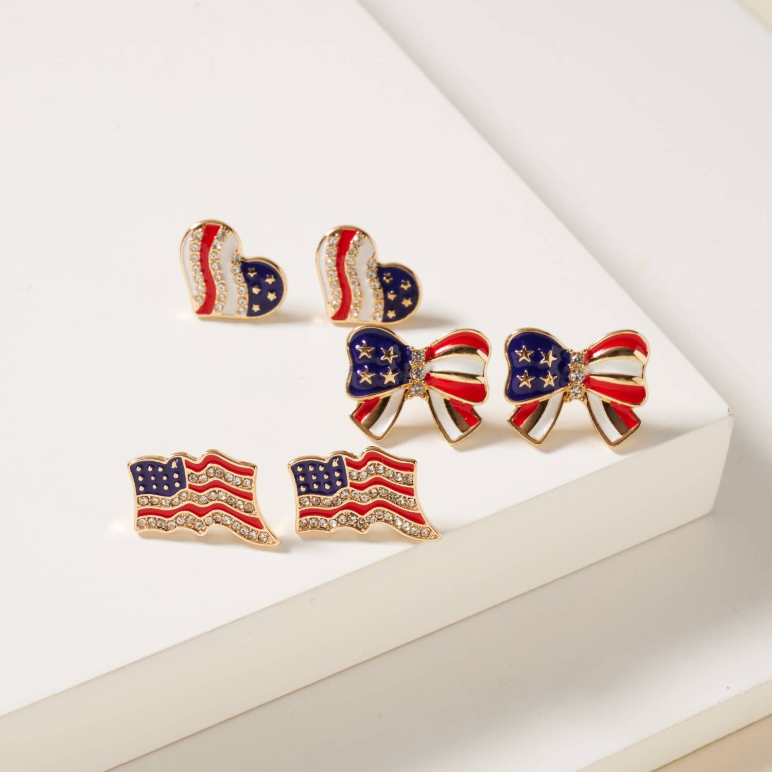 Show off your patriotism with this set of USA Flag Pattern Stud Earrings. These stylish earrings feature the iconic flag pattern and includes three different shapes: heart, bow and flag , decorated with rhinestones. Approx: 0.25 ~ 0.5"