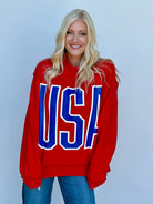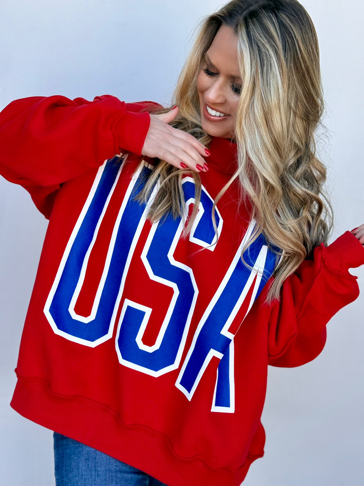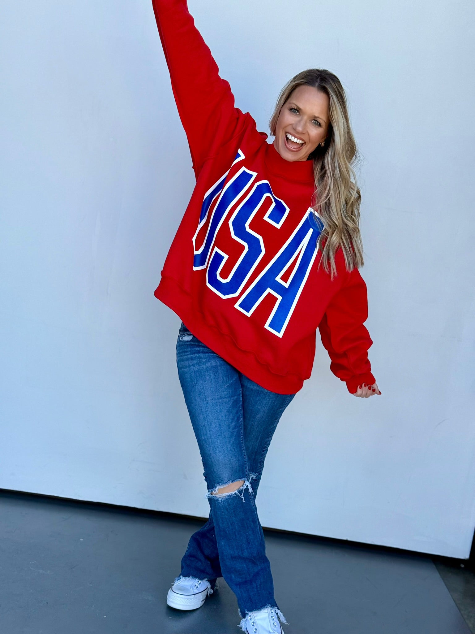 The PERFECT red mock neck that has an inside-out look that screams "I meant to do this!" (and we believe you). It's perfect for any event where you want to be darling and patriotic all at the same time!!!!!
