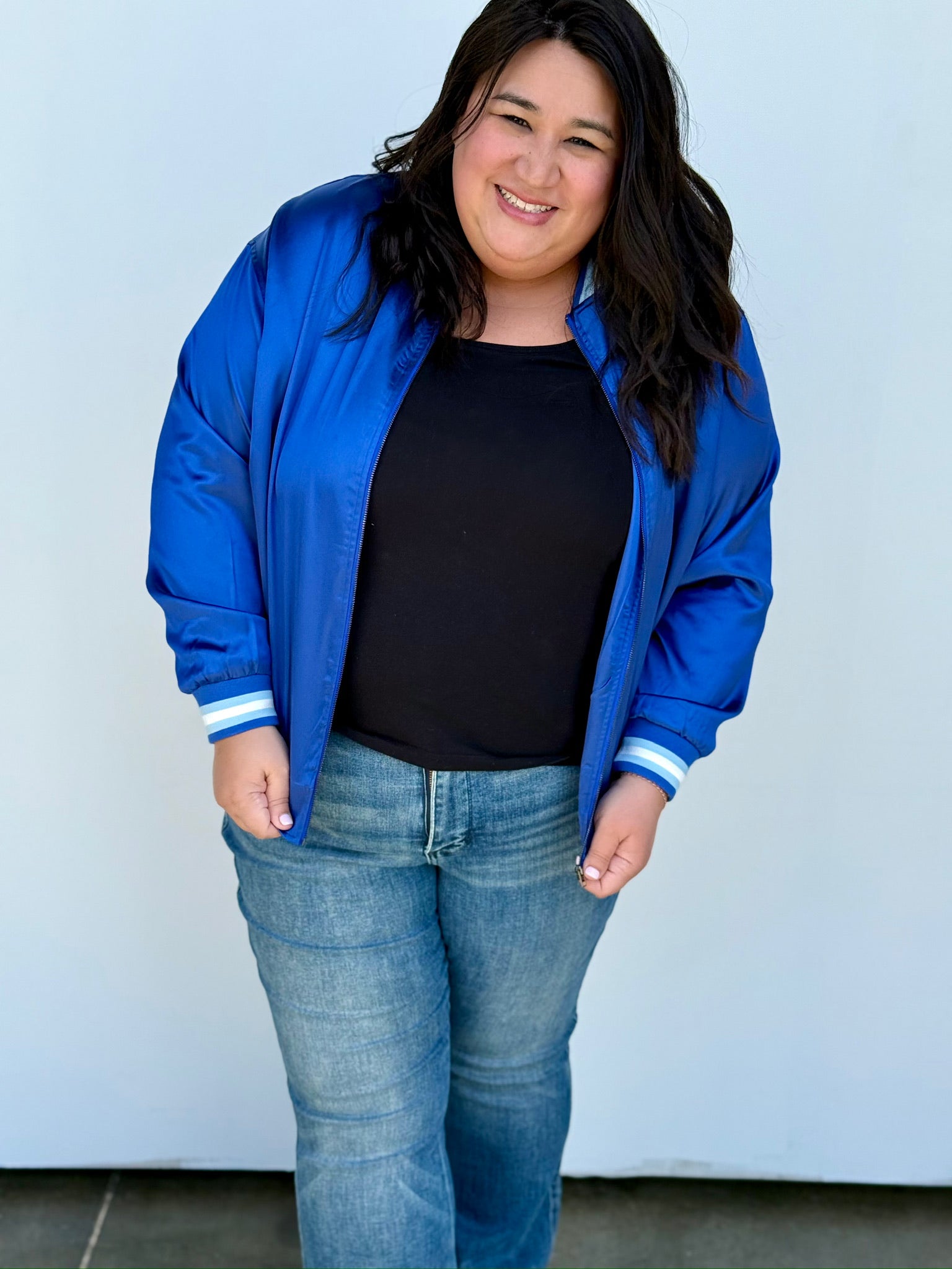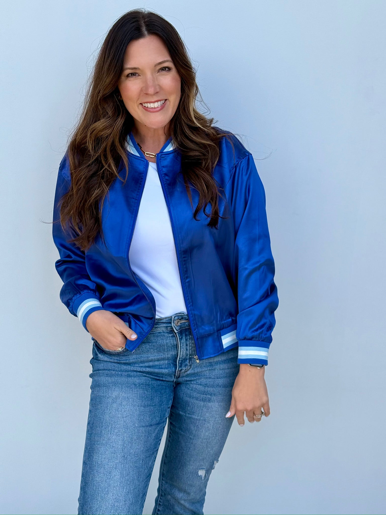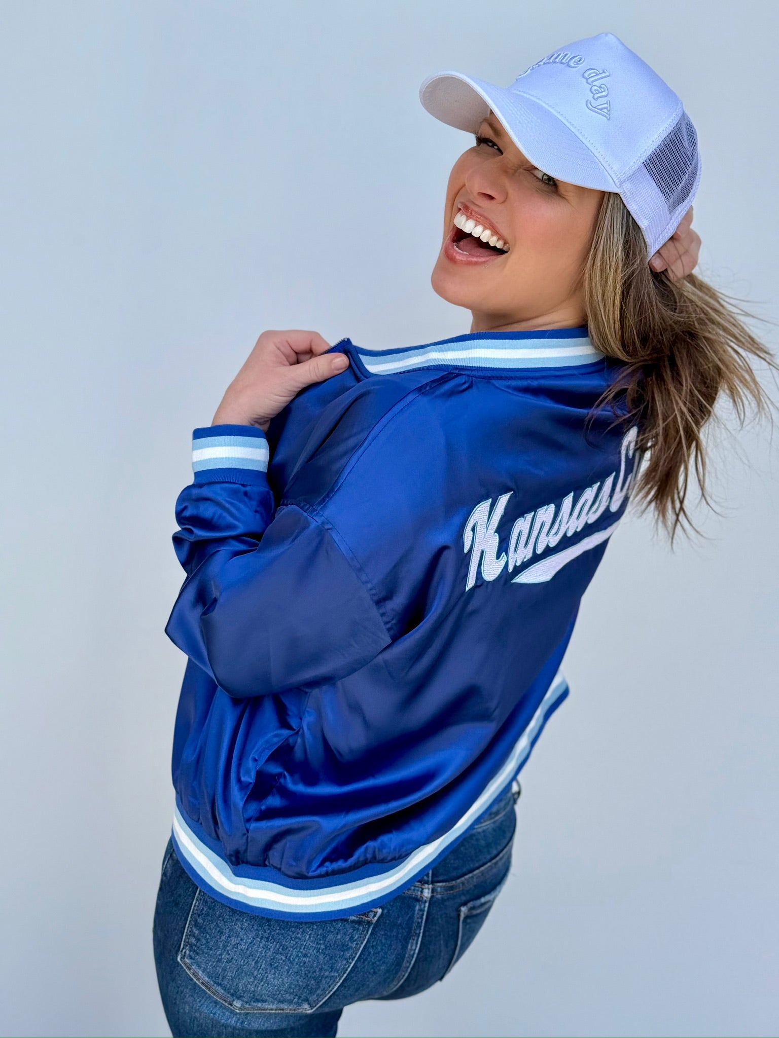 This stunning bomber features a rich, vibrant blue color that’s perfect for showing off your Kansas City baseball pride!! Designed with a classic retro vibe, it’s perfect whether you’re headed to a game, out with friends, or just want to elevate your everyday look! And YES, it has pockets!