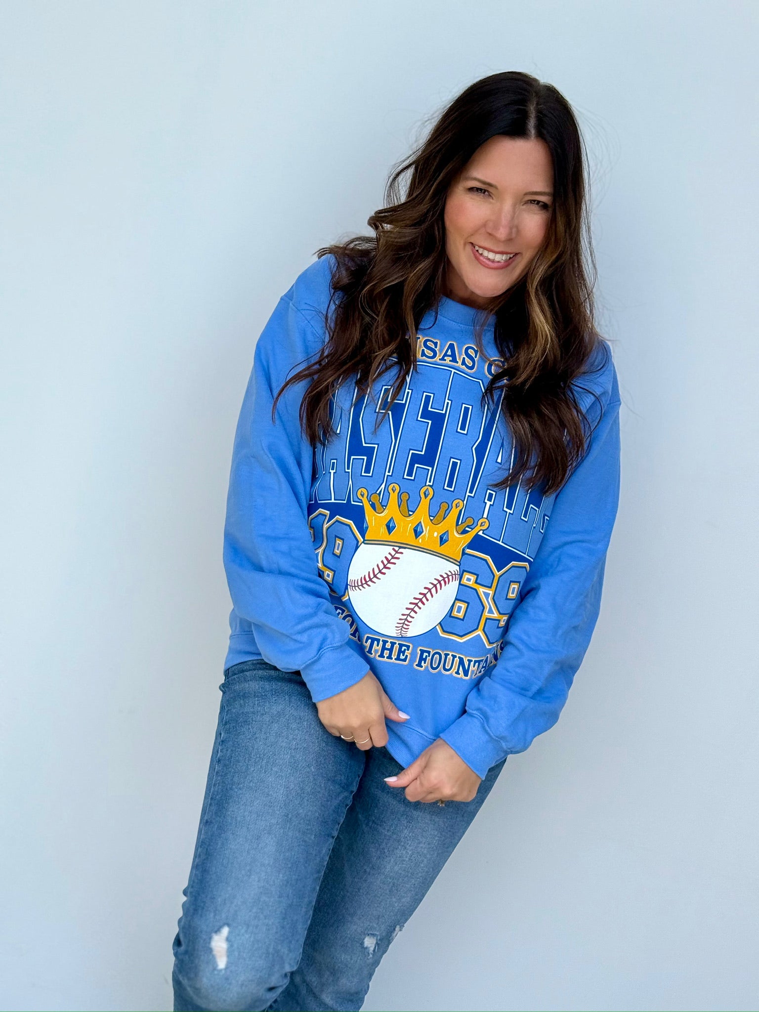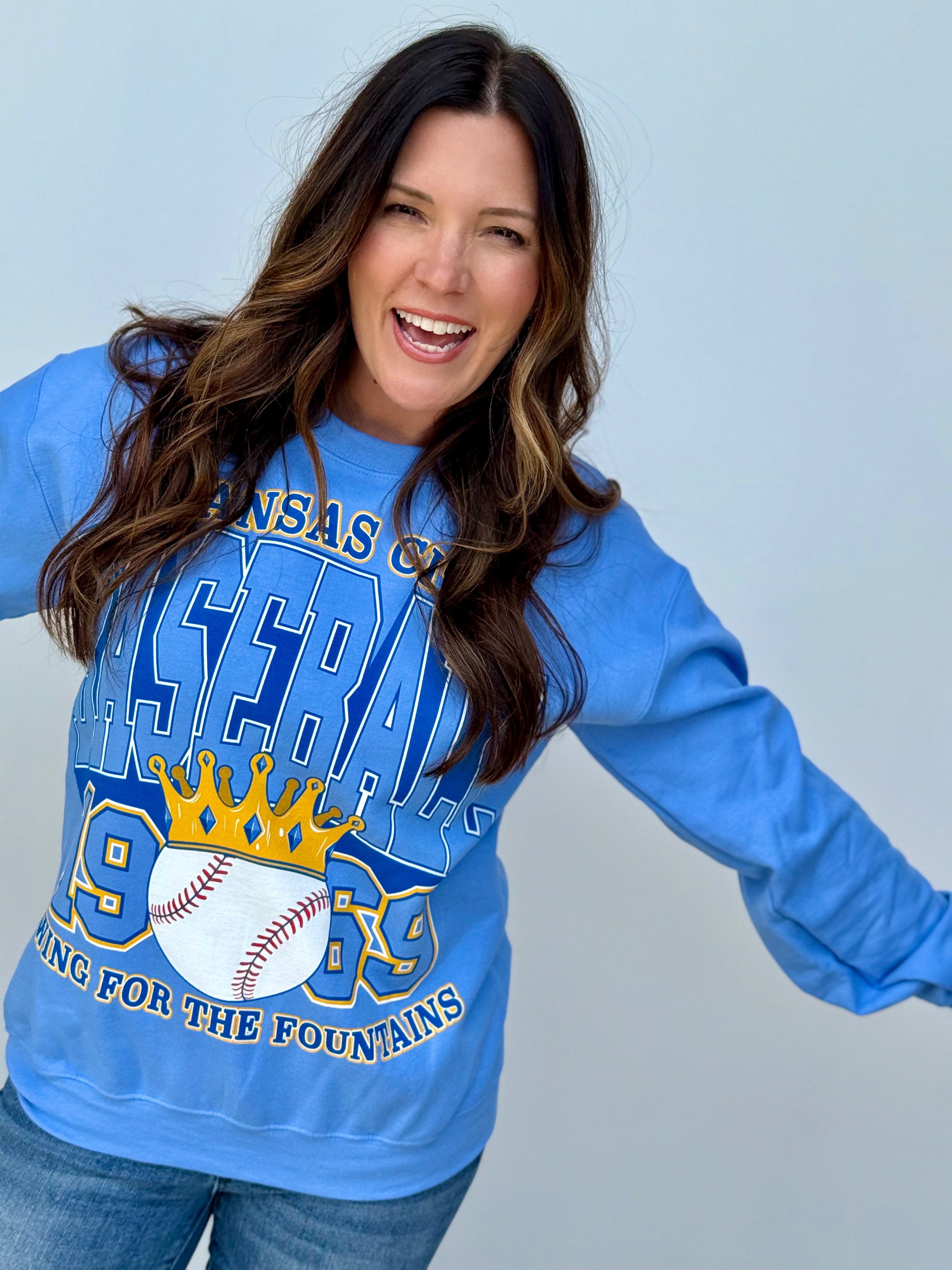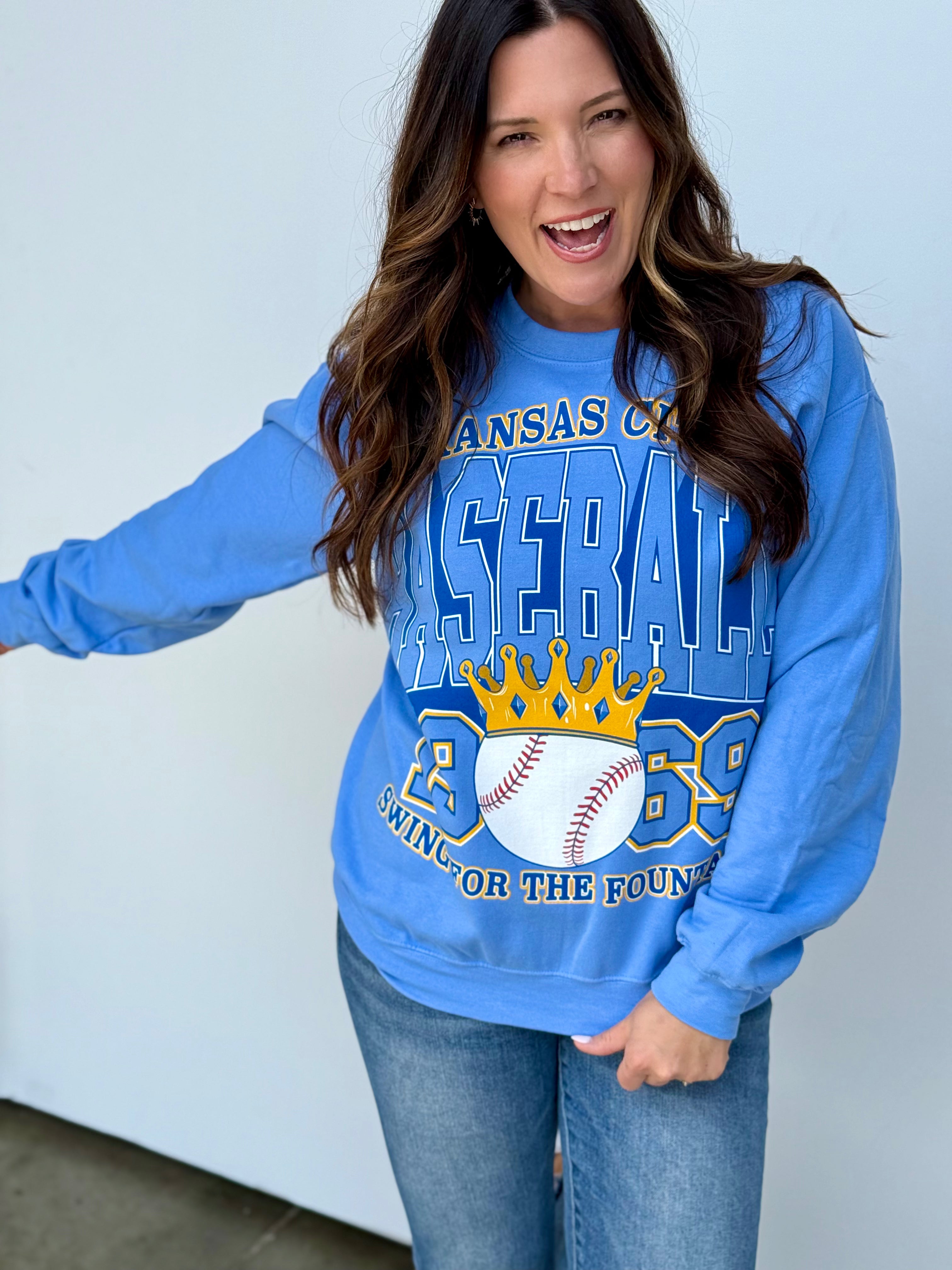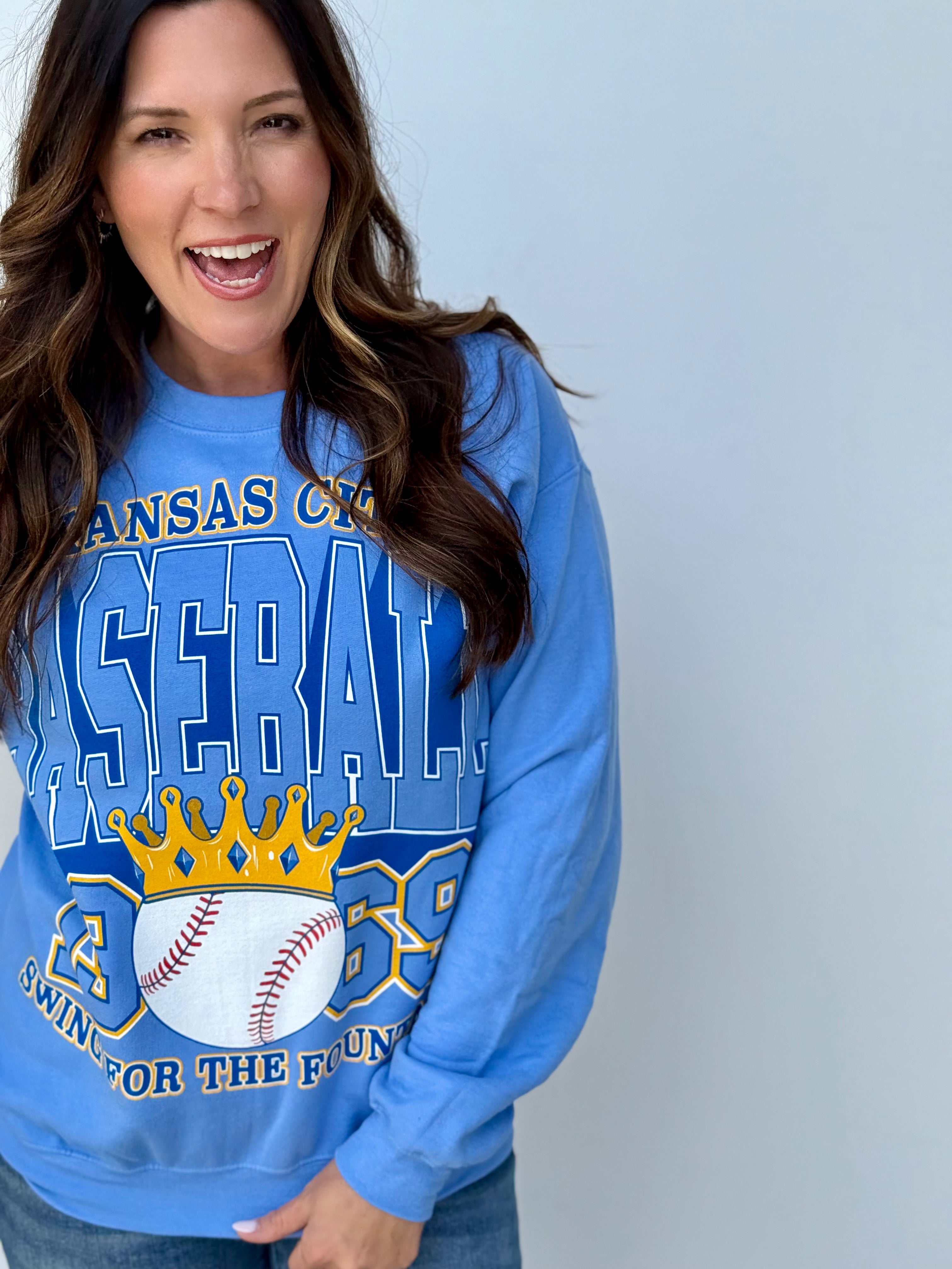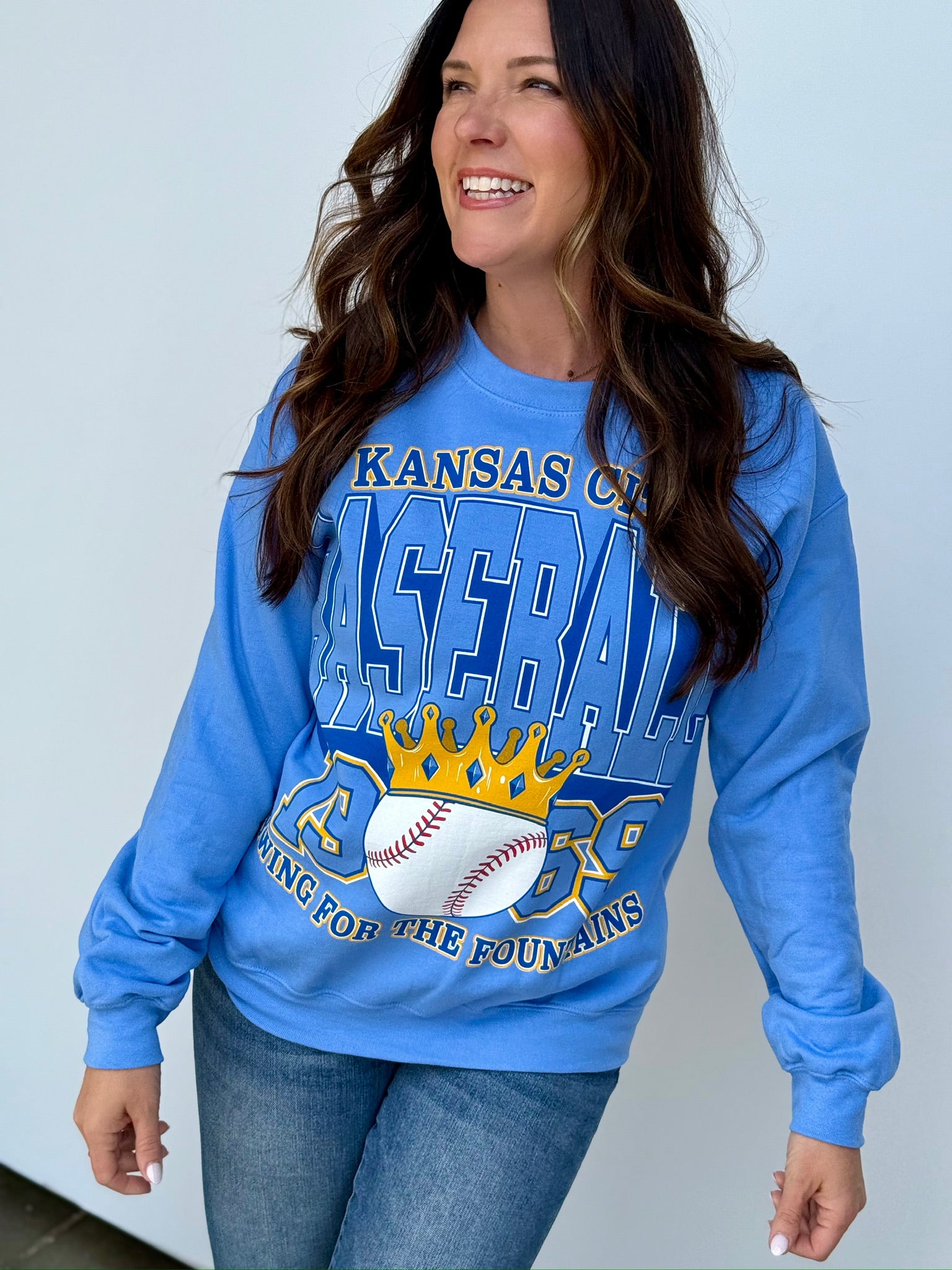 Score a home run with style in our Swing For The Fountains sweatshirt! Show off your love for KC baseball as you swing for the famous fountains. Stay cozy and trendy at the same time with this unique sweatshirt. It's sure to be a hit!