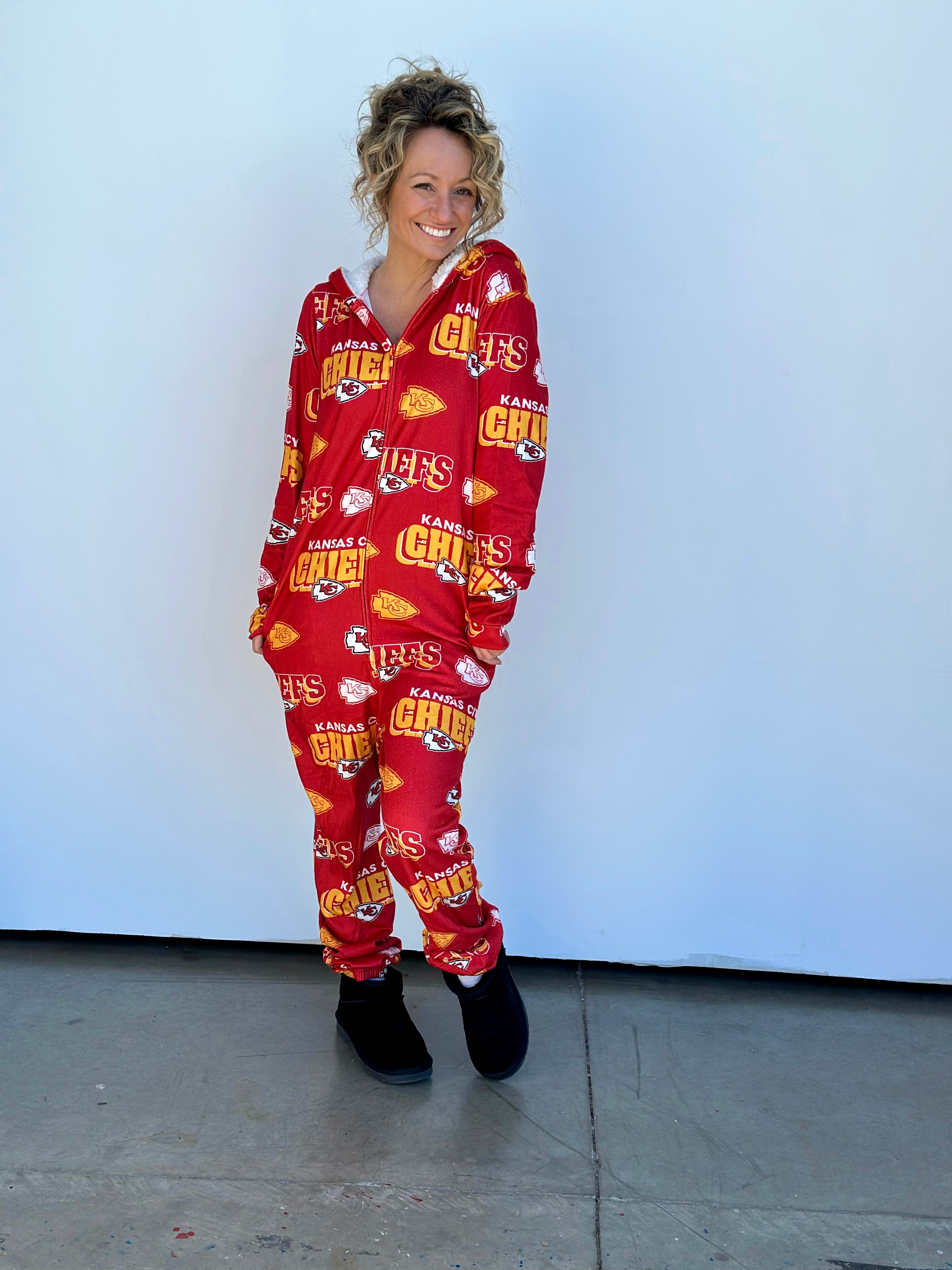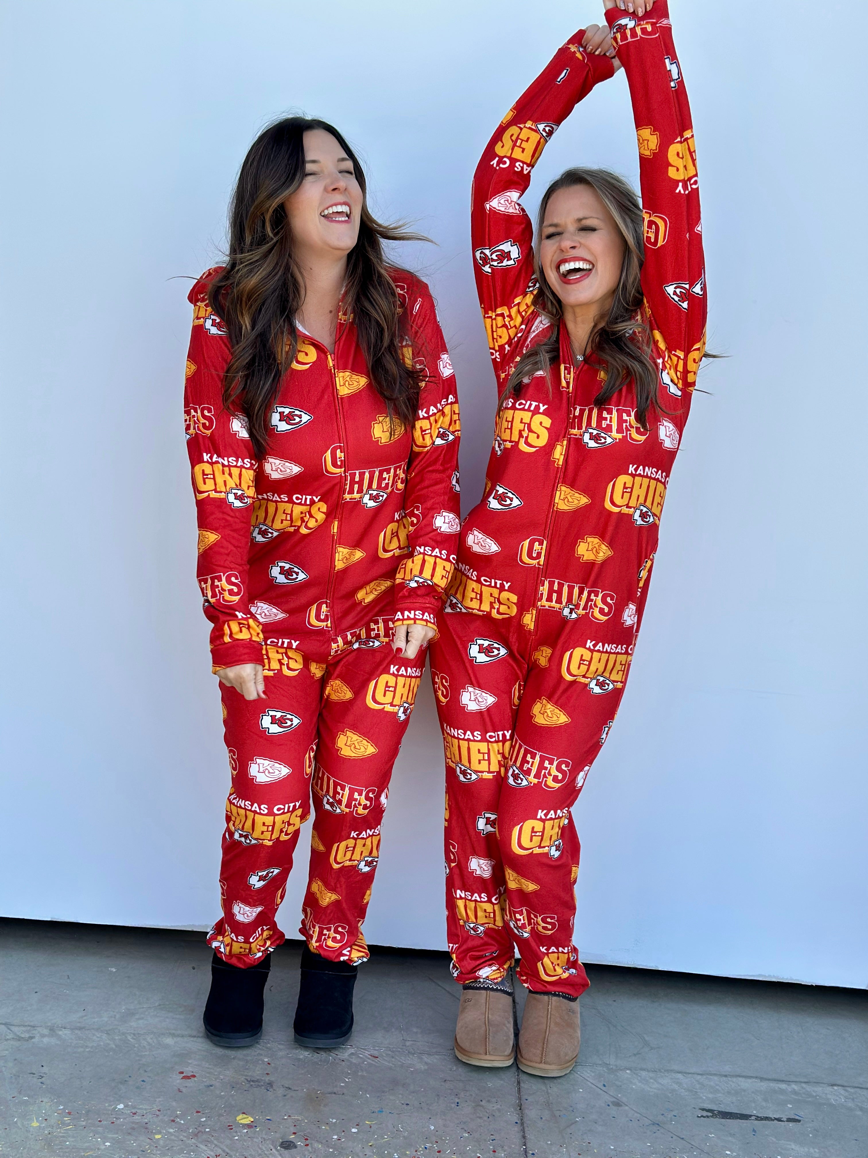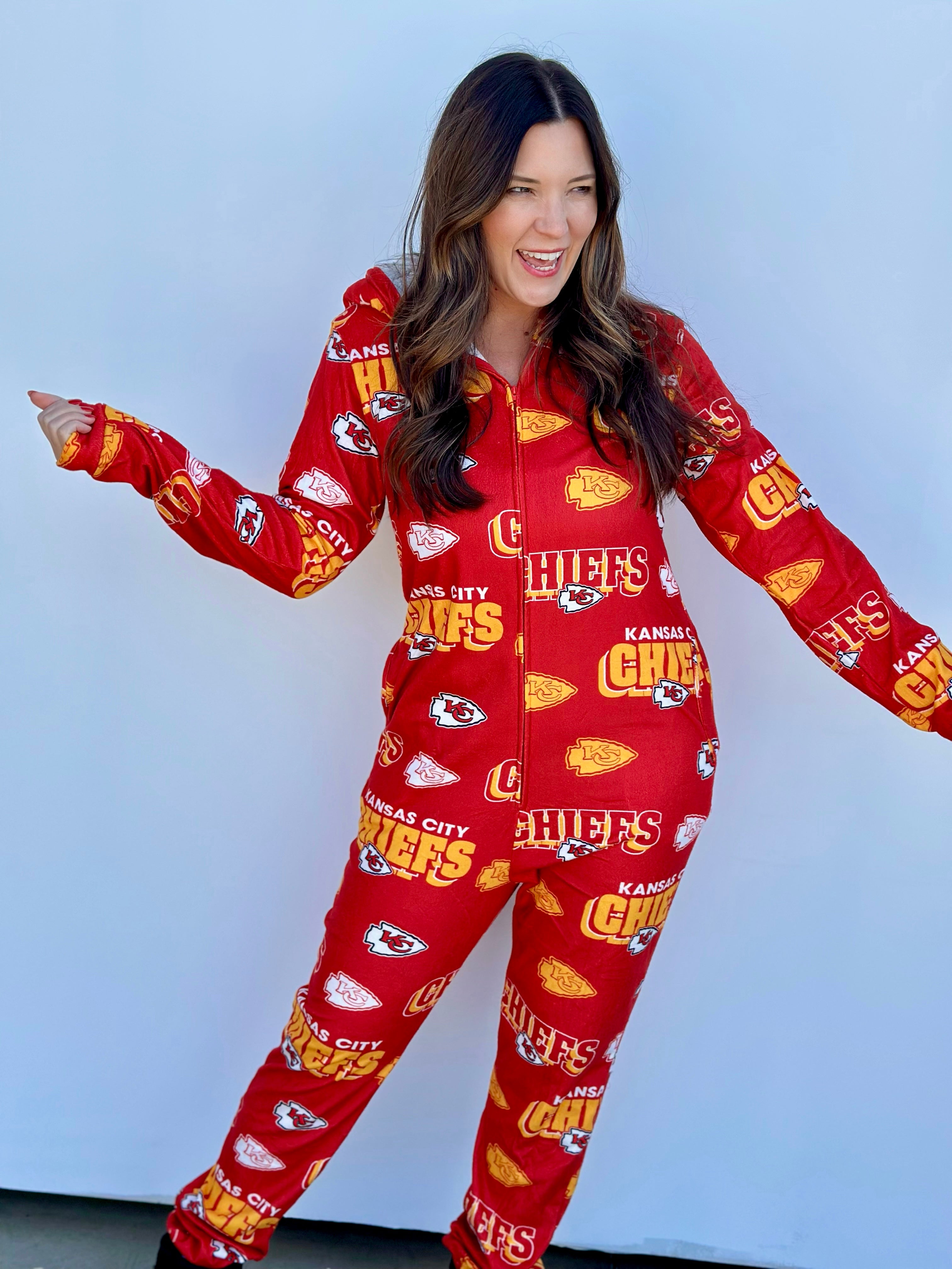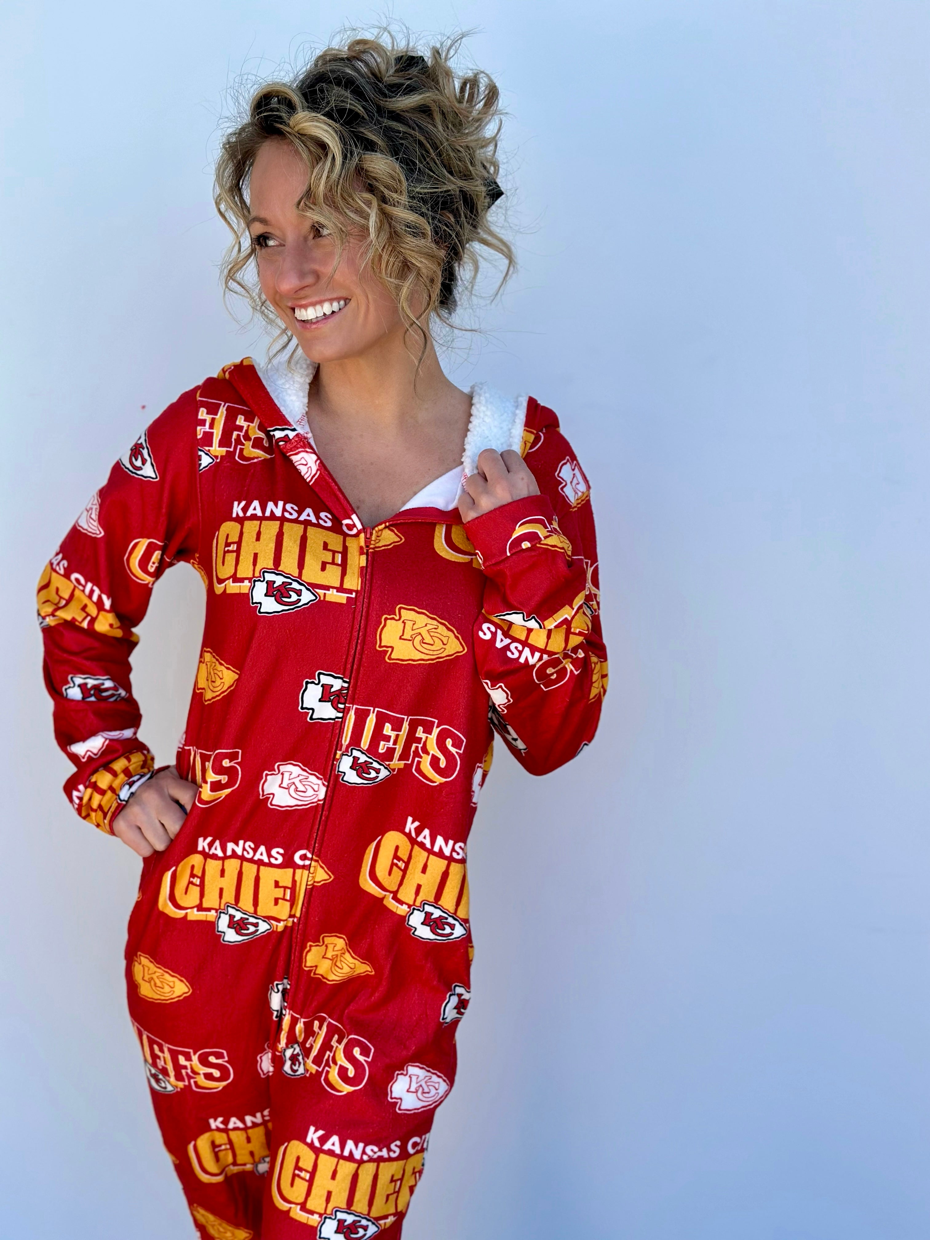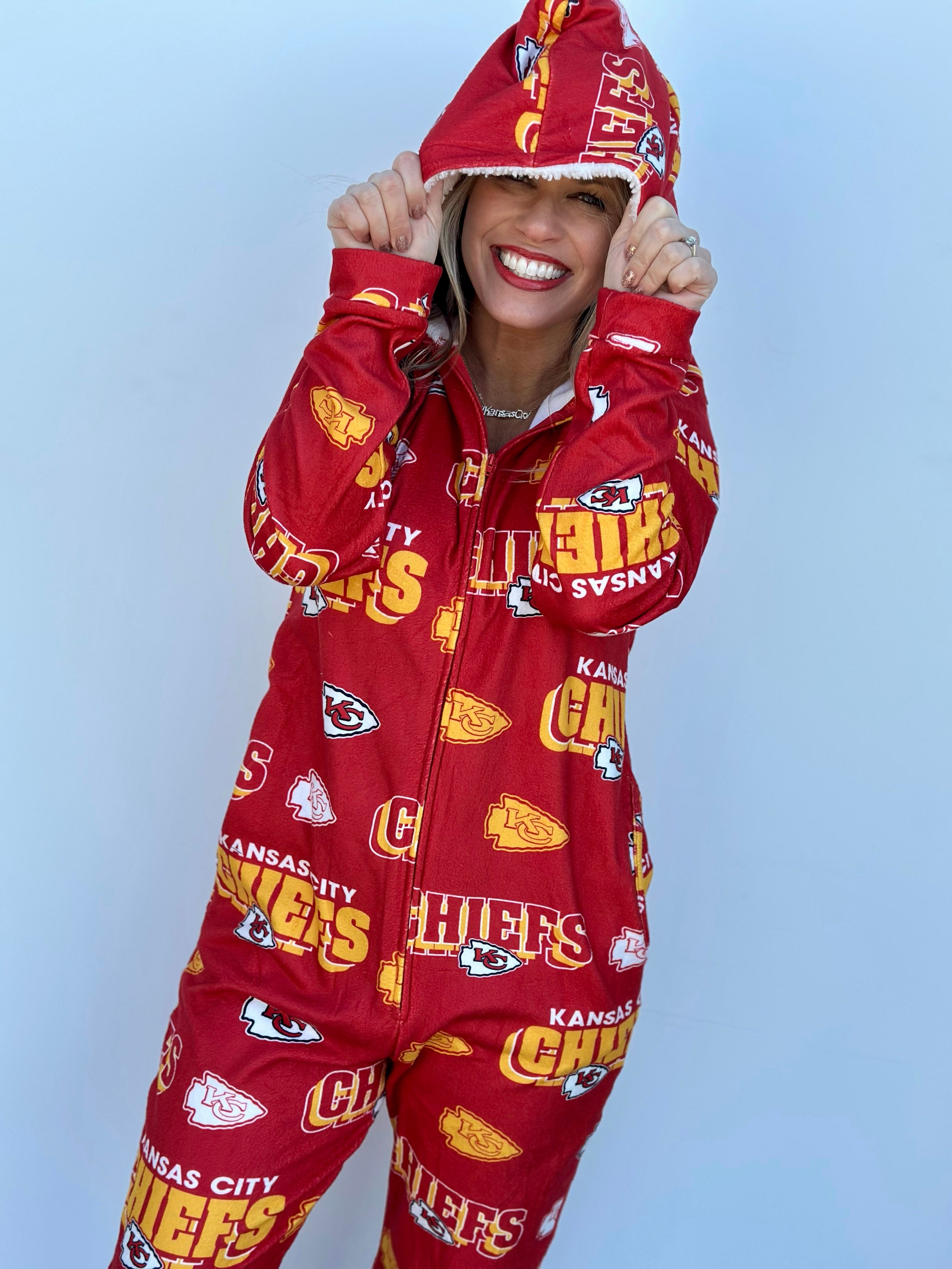 Stay warm and cozy while repping your Kansas City Chiefs with this OFFICALLY LICENSED Microfleece Full-Zip Union Suit. Made from an ultra-soft microfleece blend, this union suit features allover team graphics sublimated into the fabric for a look that's both stylish and cozy. The Sherpa-lined hood adds extra warmth, making it perfect for chilly nights spent cheering on our Kansas City Chiefs!