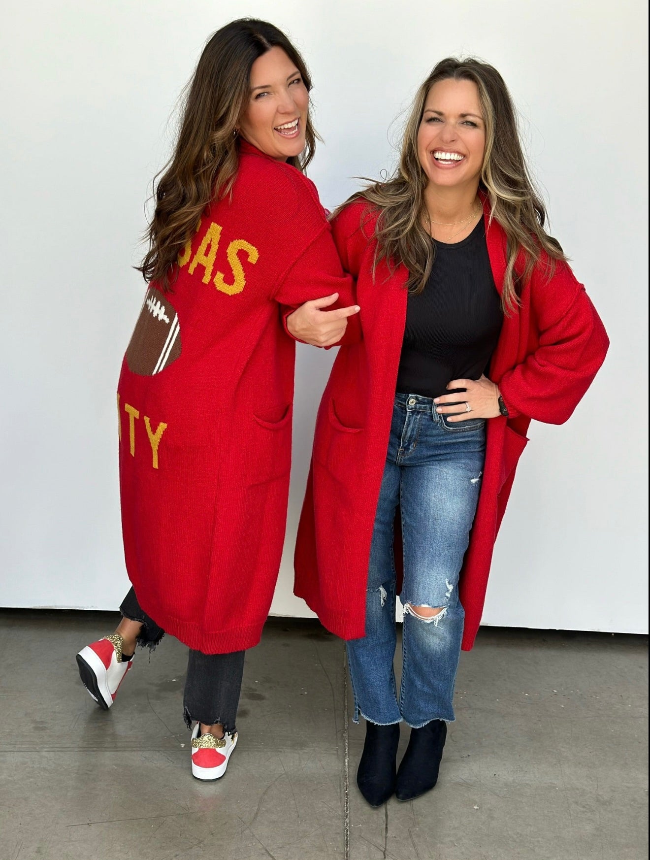 Celebrate your Kansas City football pride with our exclusive long cardigan! Perfect for layering on game day or any day you want to show your team spirit. Made with high-quality materials, this cardigan ensures comfort and style.