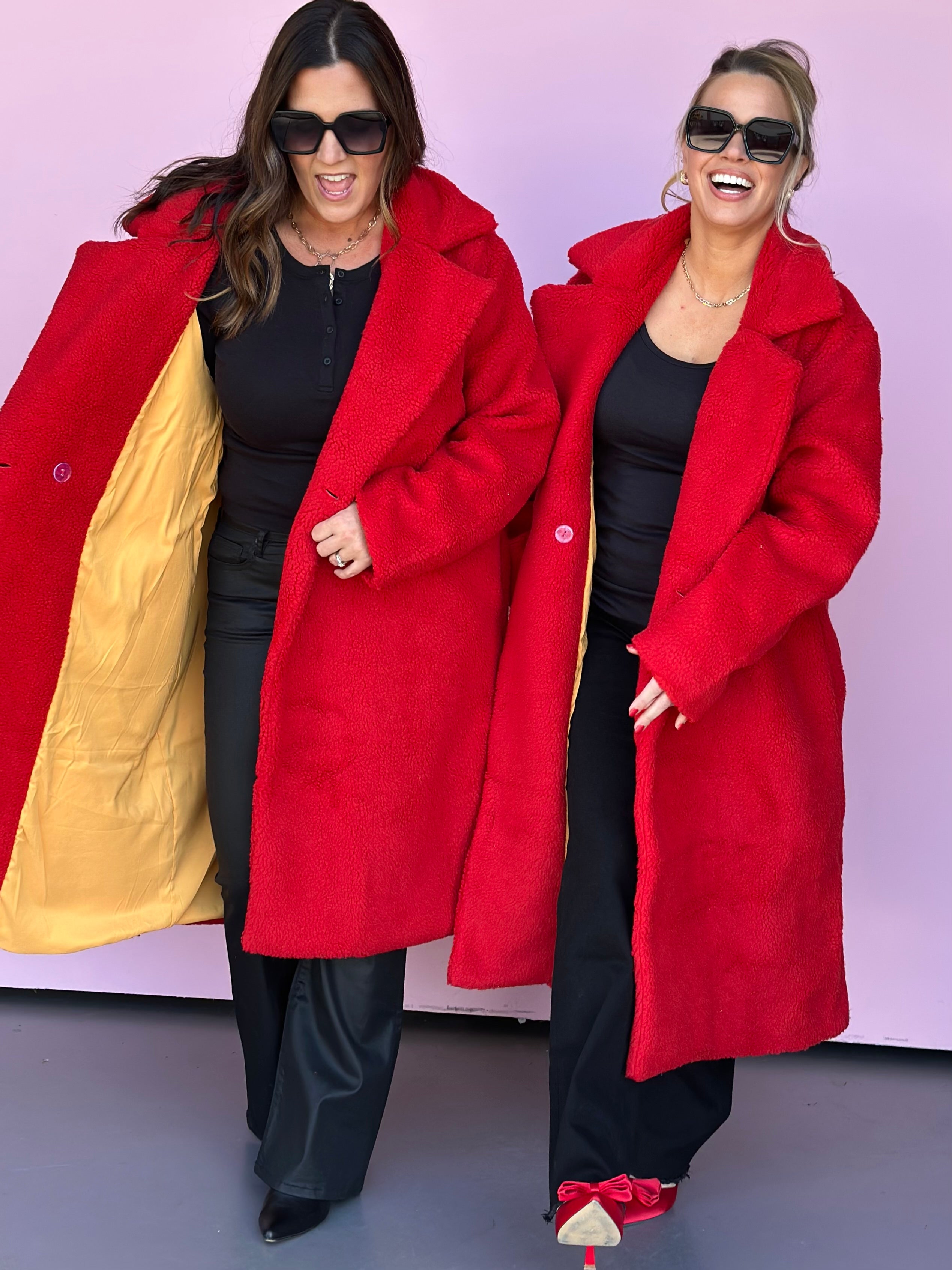 Game day just got a whole lot cozier! The Hogan Sherpa Coat wraps you in plush red sherpa with a cheerful yellow lining that peeks through—because staying warm doesn't mean sacrificing style. This long-cut beauty features functional pockets to stash your essentials and a classic button closure for easy layering. Whether you're cheering from the stands or bundling up for fall adventures, this cozy companion keeps you snug and ready for anything. Runs oversized.