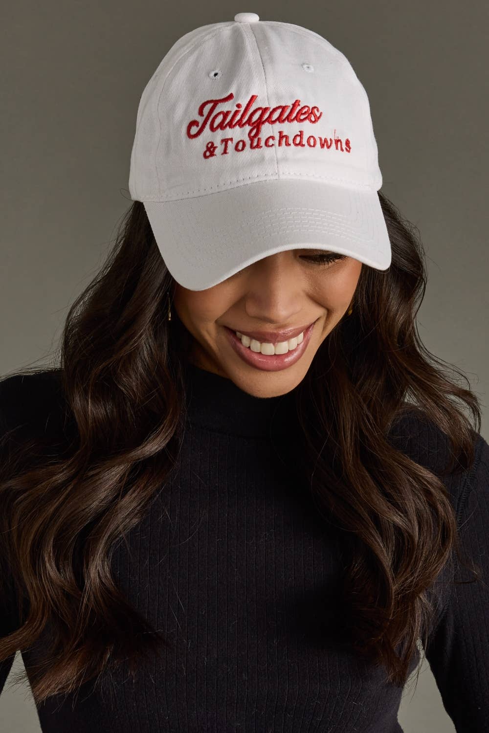 White baseball hat Red "Tailgates & Touchdowns" embroidered on front 100% Cotton Adjustable closure Min. Qty. 2