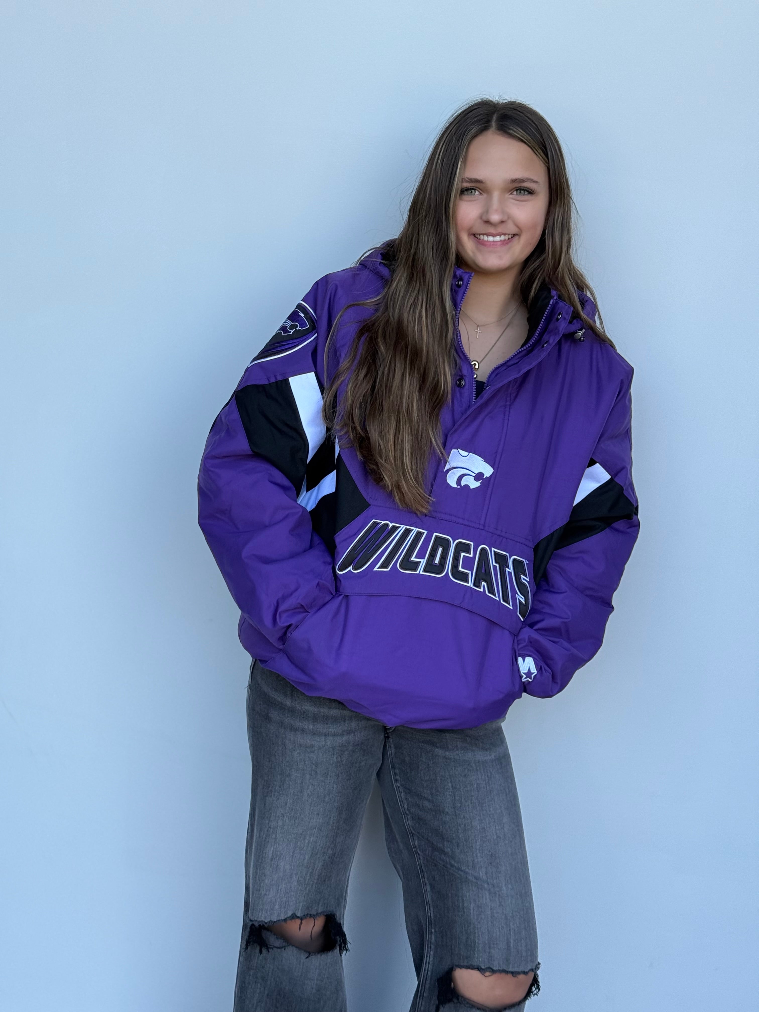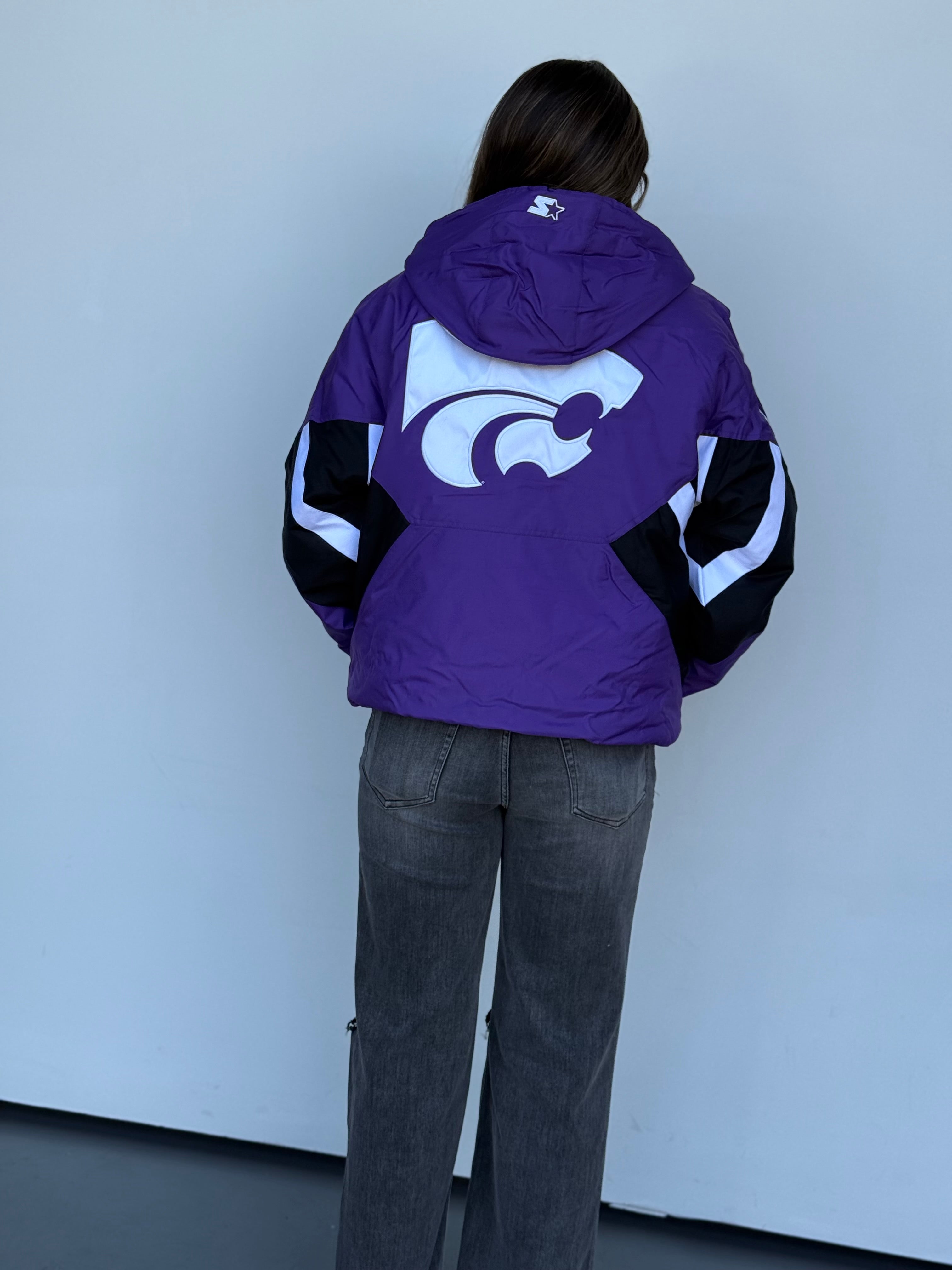 Rock your team spirit in this classic Starter 1/4 zip coat featuring the iconic K-State colors. The detachable hood gives you versatility for any game day mood, while functional pockets keep your essentials close. An adjustable hood and elastic waistband ensure a customized fit that moves with you. Also, has a side zipper for added room. Perfect for die-hard fans who want comfort without compromising style. Note: Men's sizing runs generous—consider sizing down if you prefer a snugger fit.