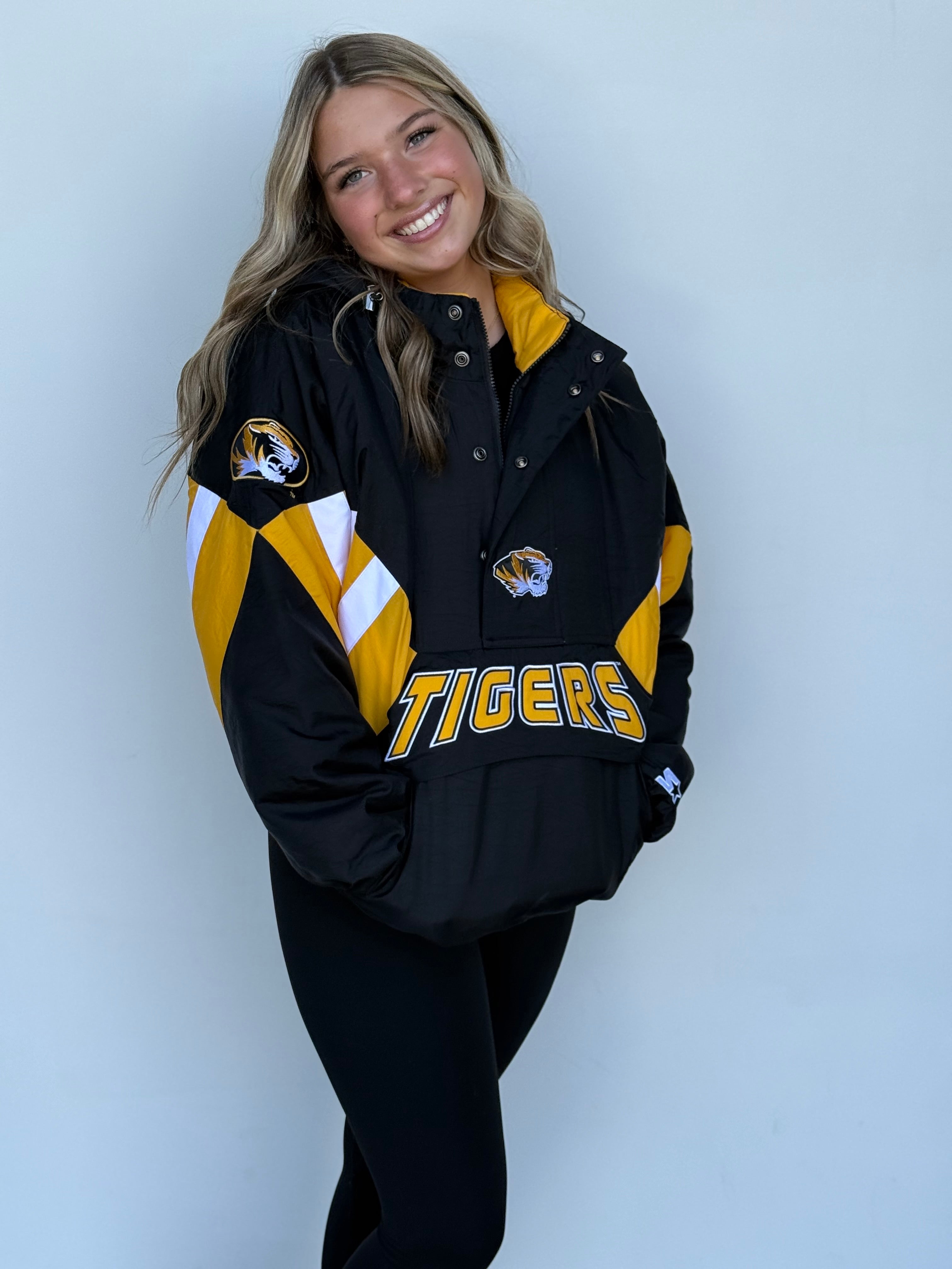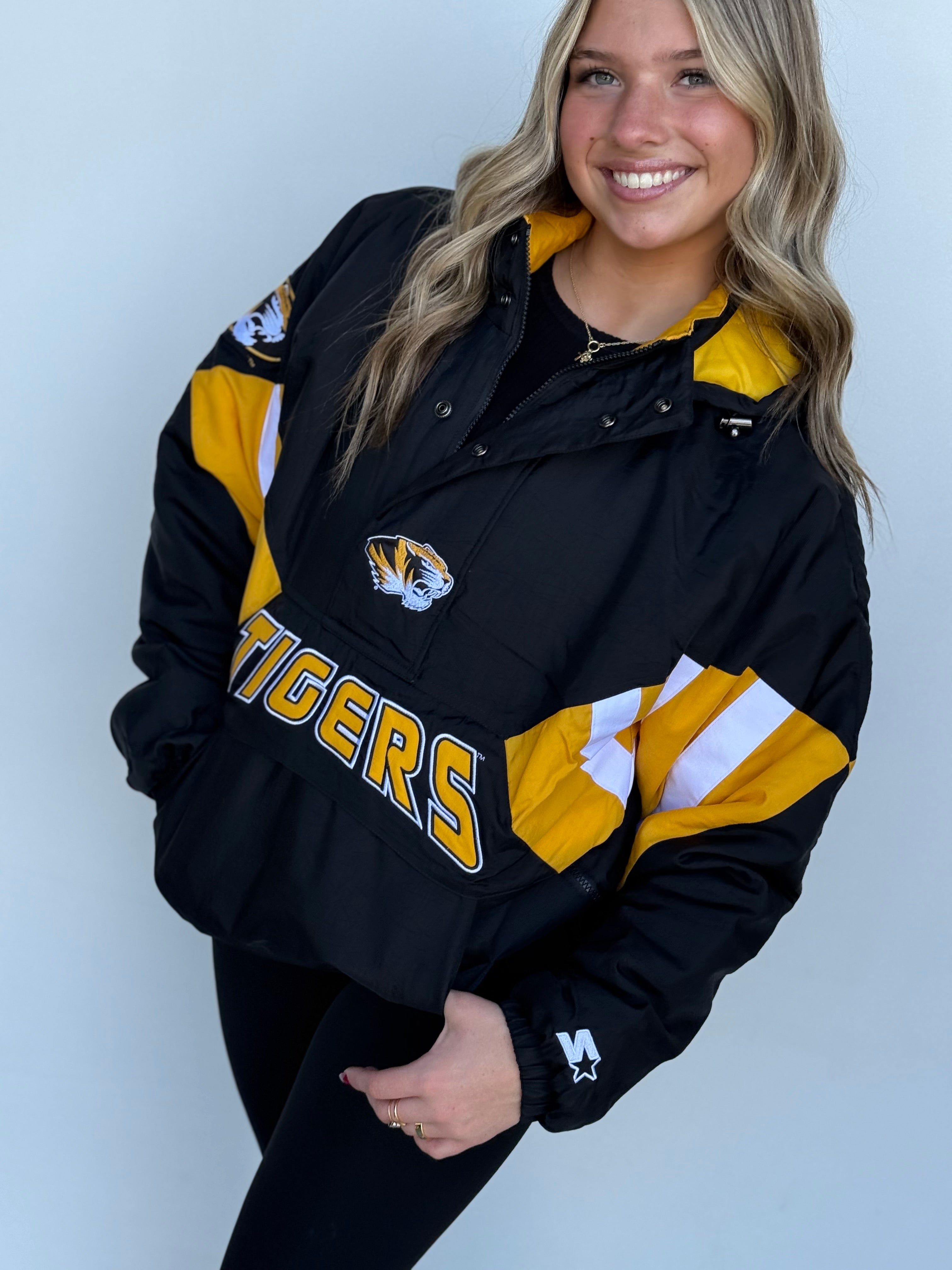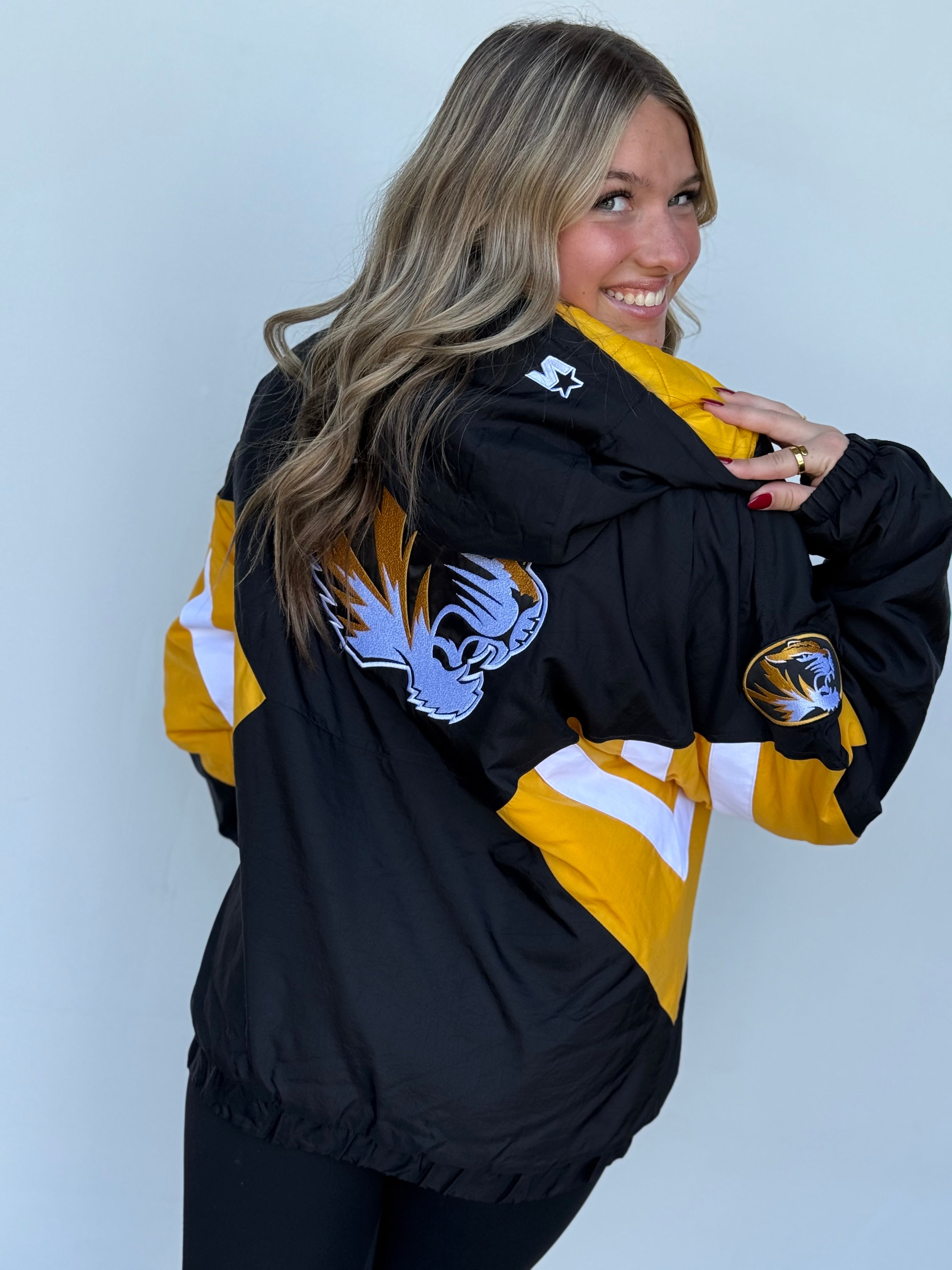 Rock your team spirit in this classic Starter 1/4 zip coat featuring the iconic Mizzou colors. The detachable hood gives you versatility for any game day mood, while functional pockets keep your essentials close. An adjustable hood and elastic waistband ensure a customized fit that moves with you. Also, has a side zipper for added room. Perfect for die-hard fans who want comfort without compromising style. Note: Men's sizing runs generous—consider sizing down if you prefer a snugger fit.