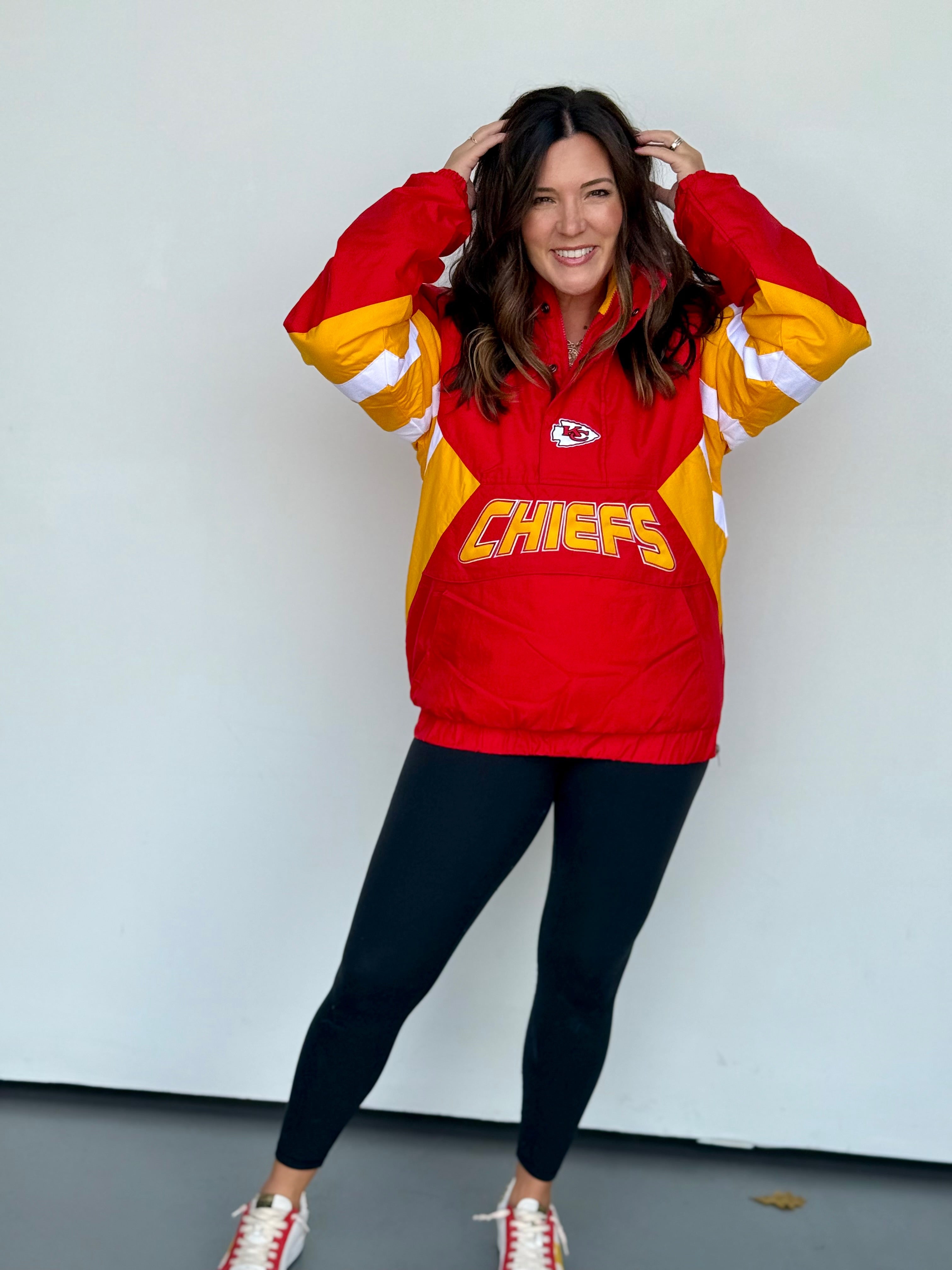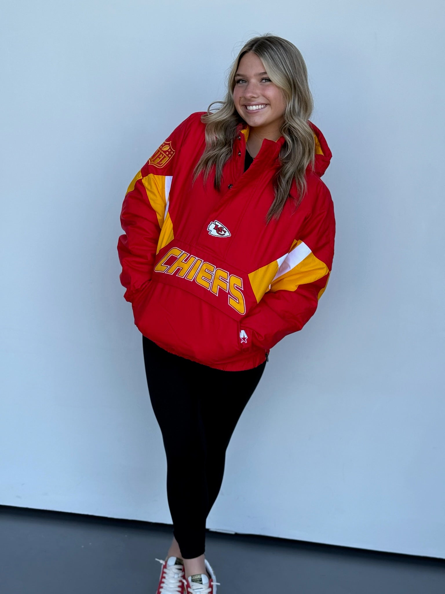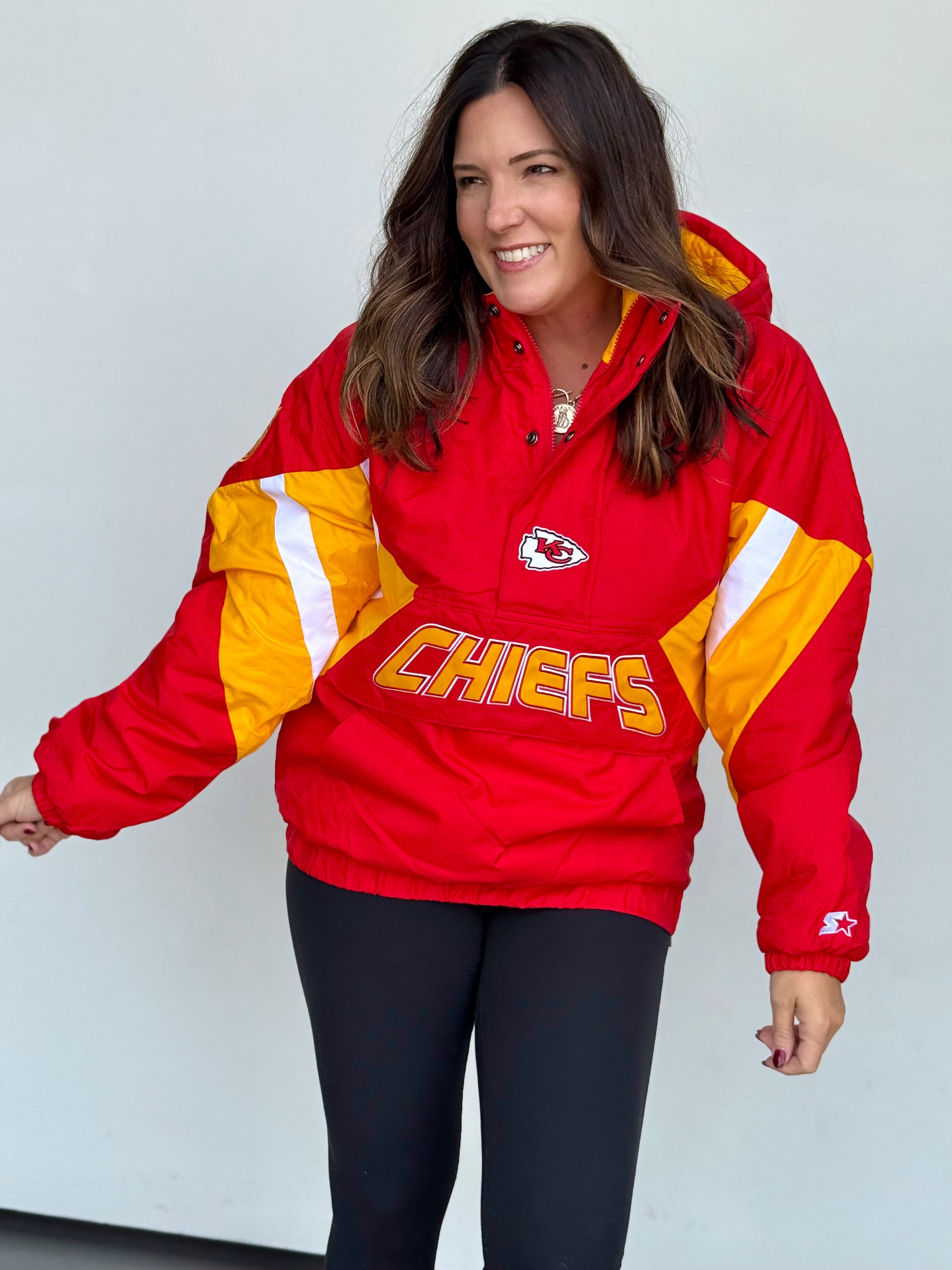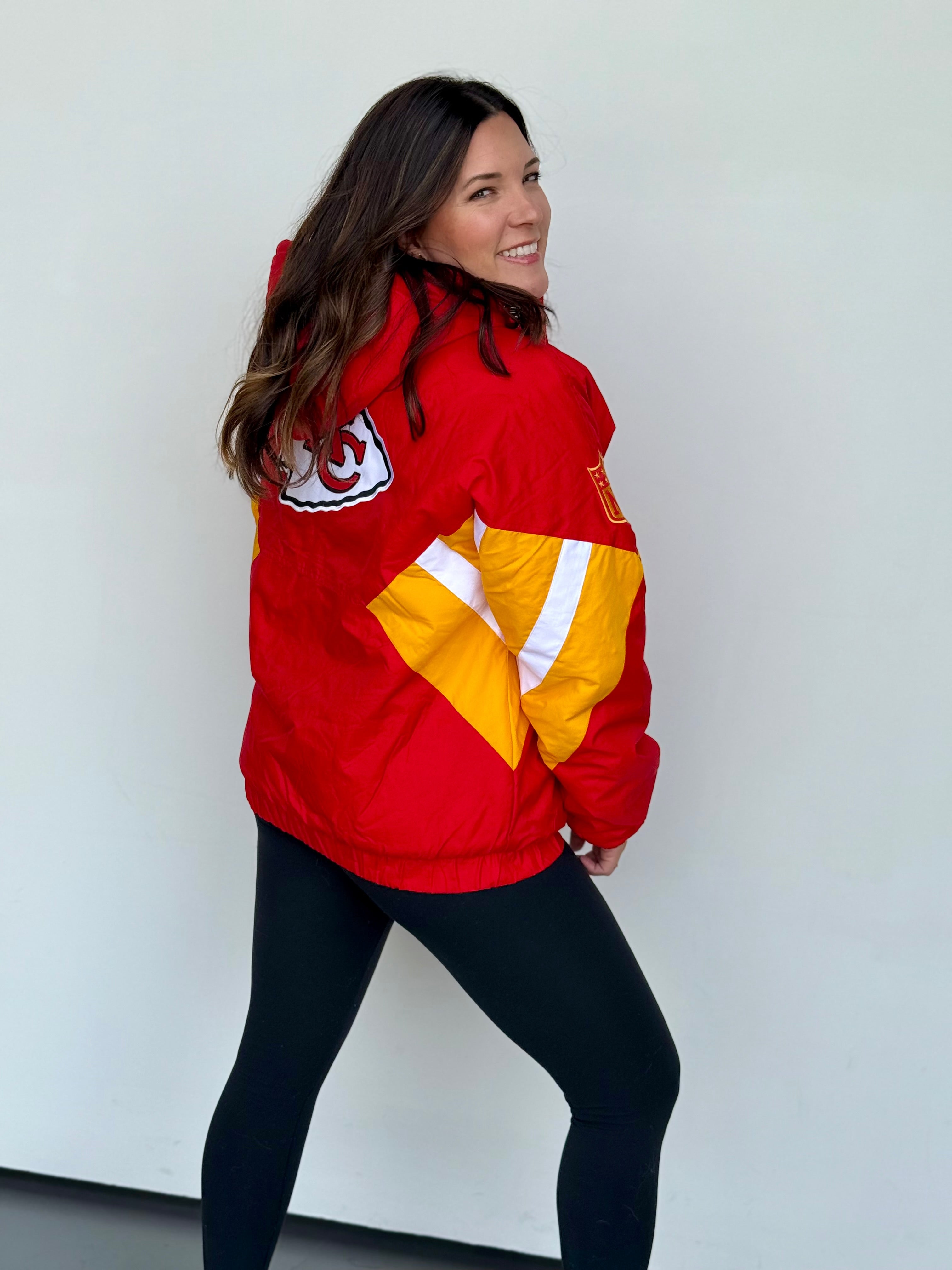 Rock your team spirit in this classic Starter 1/4 zip coat featuring the iconic Chiefs colors. The detachable hood gives you versatility for any game day mood, while functional pockets keep your essentials close. An adjustable hood and elastic waistband ensure a customized fit that moves with you. Also, has a side zipper for added room. Perfect for die-hard fans who want comfort without compromising style. Note: Men's sizing runs generous—consider sizing down if you prefer a snugger fit.