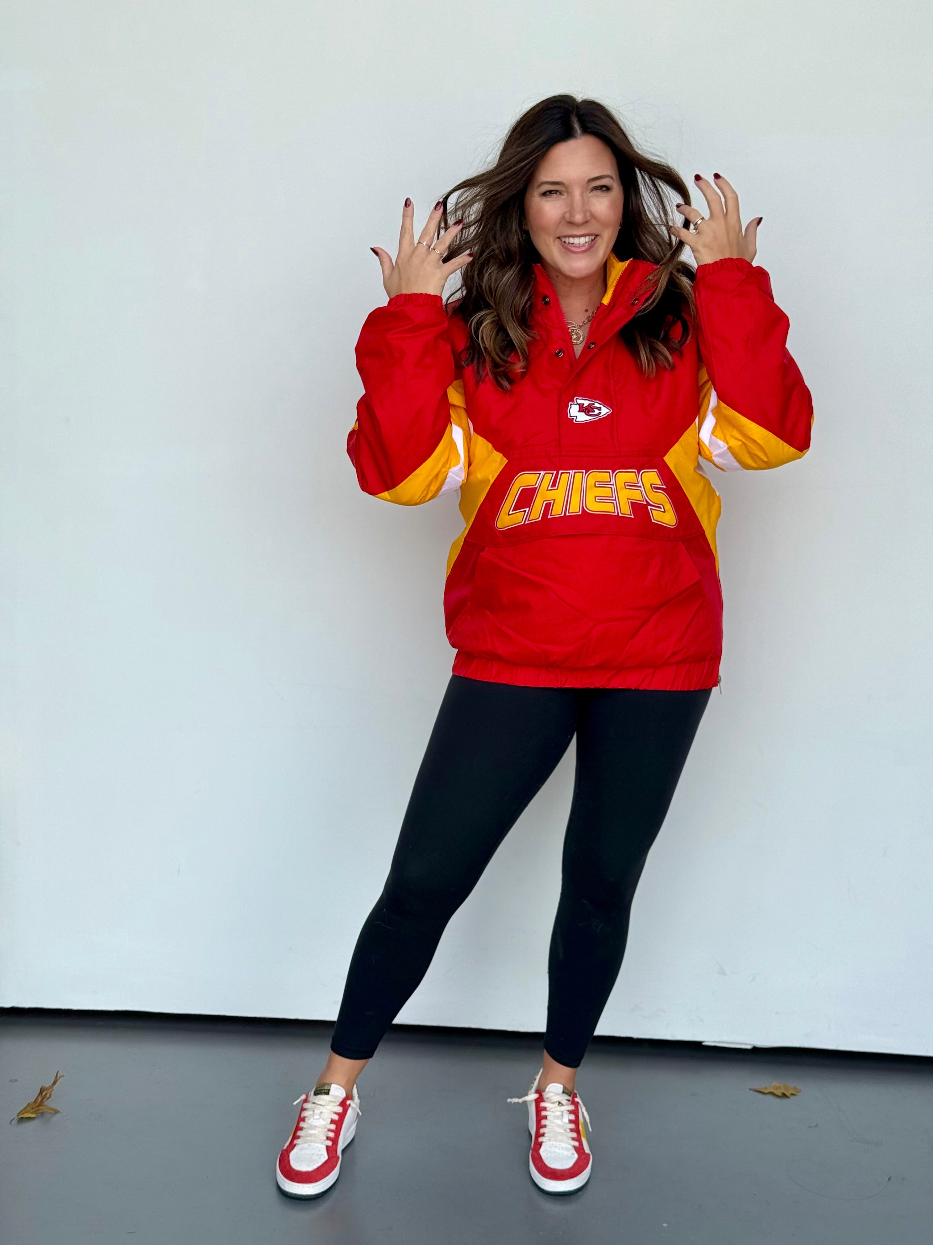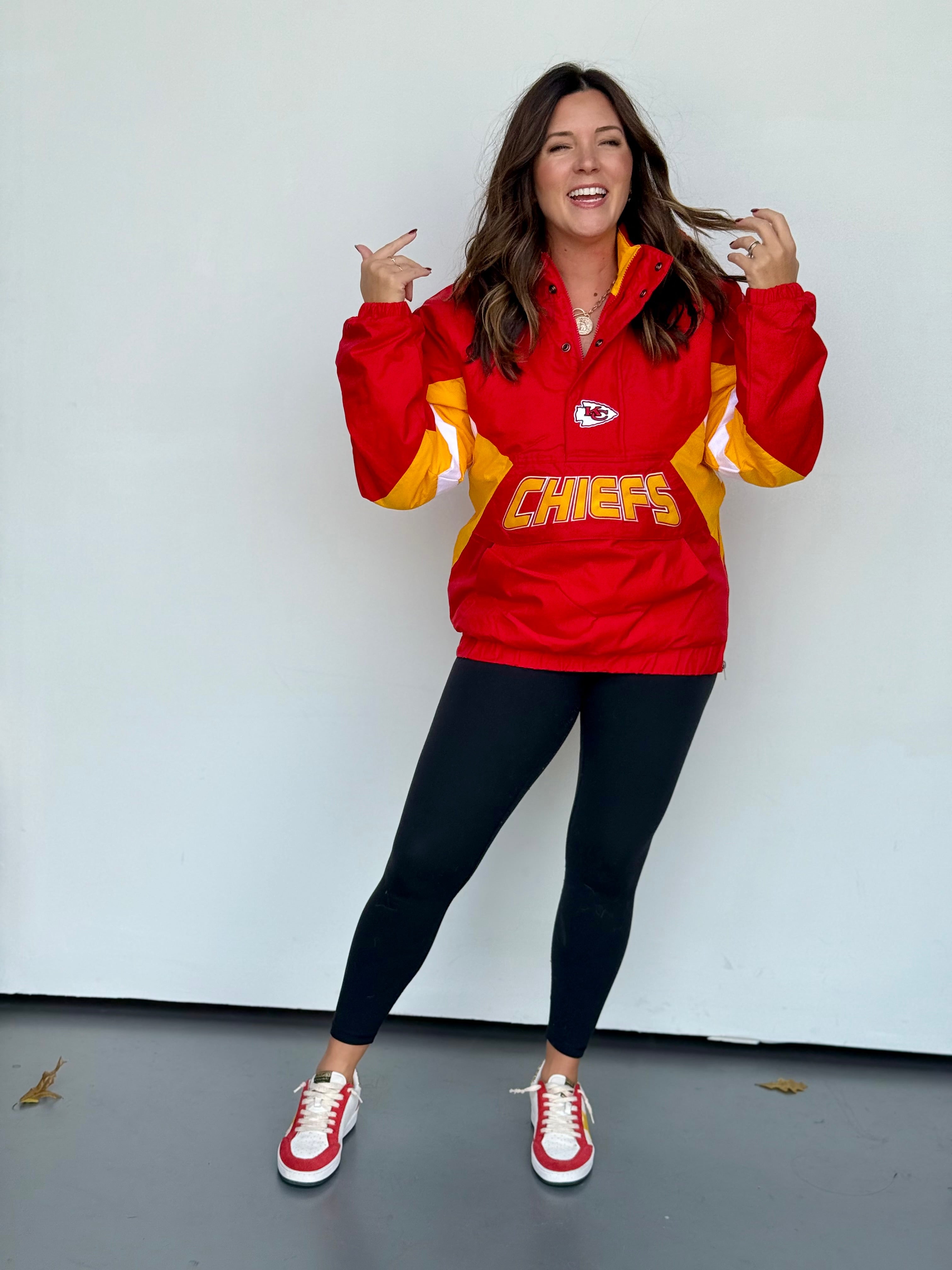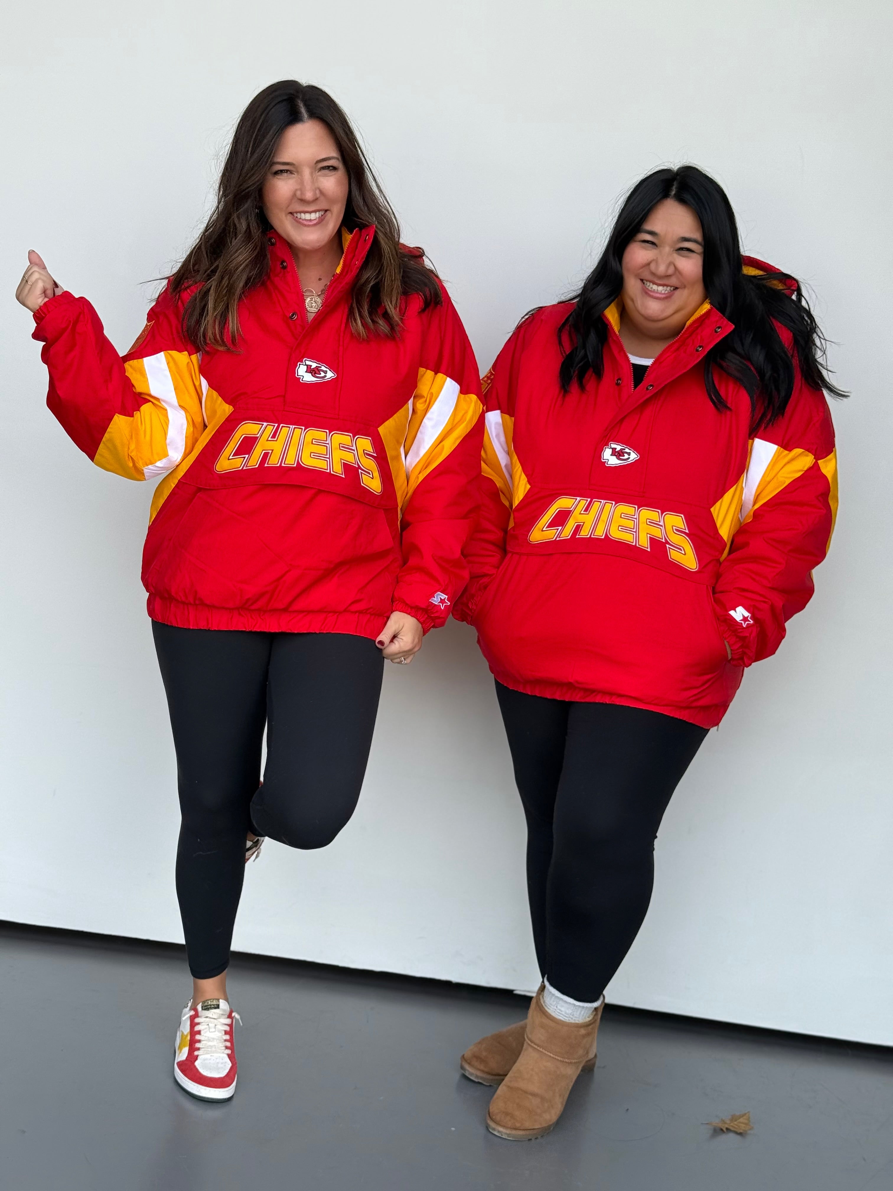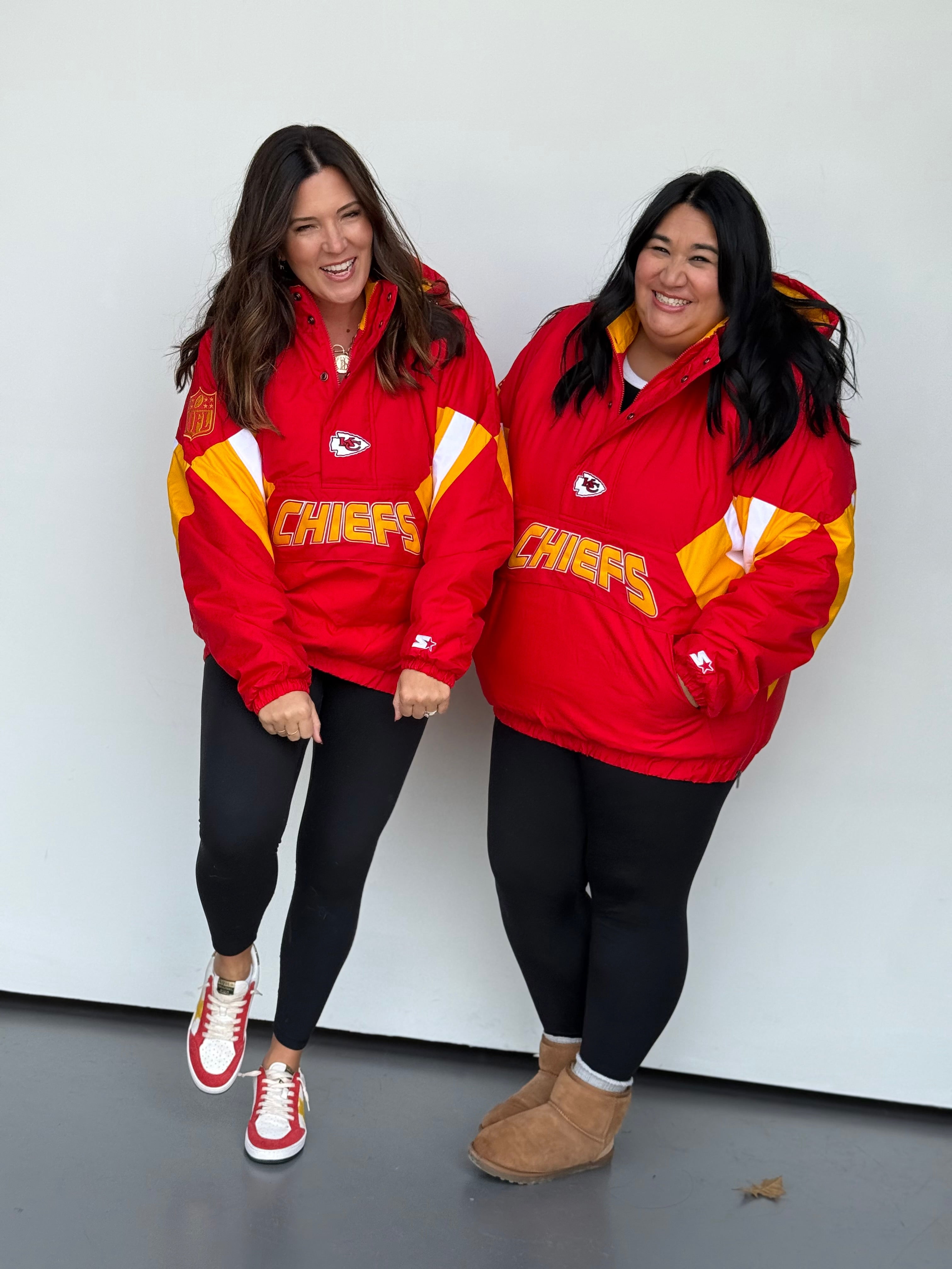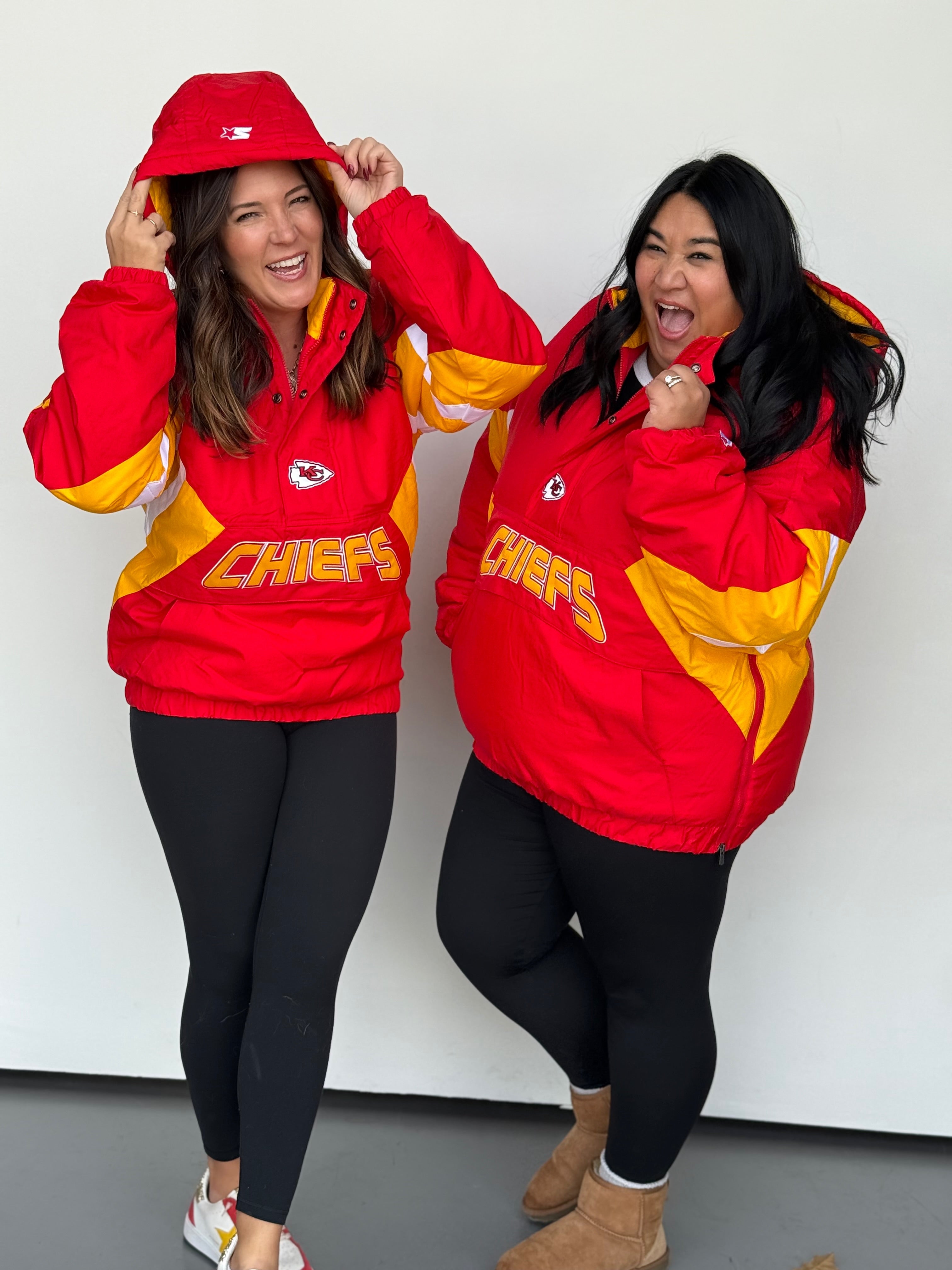 Rock your team spirit in this classic Starter 1/4 zip coat featuring the iconic Chiefs colors. The detachable hood gives you versatility for any game day mood, while functional pockets keep your essentials close. An adjustable hood and elastic waistband ensure a customized fit that moves with you. Also, has a side zipper for added room. Perfect for die-hard fans who want comfort without compromising style. Note: Men's sizing runs generous—consider sizing down if you prefer a snugger fit.