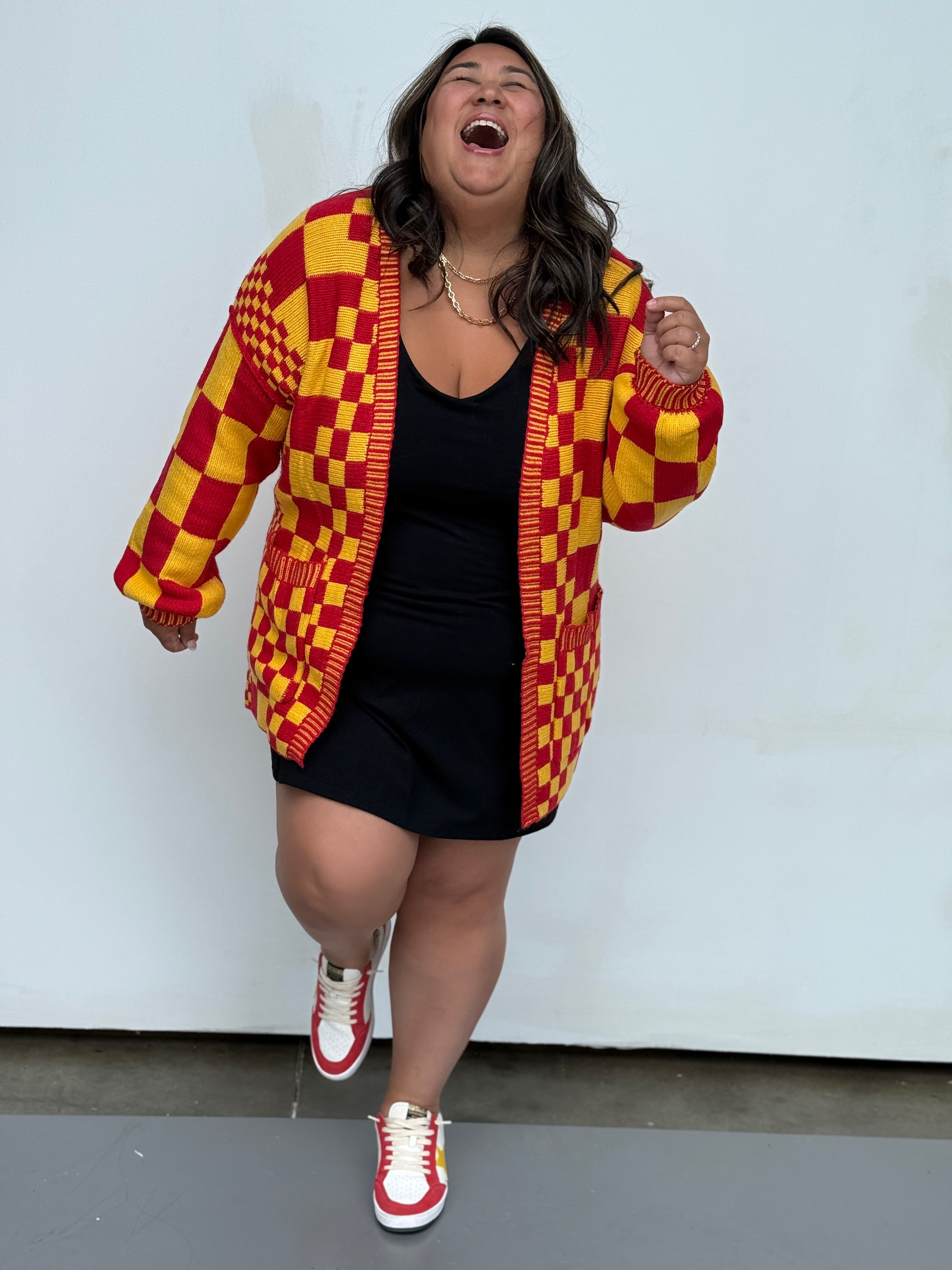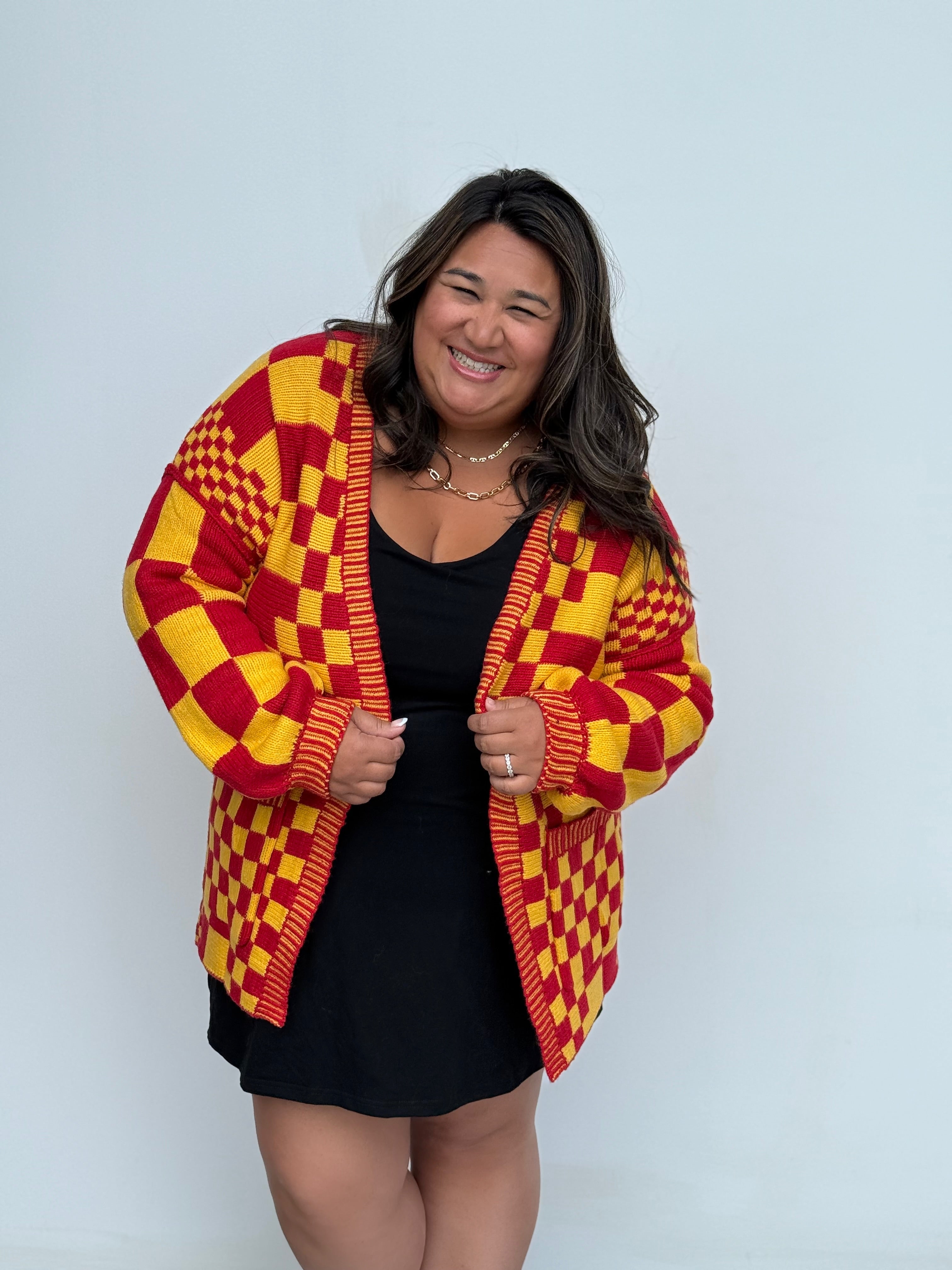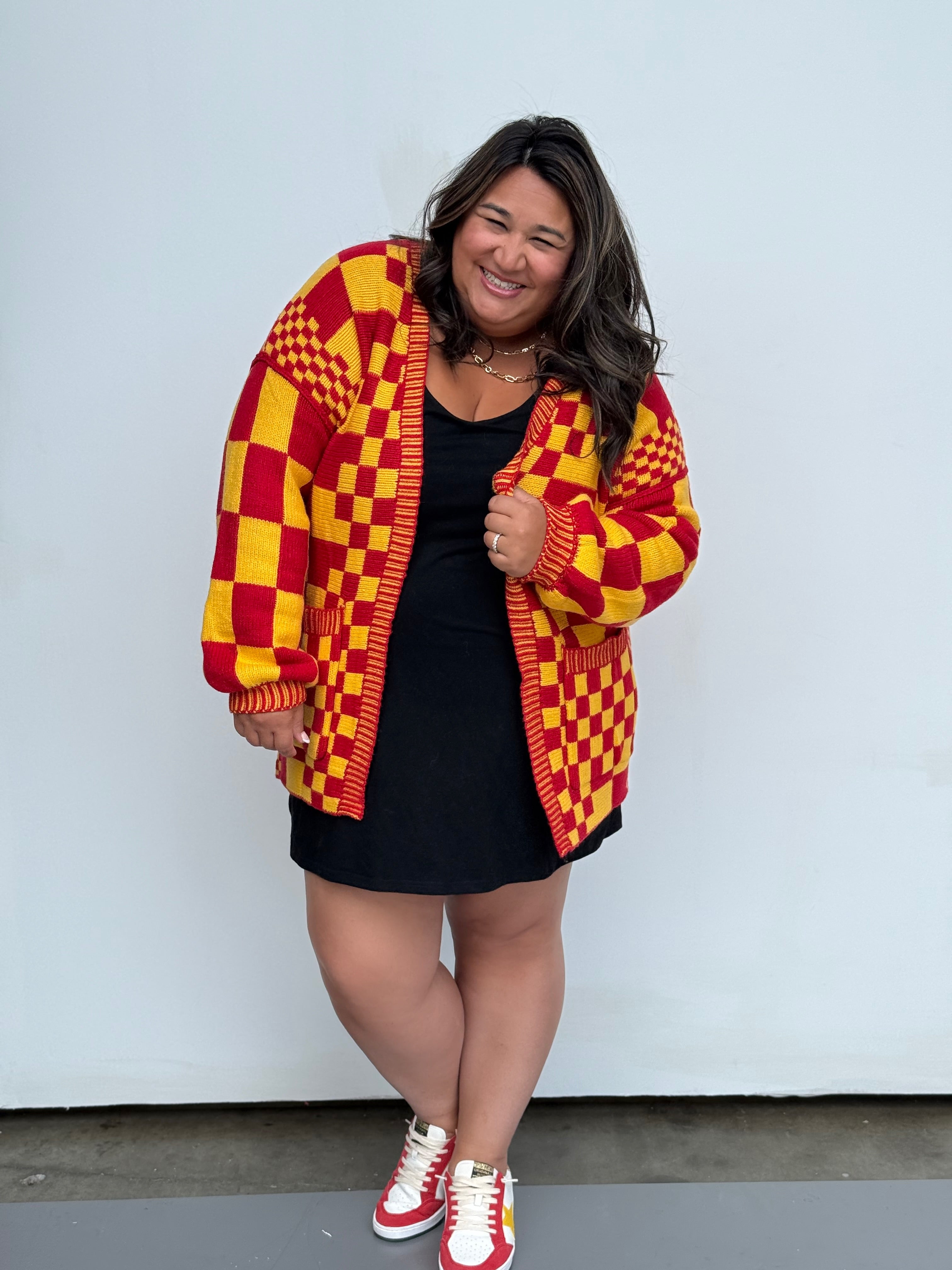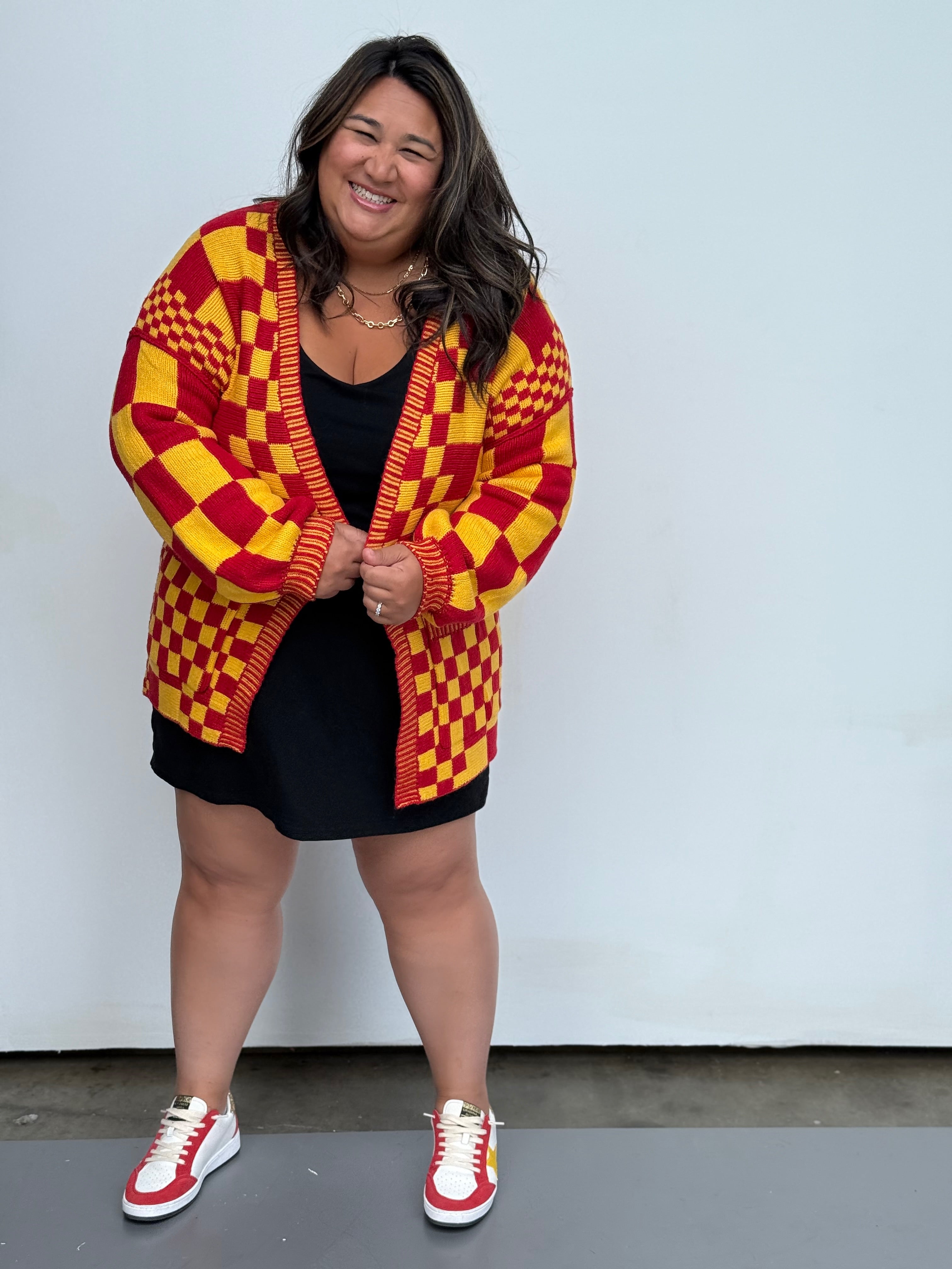 Stay cozy and chic in our oversized Red Checkered Cardigan. This playful piece features a vibrant red and yellow checkered pattern, convenient pockets, and a soft feel. Perfect for adding a pop of color to your outfit while staying warm.  Just in time for football season!