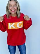 Our signature KC Bar design in a gorgeous vibrant red crewneck sweatshirt! Printed on our fave Bella Canvas drop shoulder sweatshirt, true unisex sizing.