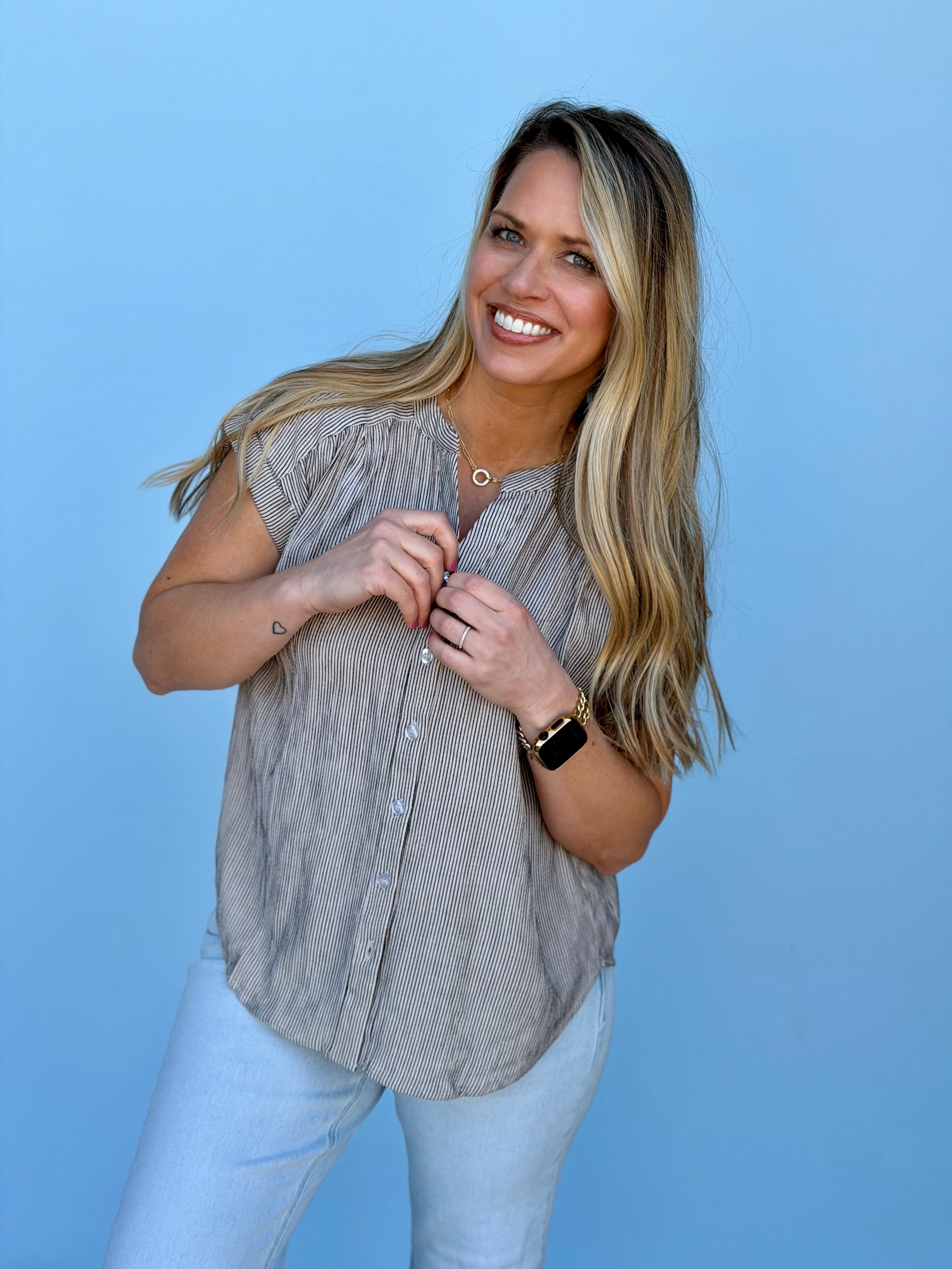 Crisp pinstripe button-down with a refined cuff sleeve design that transitions seamlessly from office to weekend wear. Lightweight fabric keeps you comfortable throughout the day, while the tailored fit runs true to size for an effortless, polished look. Perfect for layering or wearing solo.