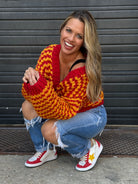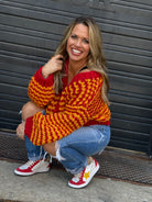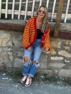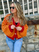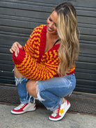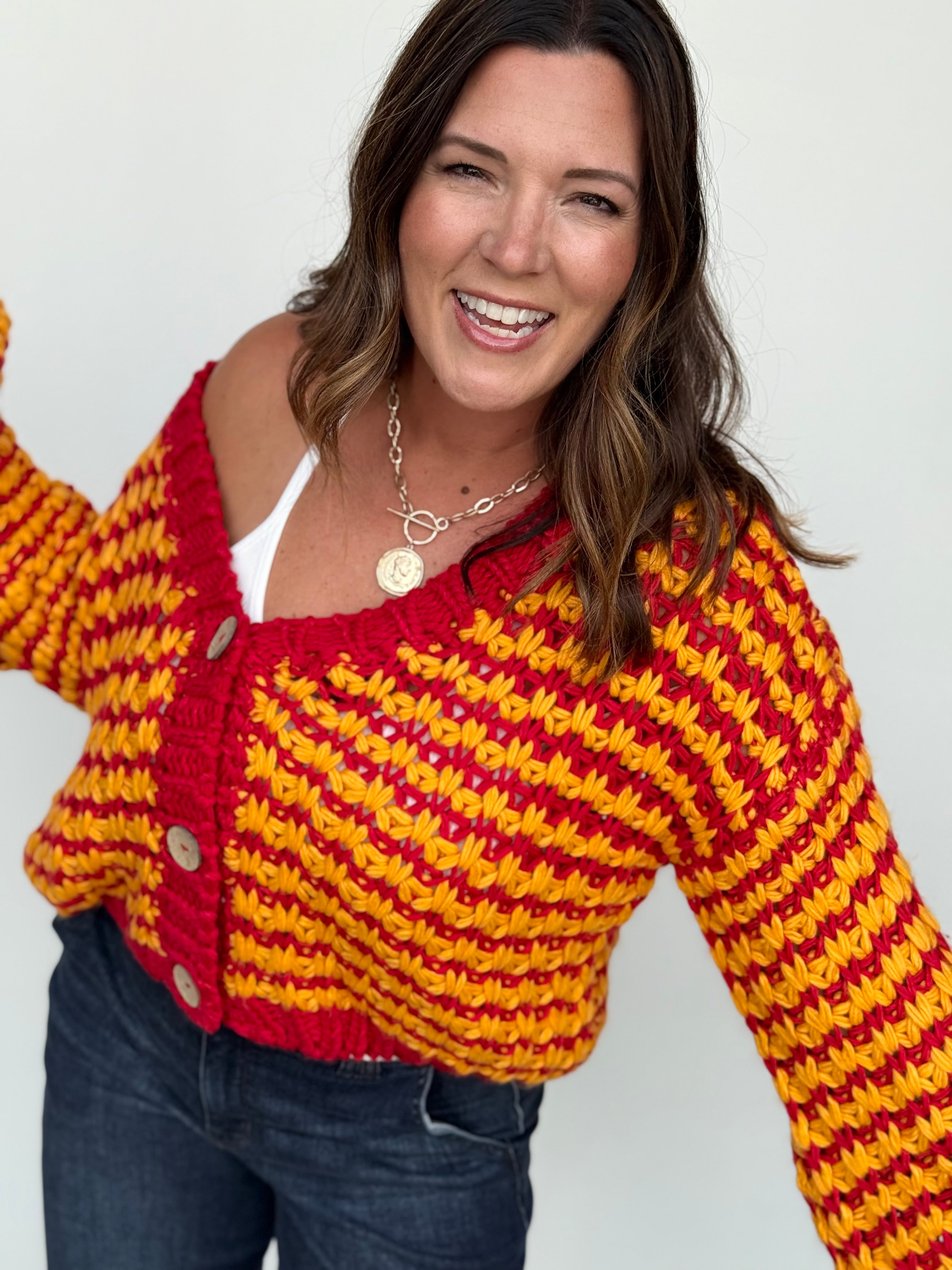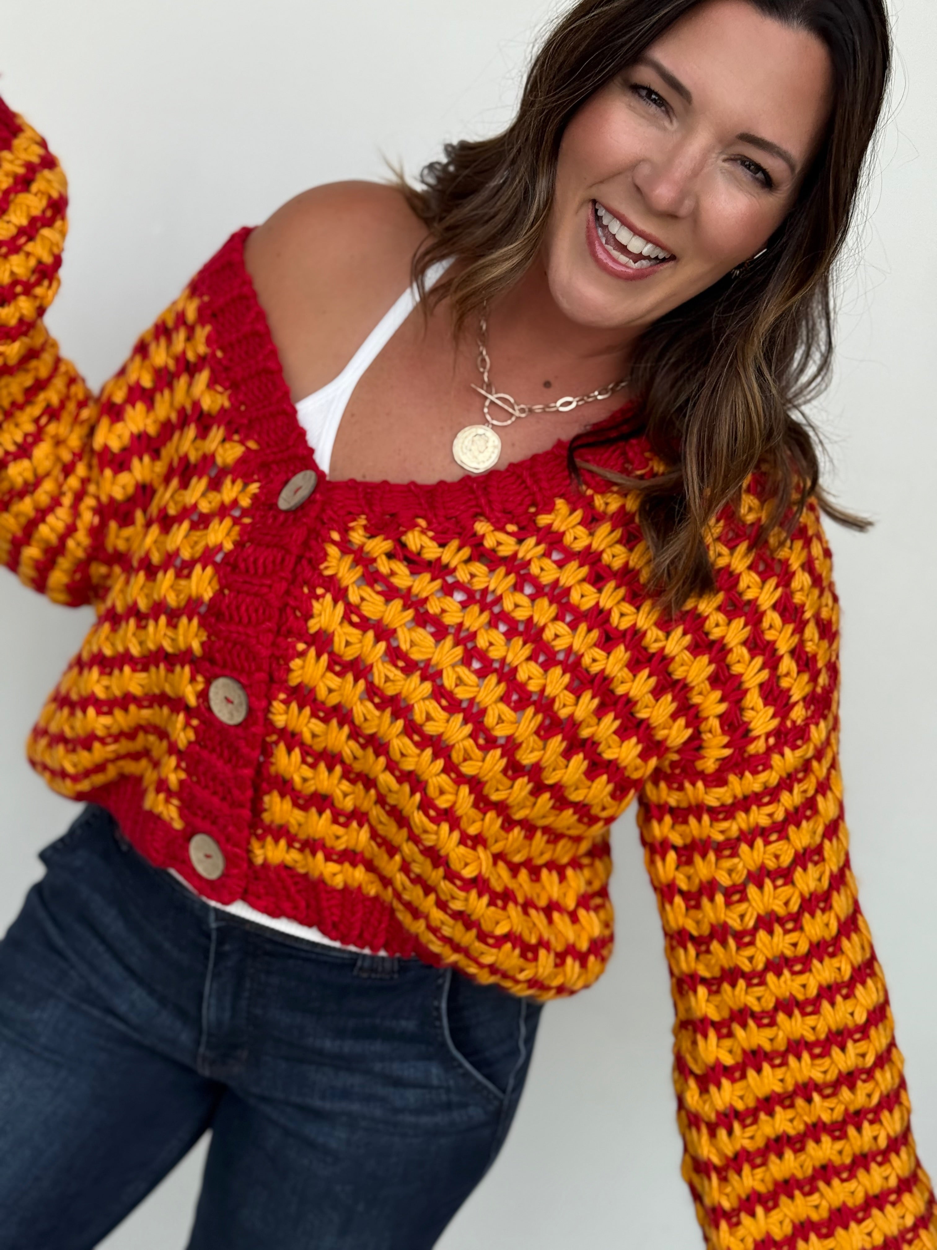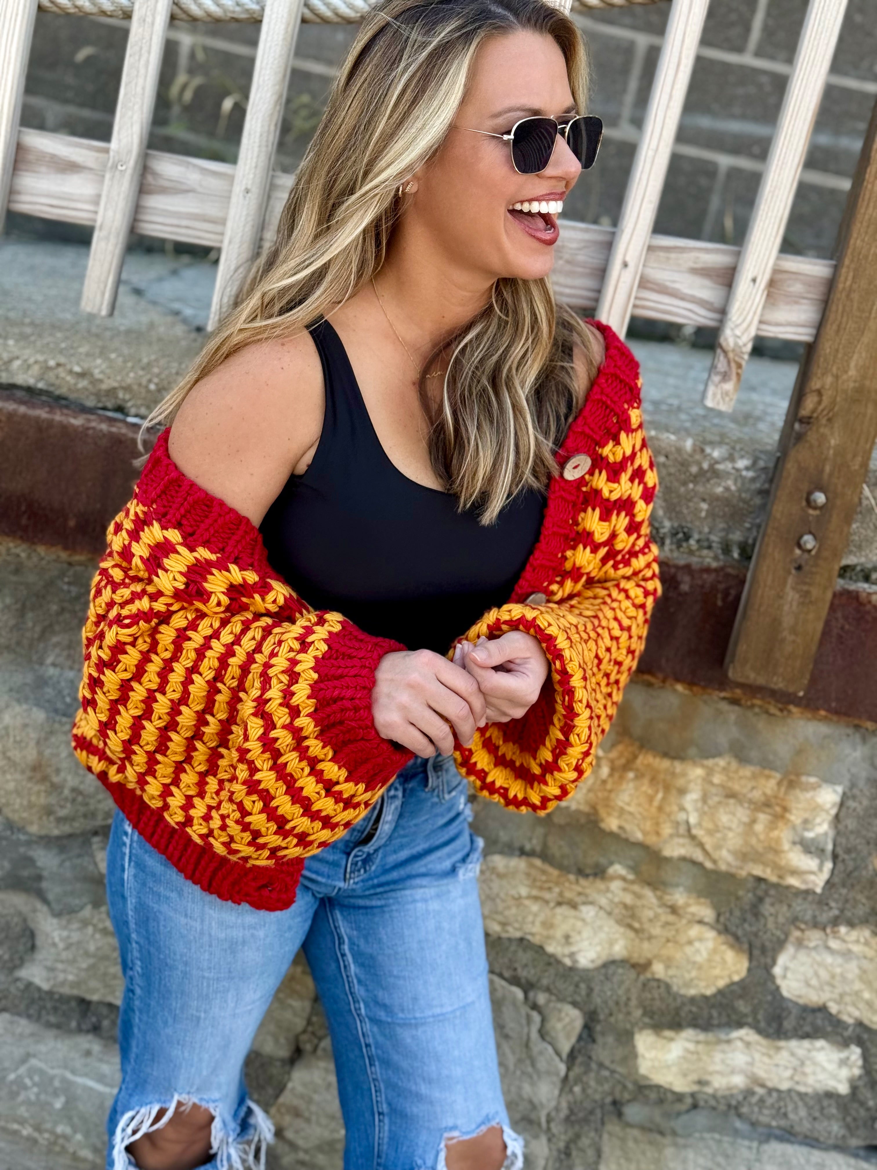 Get cozy in the Huddle Up Chunky Knit Cardigan. Made of soft knit material, this cardigan is perfect for chilly days. Its bold red and yellow color combo will add a playful pop of color to any outfit. Plus, with its button up design, you can easily layer it over your favorite tops. (Game on!)
