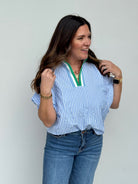 This light blue stripe top brings a playful twist to your wardrobe with its bold striped V-neck collar and oversized fit. Crafted to be lightweight, it offers effortless comfort and a breezy feel, perfect for casual days when you want to stand out with subtle style.